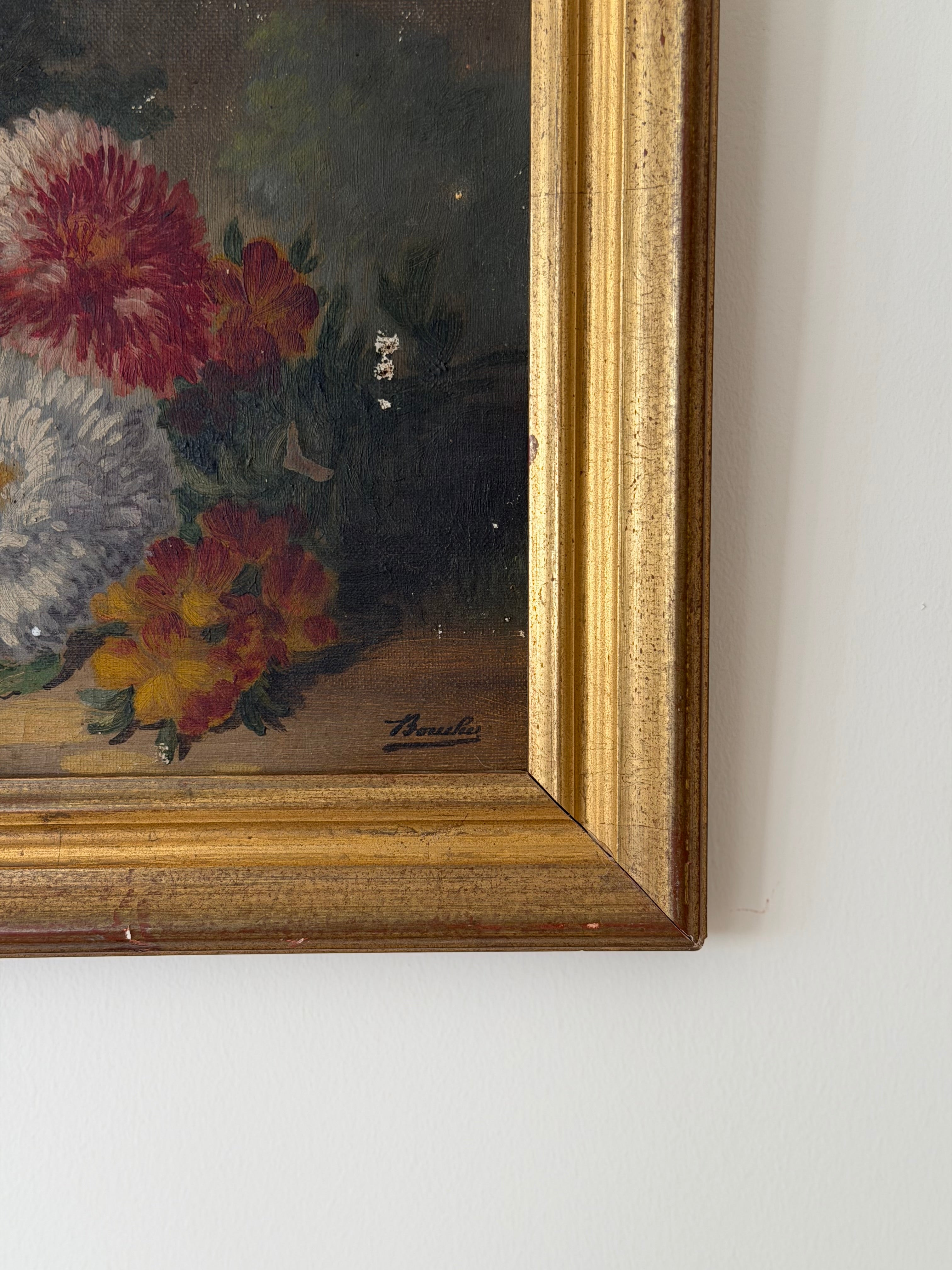 An antique still life of chrysanthemums in soft white, pale blush, and warm yellow tones, with touches of deep red anchoring the composition. The darker background gives it a subtle moody contrast, while the lighter blooms bring an easy brightness to the piece.
