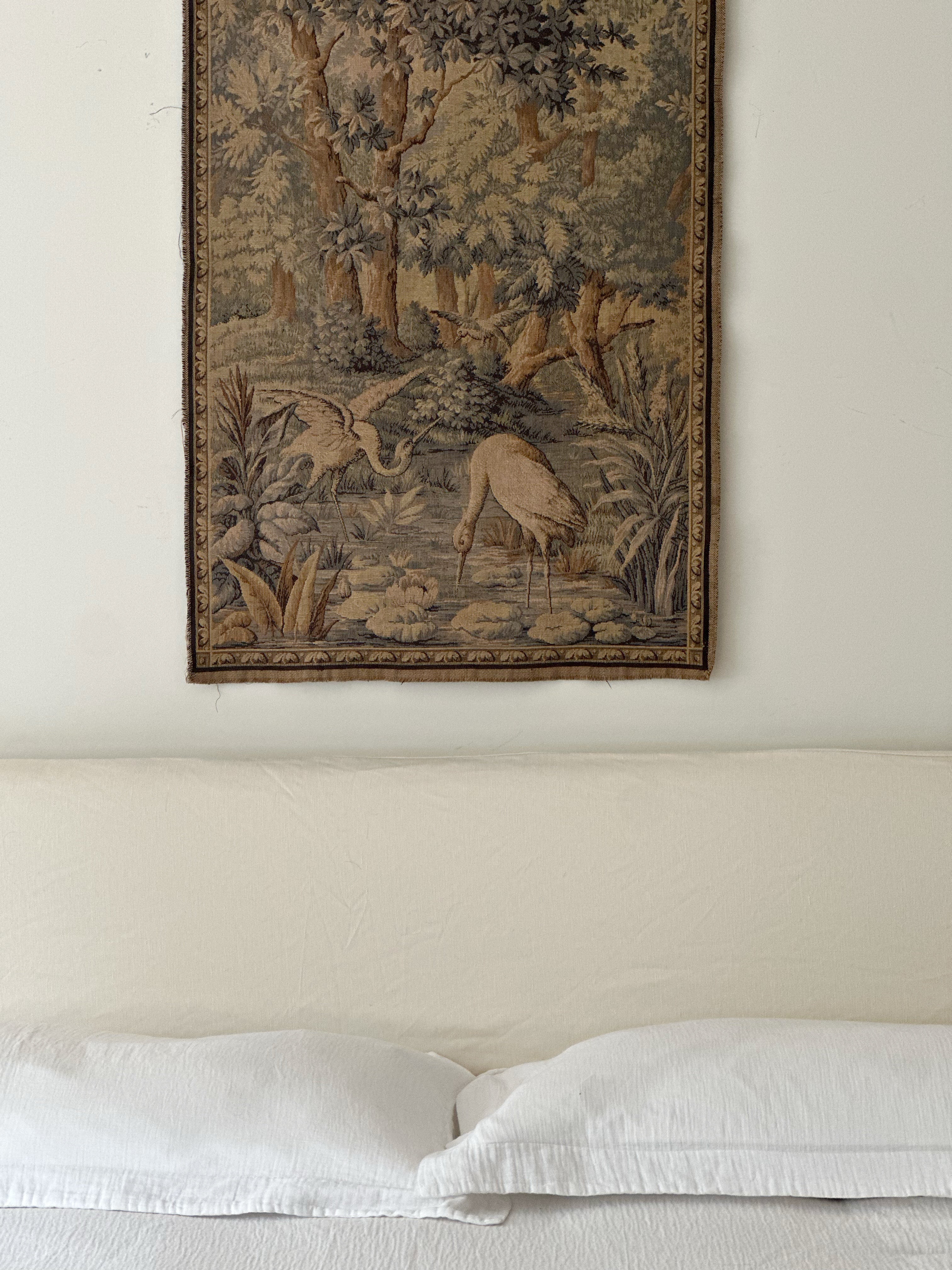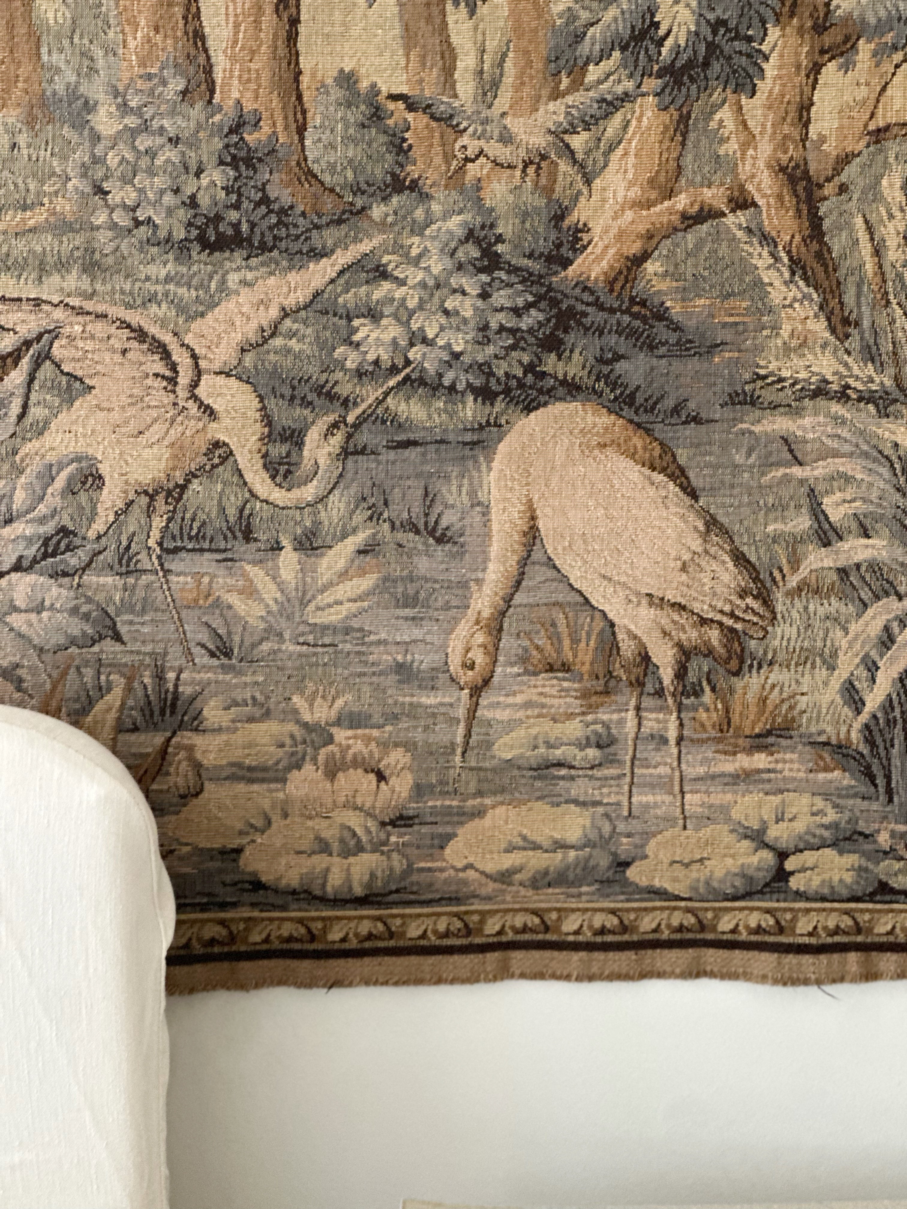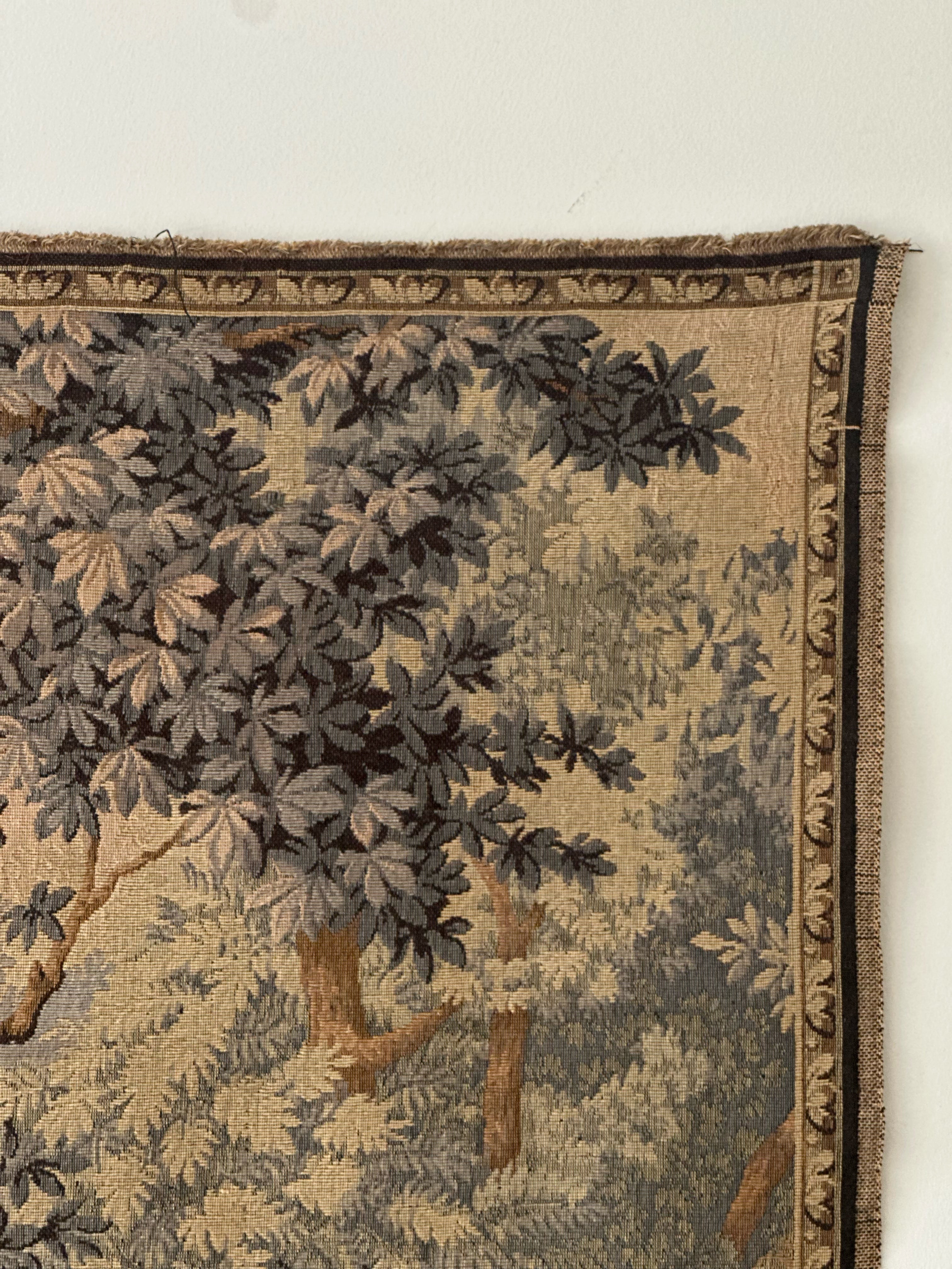 Early 20th century French verdure tapestry, depicting a lush landscape with birds wading in a stream in the foreground. Retains its original tapestry border and is signed “France” on the back. Rare to find in such soft, neutral tones and in this smaller 25" x 38" size --perfect for a cozy corner or for adding just the right touch of tapestry to a space. Its understated palette makes it especially versatile, bringing texture and earthy warmth without overpowering a room.