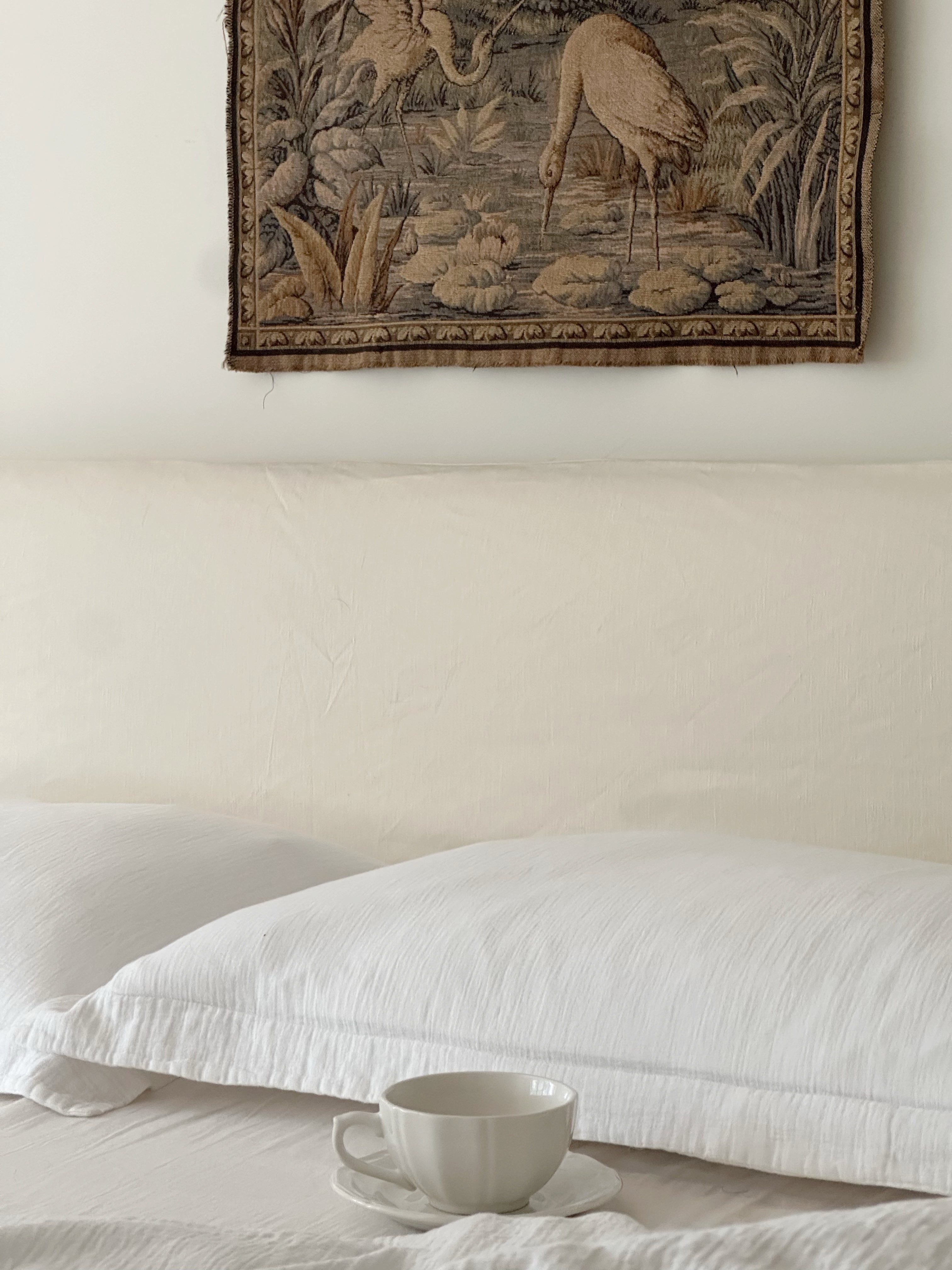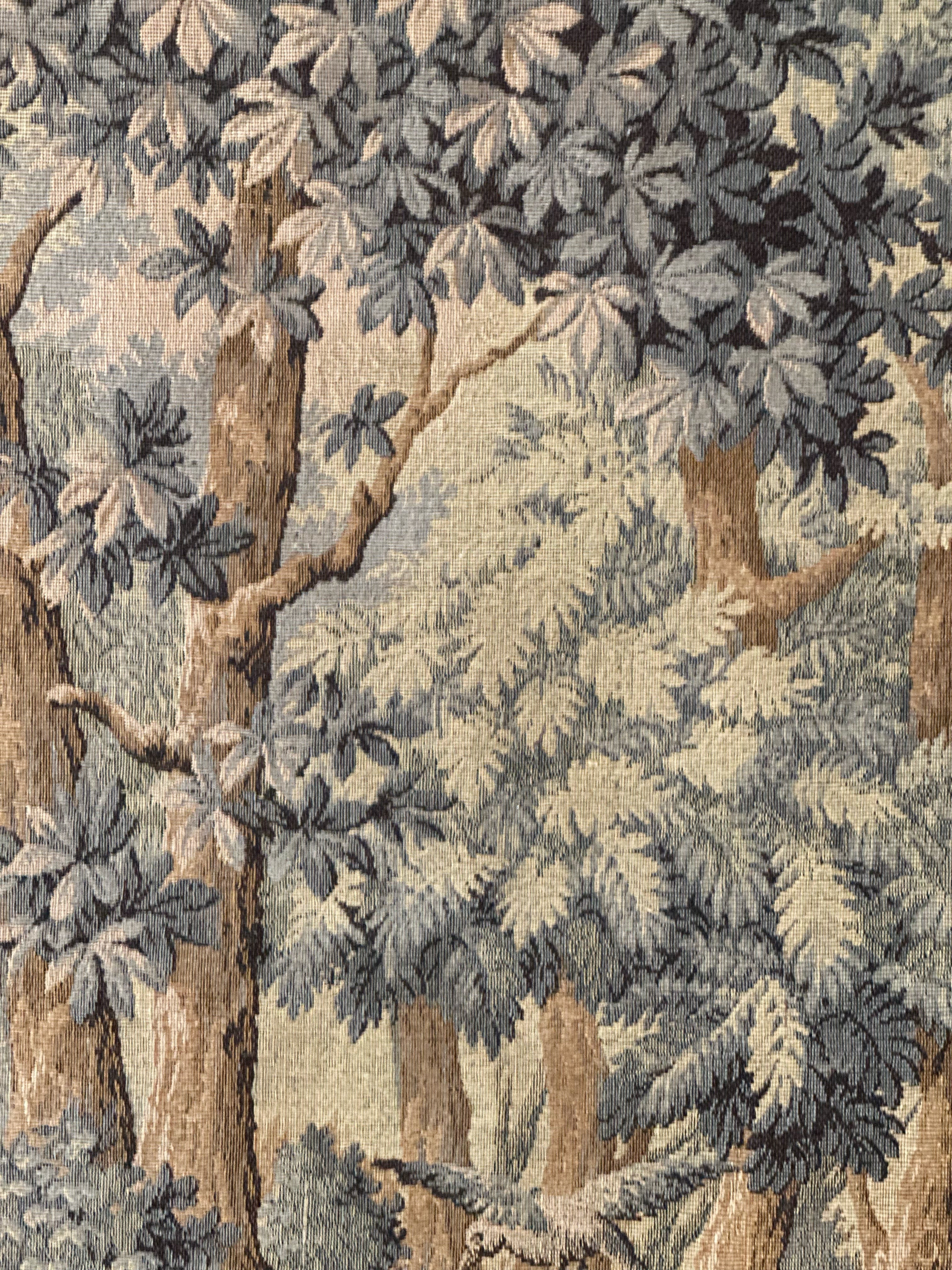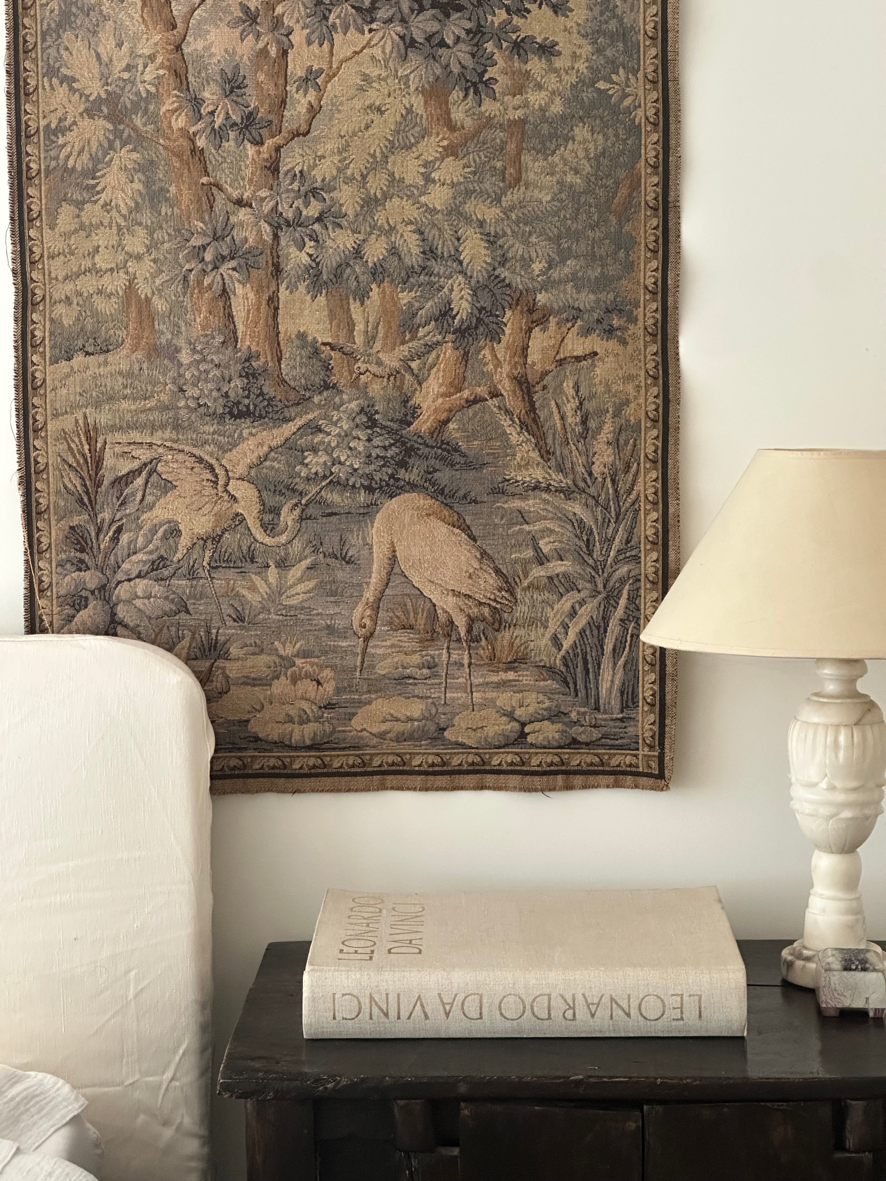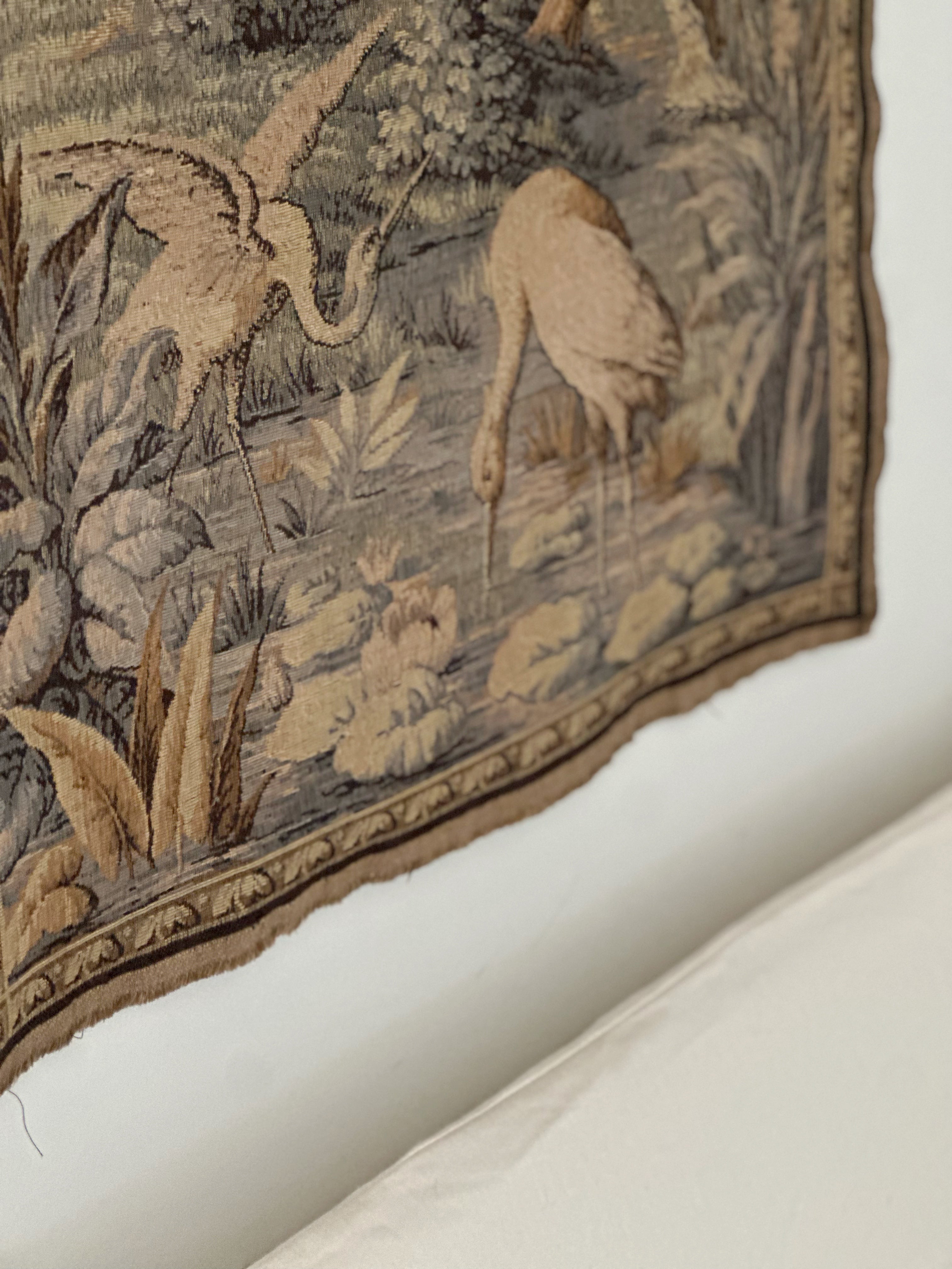 Early 20th century French verdure tapestry, depicting a lush landscape with birds wading in a stream in the foreground. Retains its original tapestry border and is signed “France” on the back. Rare to find in such soft, neutral tones and in this smaller 25" x 38" size --perfect for a cozy corner or for adding just the right touch of tapestry to a space. Its understated palette makes it especially versatile, bringing texture and earthy warmth without overpowering a room.