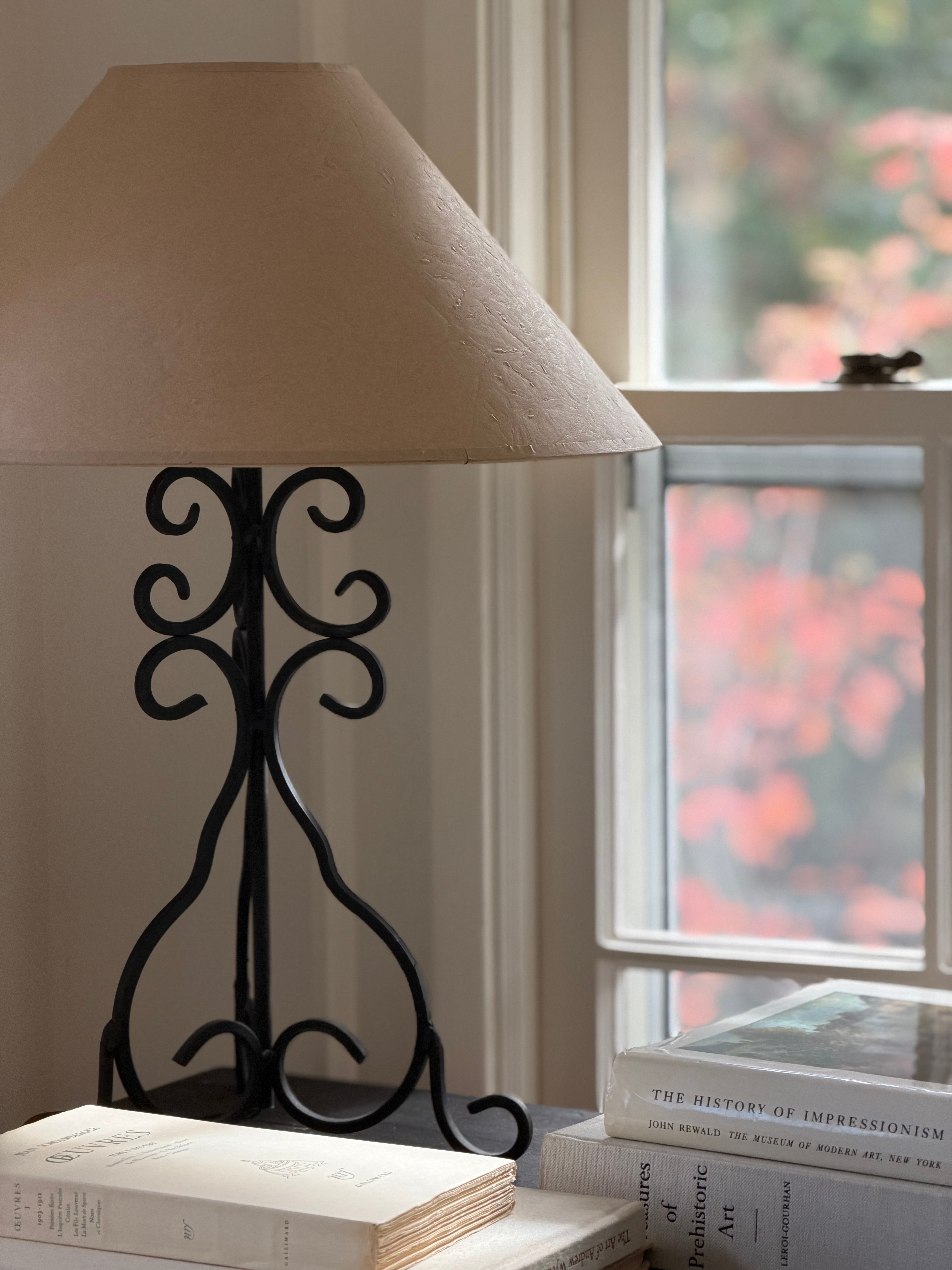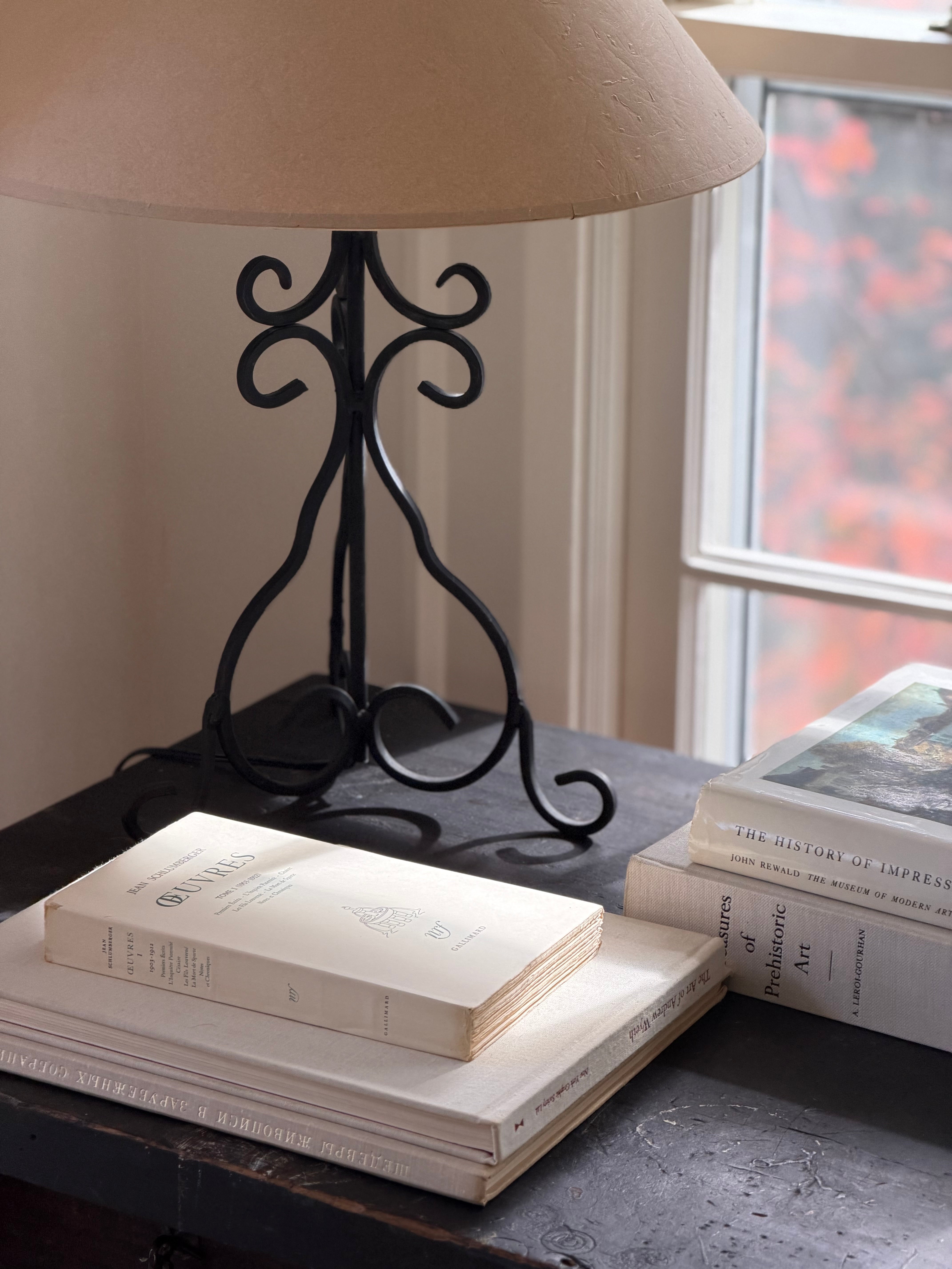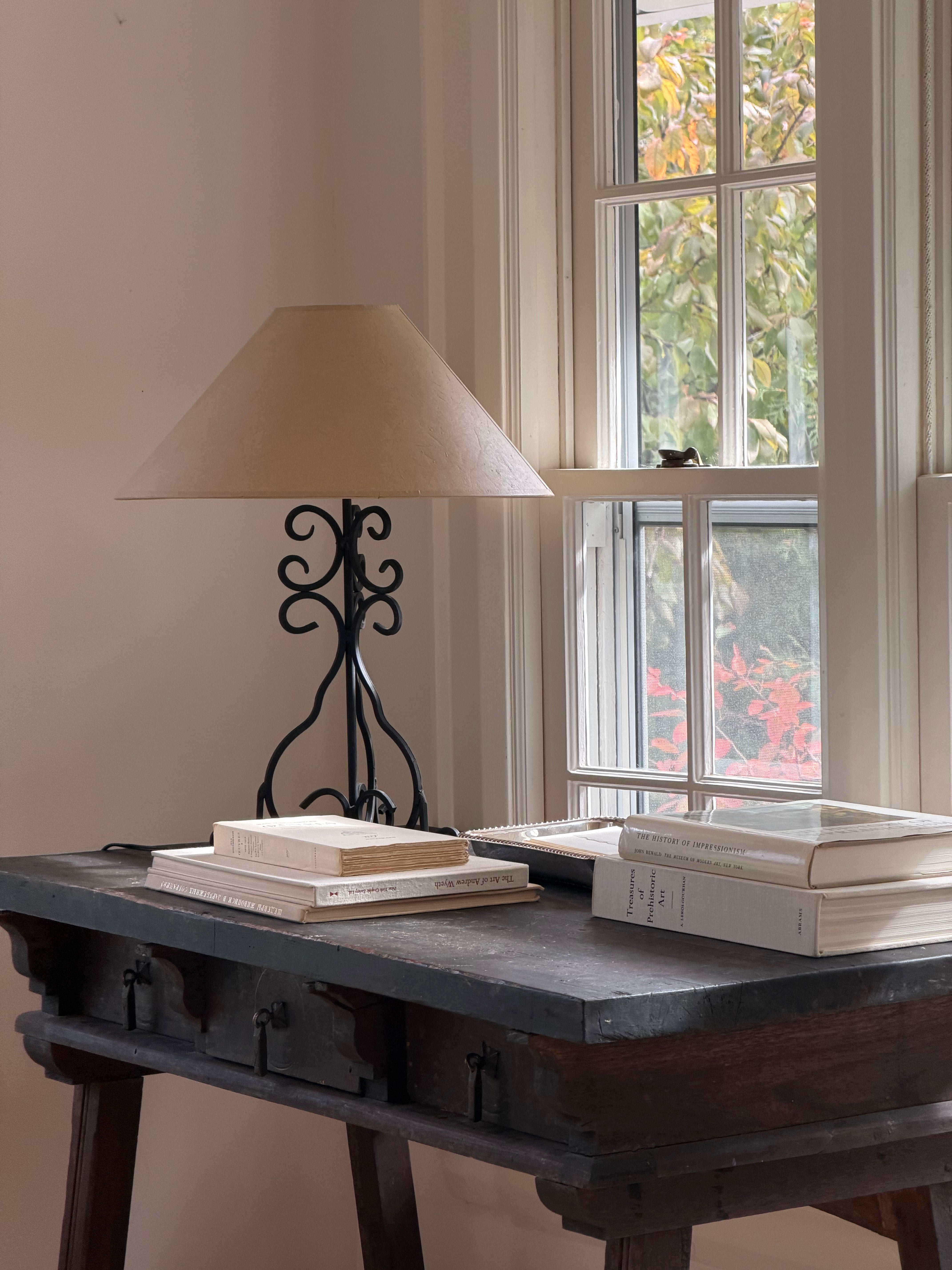The iron base carries subtle irregularities that speak to its handmade nature, while the simple shade offers a warm, grounded light. Beautiful beside a vintage stack of books or on a small writing table -- a piece that feels collected, timeless, and softly lived-in.