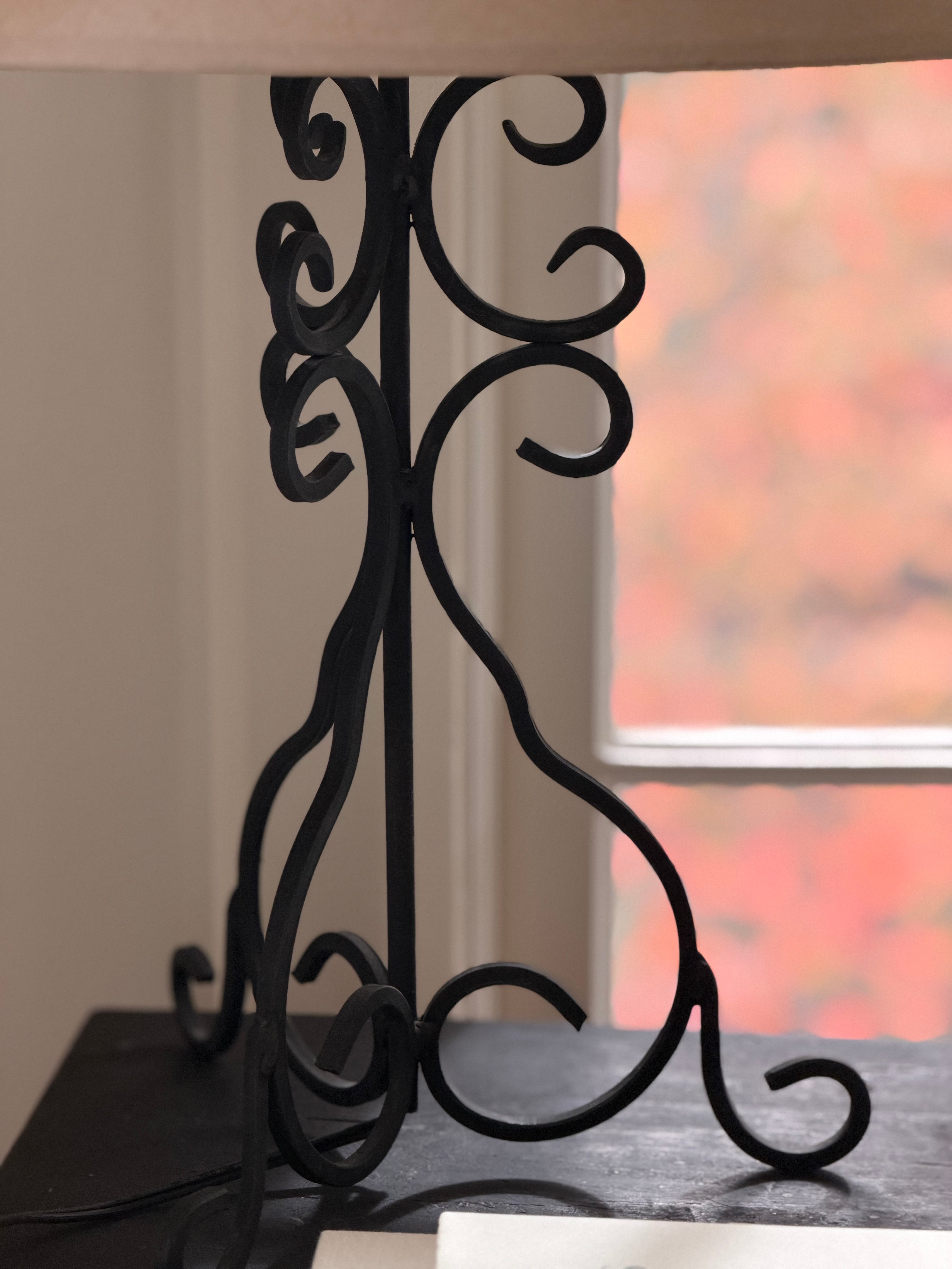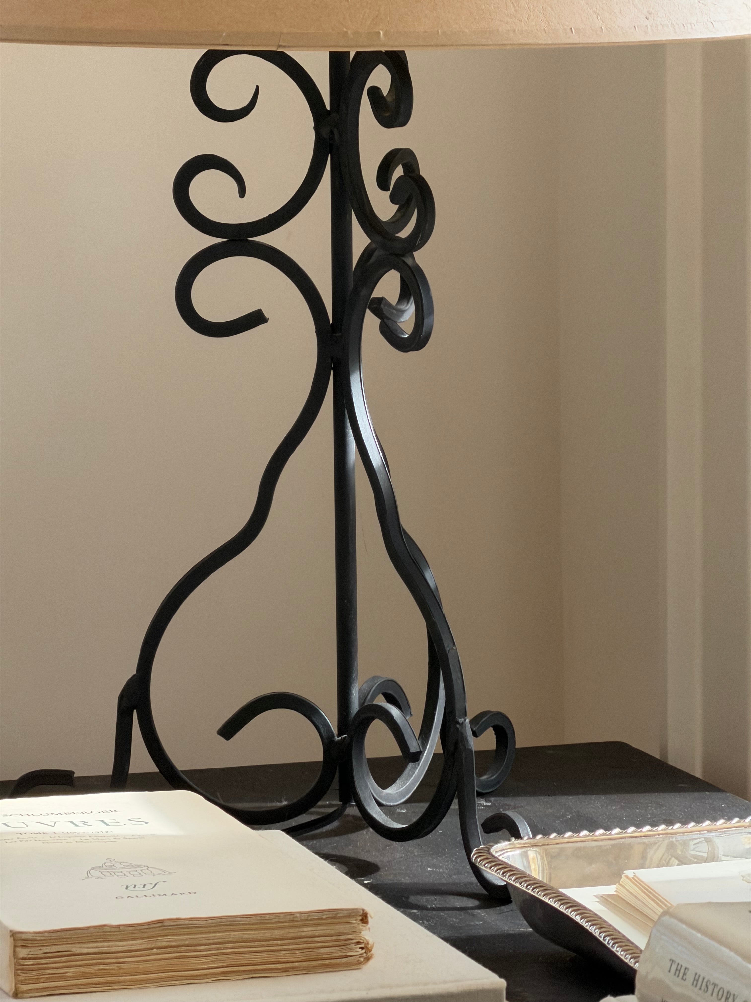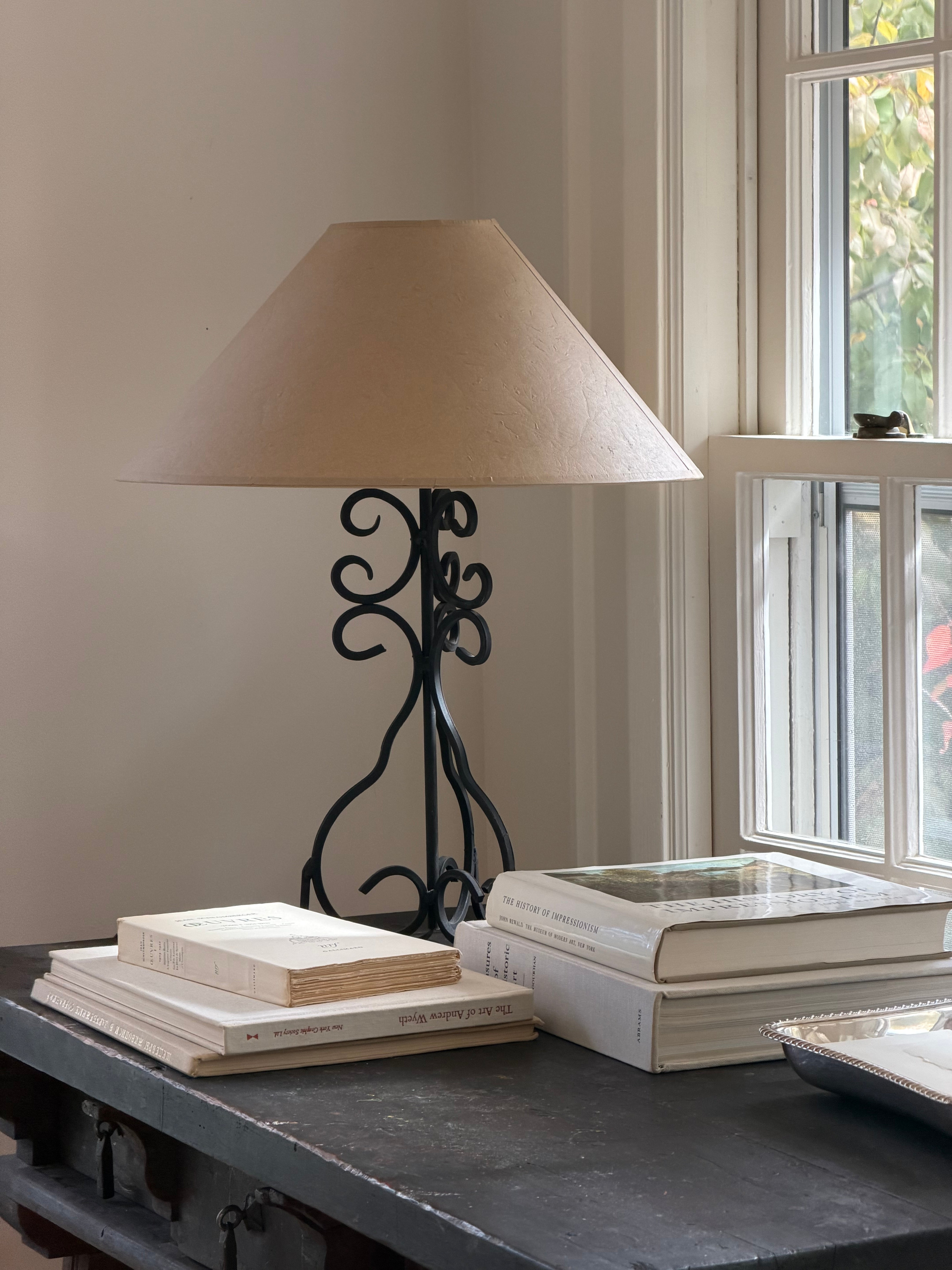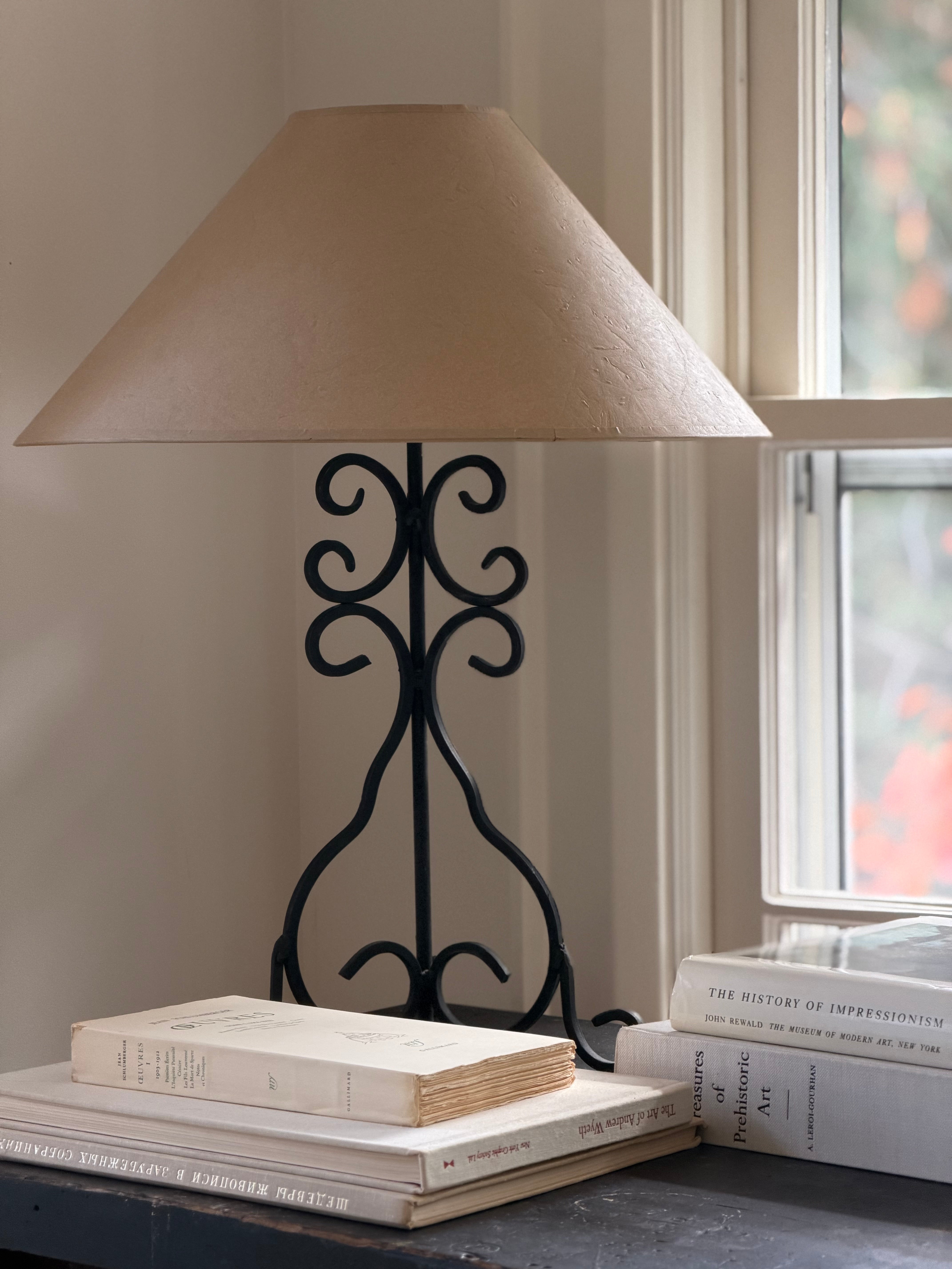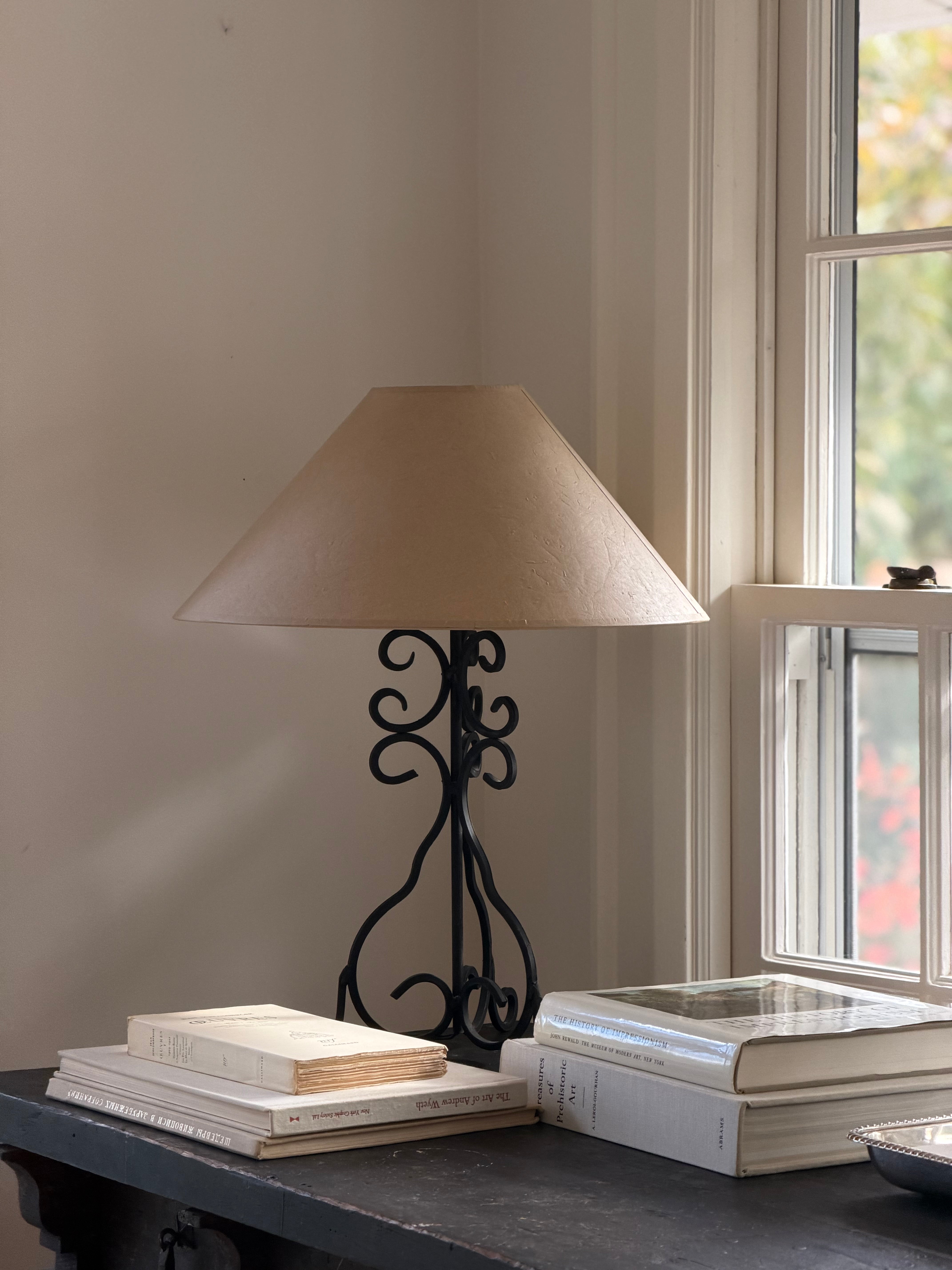 A vintage wrought iron table lamp with soft, hand-forged curves and a sweet parchment-toned shade. Its shape recalls the charm of French Provincial ironwork - sculptural yet understated, with the quiet presence of something crafted, not made.
