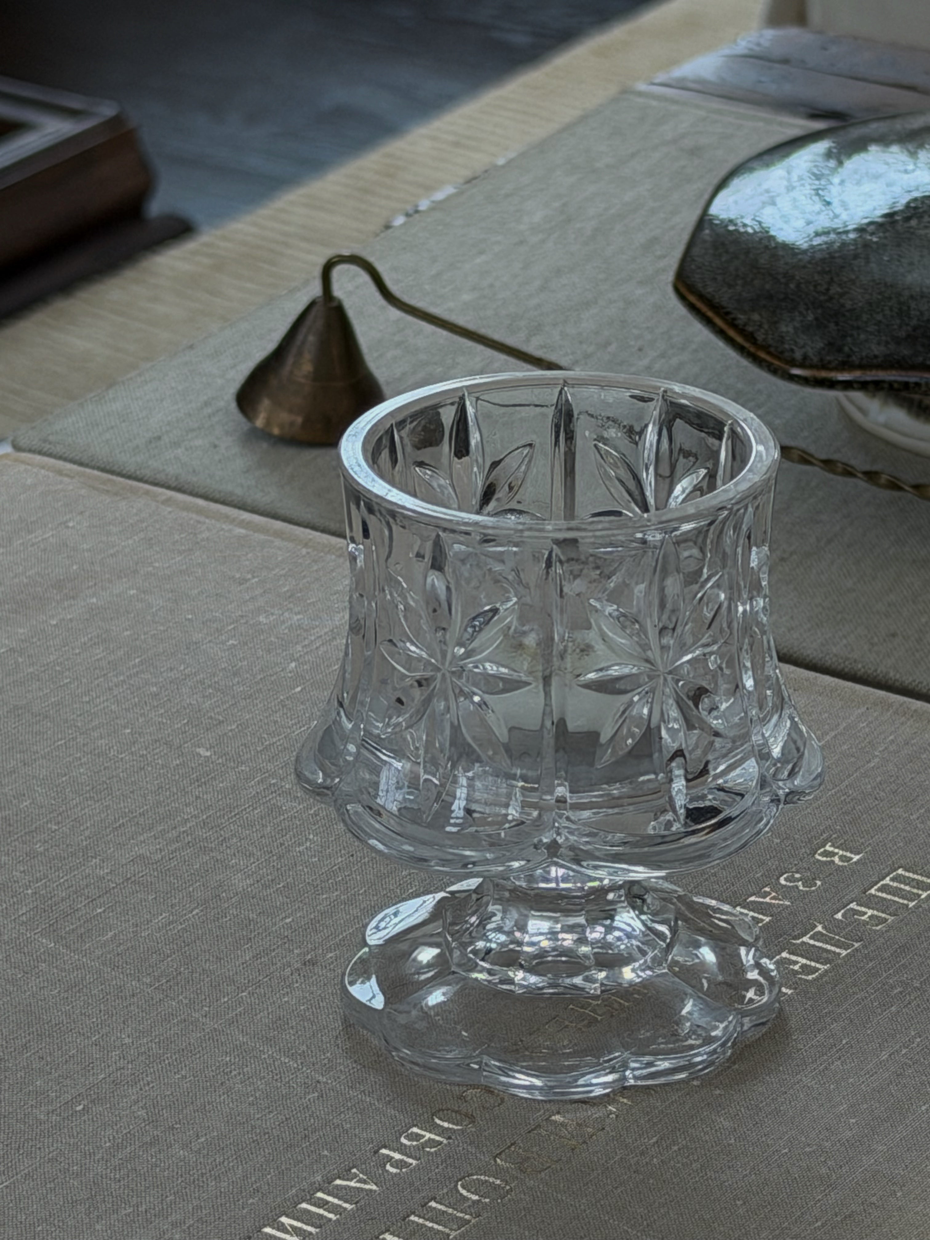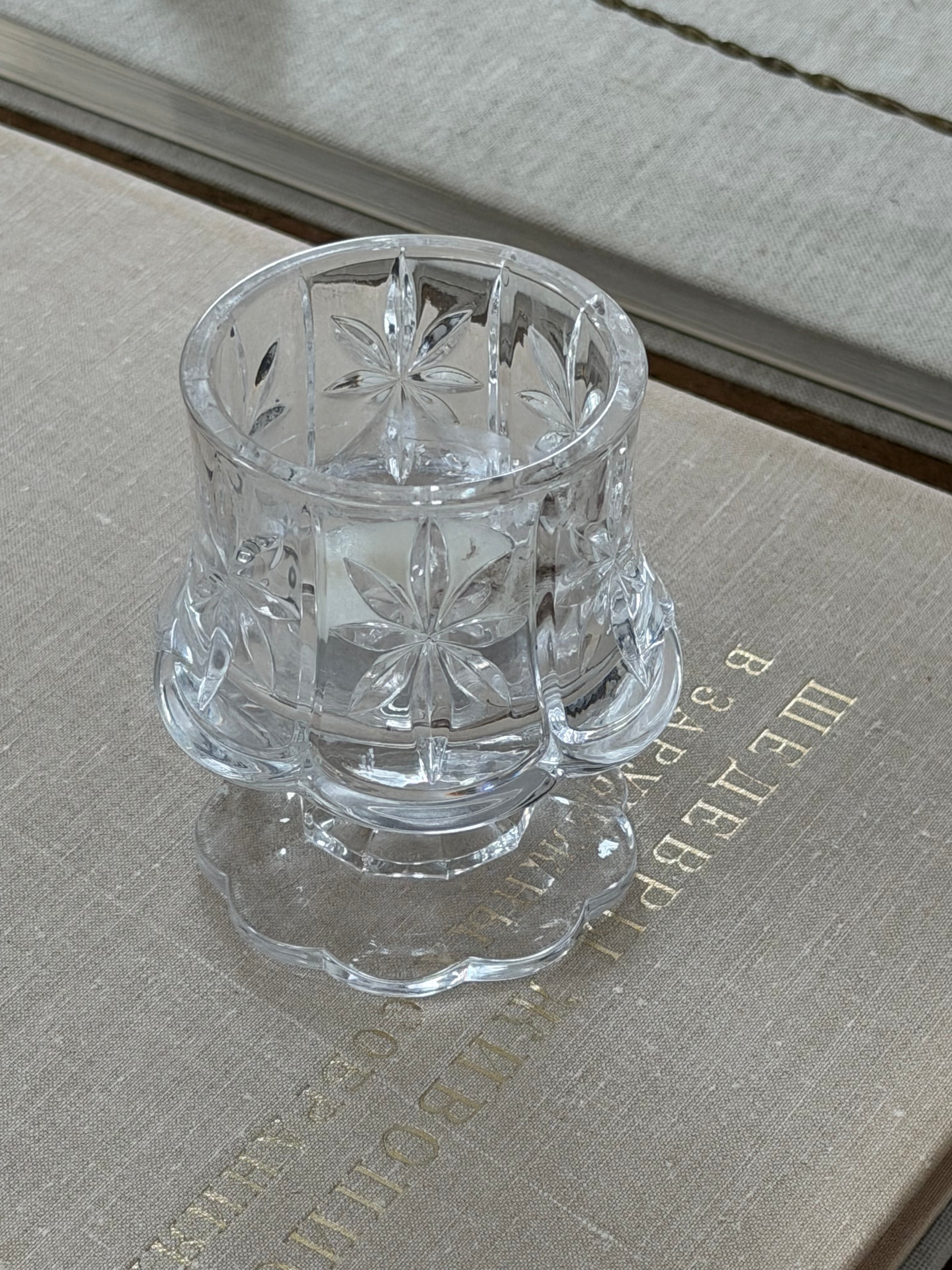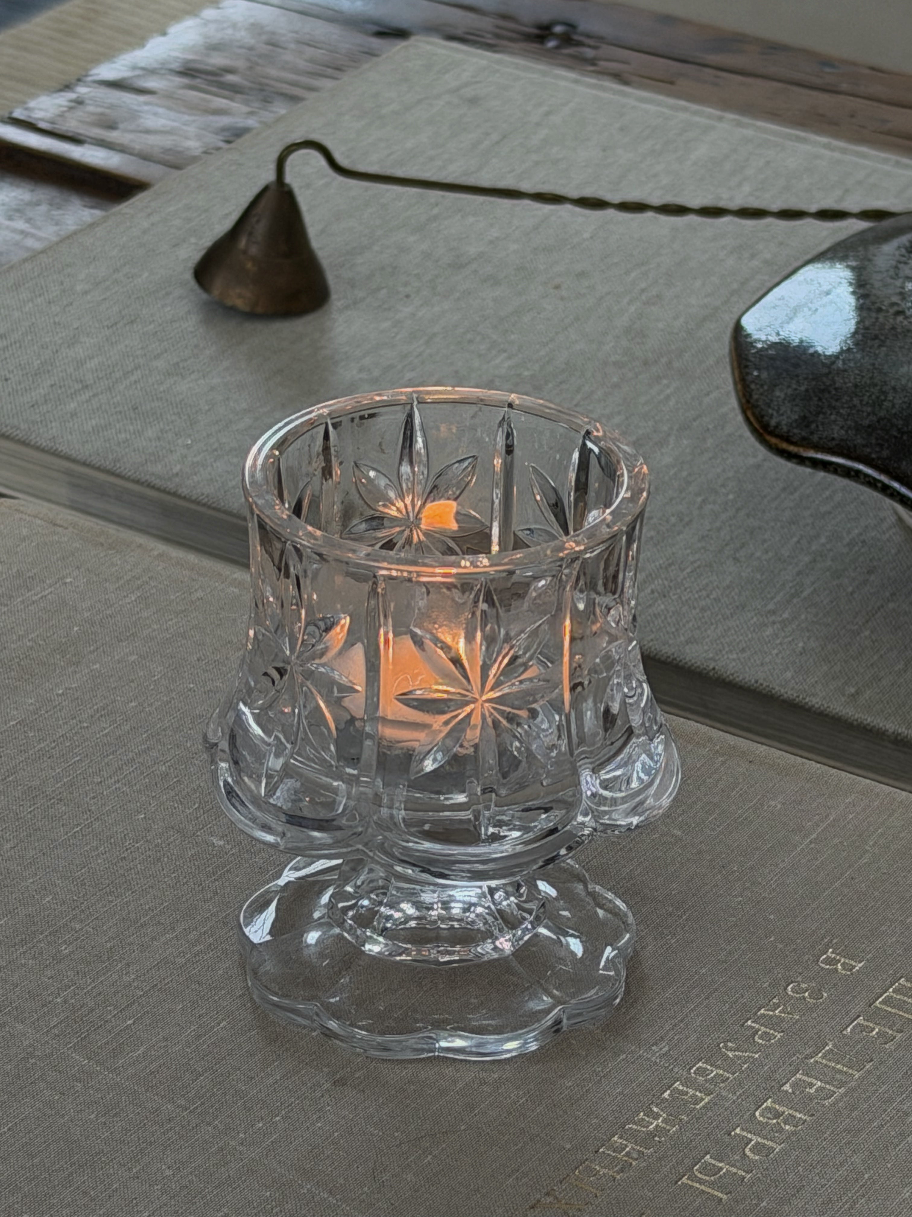 A petite vintage pressed glass candleholder with a soft motif and pedestal base. Its lamp-shaped silhouette and delicate scale make it especially charming on a bedside table, bath ledge, or layered into an evening tablescape. Holds a votive or small tealight.