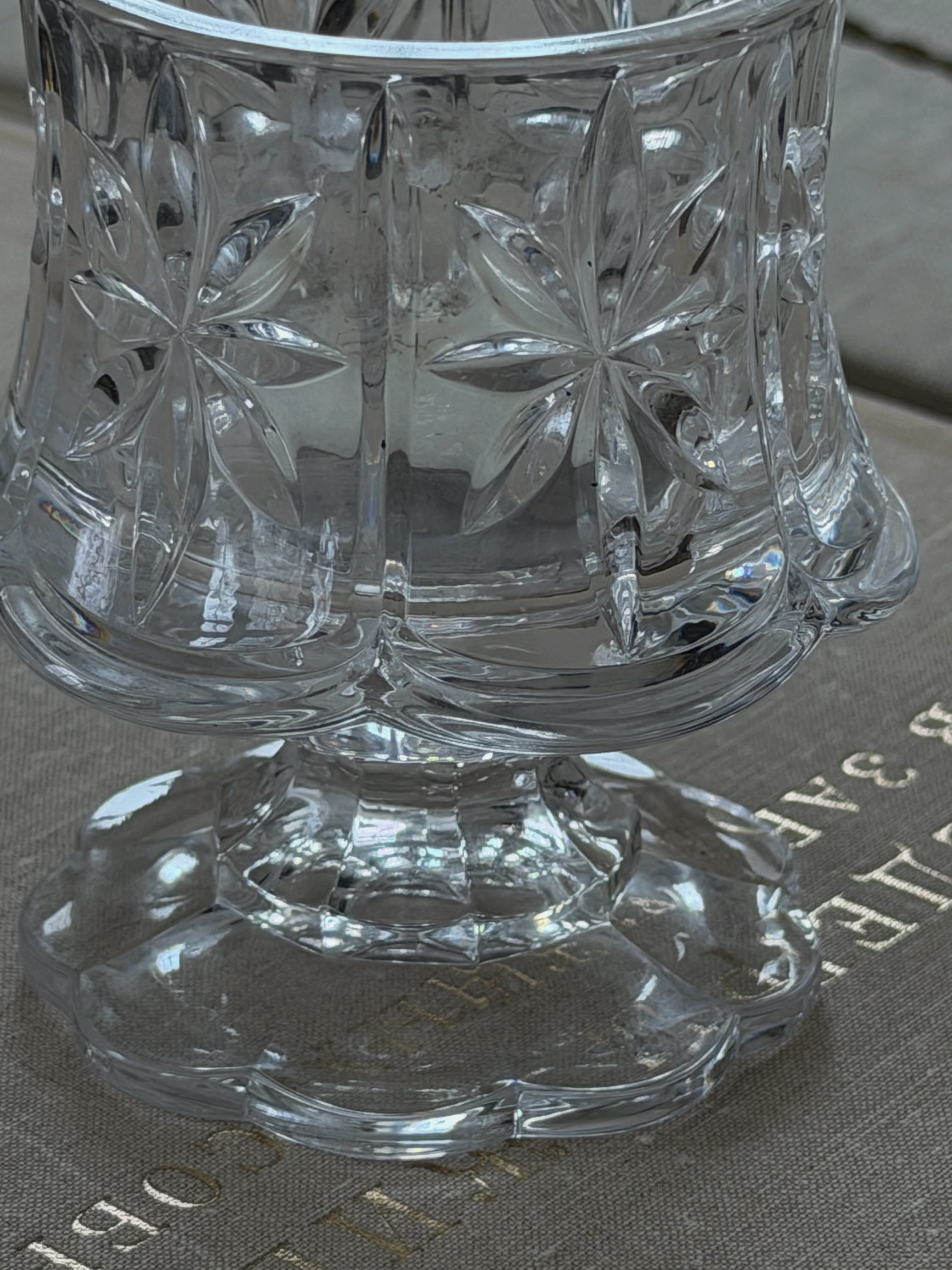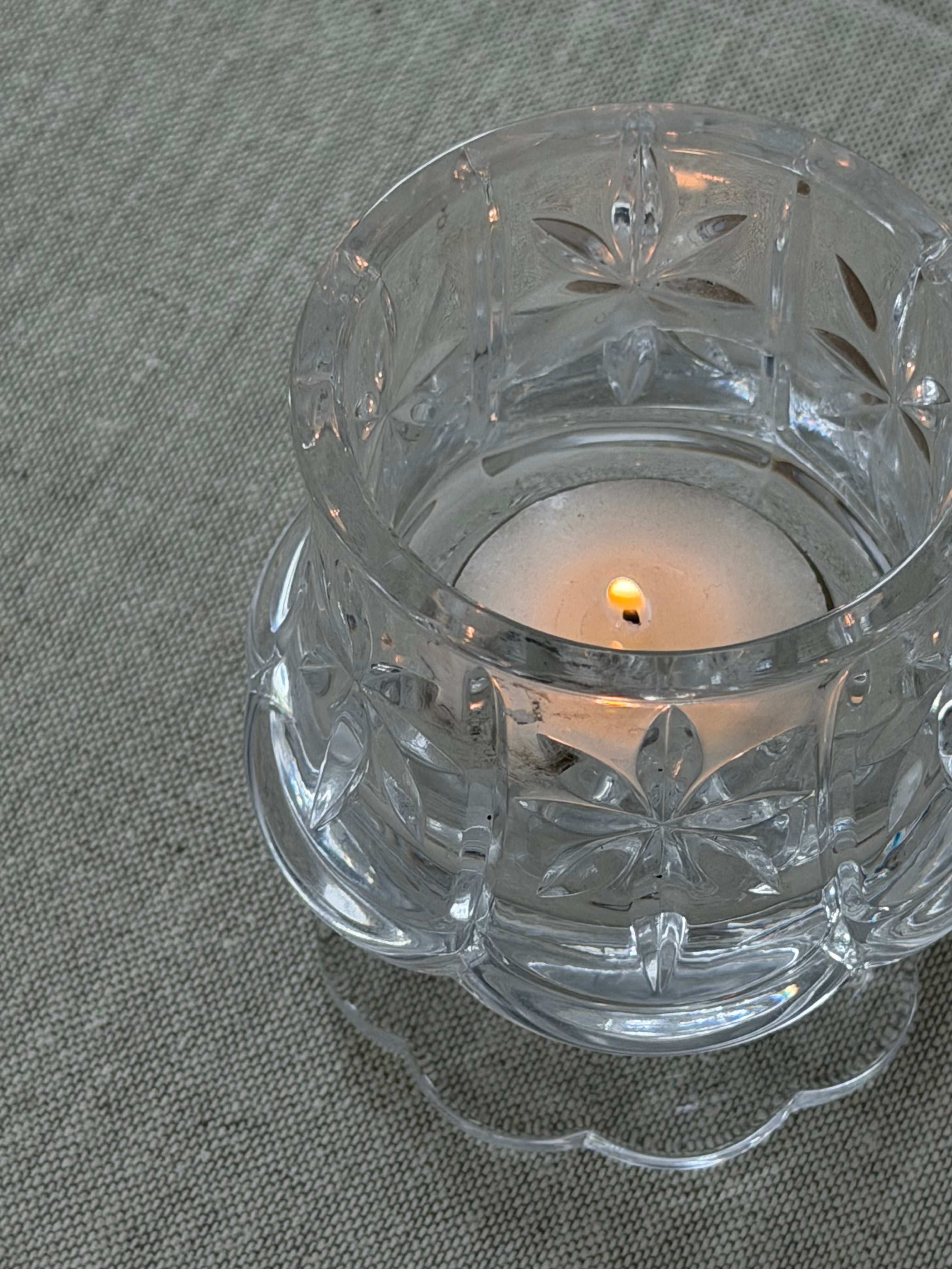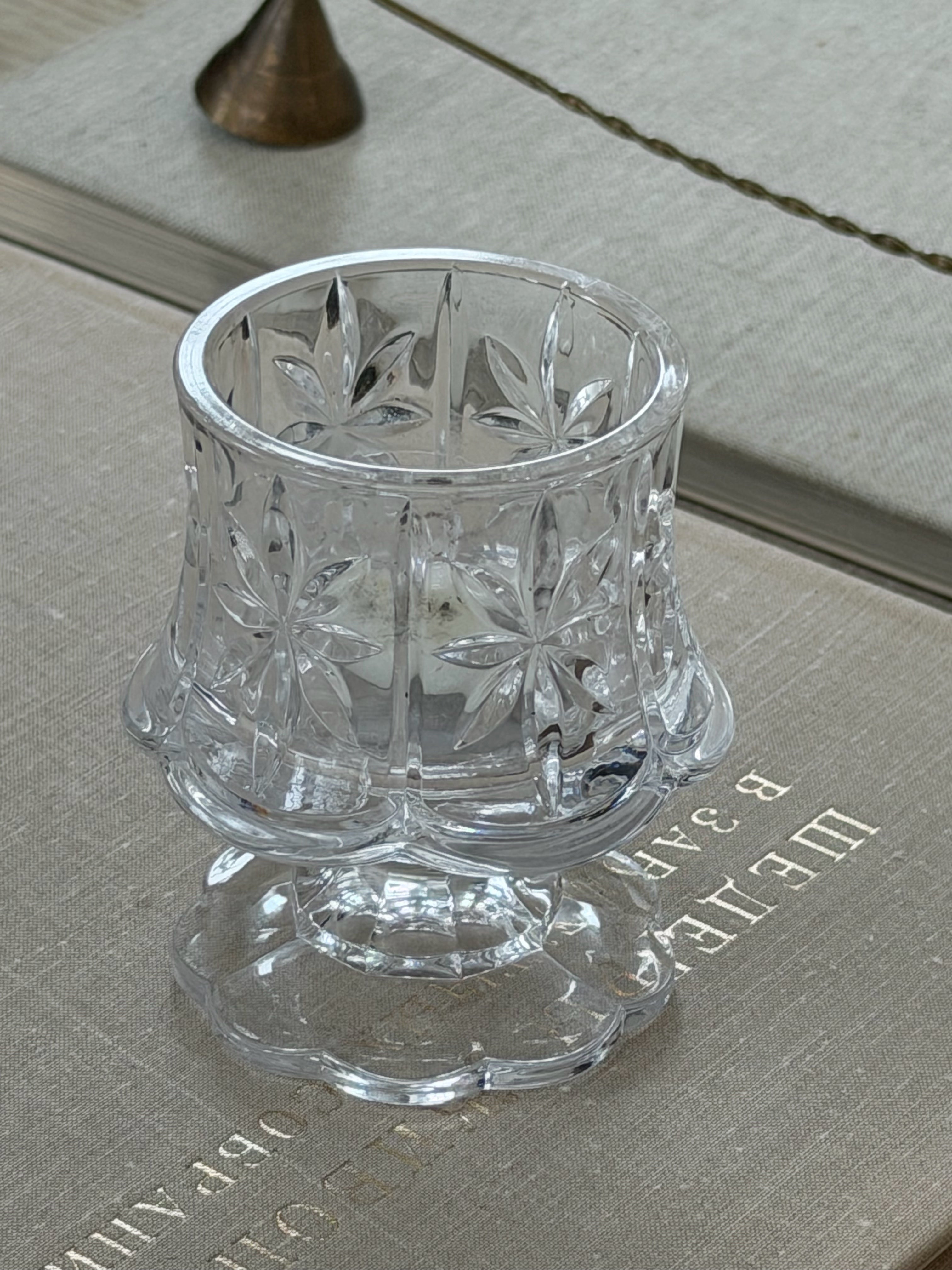 A petite vintage pressed glass candleholder with a soft motif and pedestal base. Its lamp-shaped silhouette and delicate scale make it especially charming on a bedside table, bath ledge, or layered into an evening tablescape. Holds a votive or small tealight.