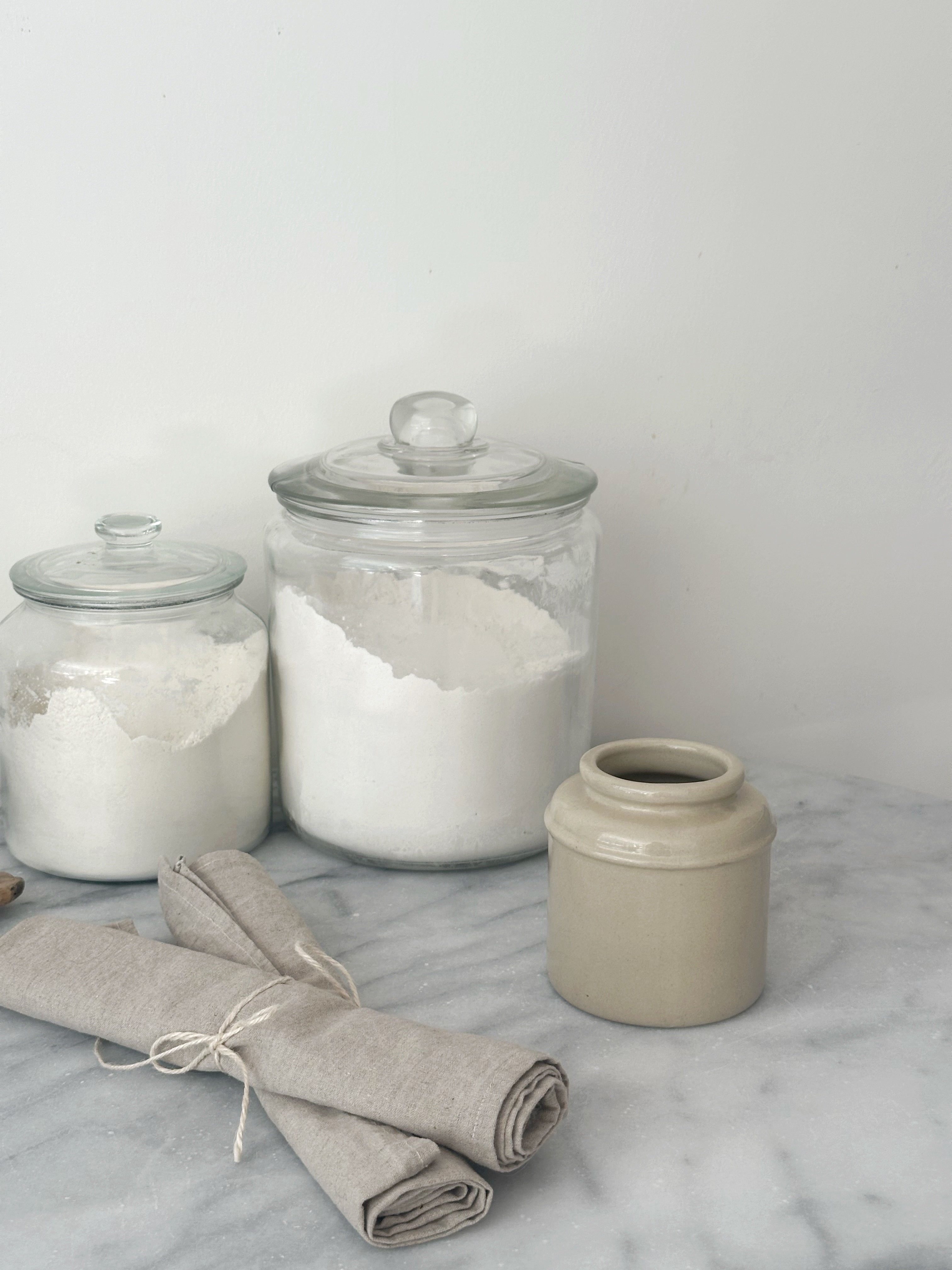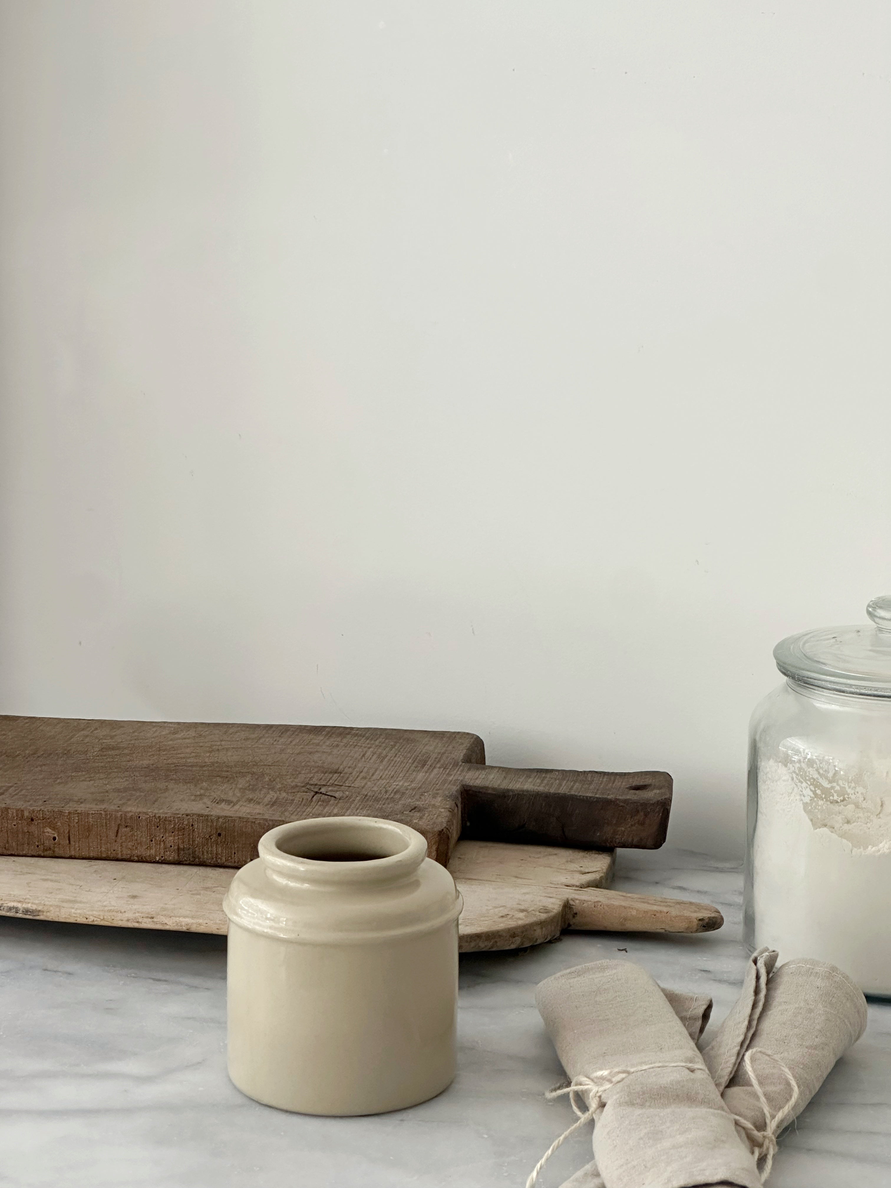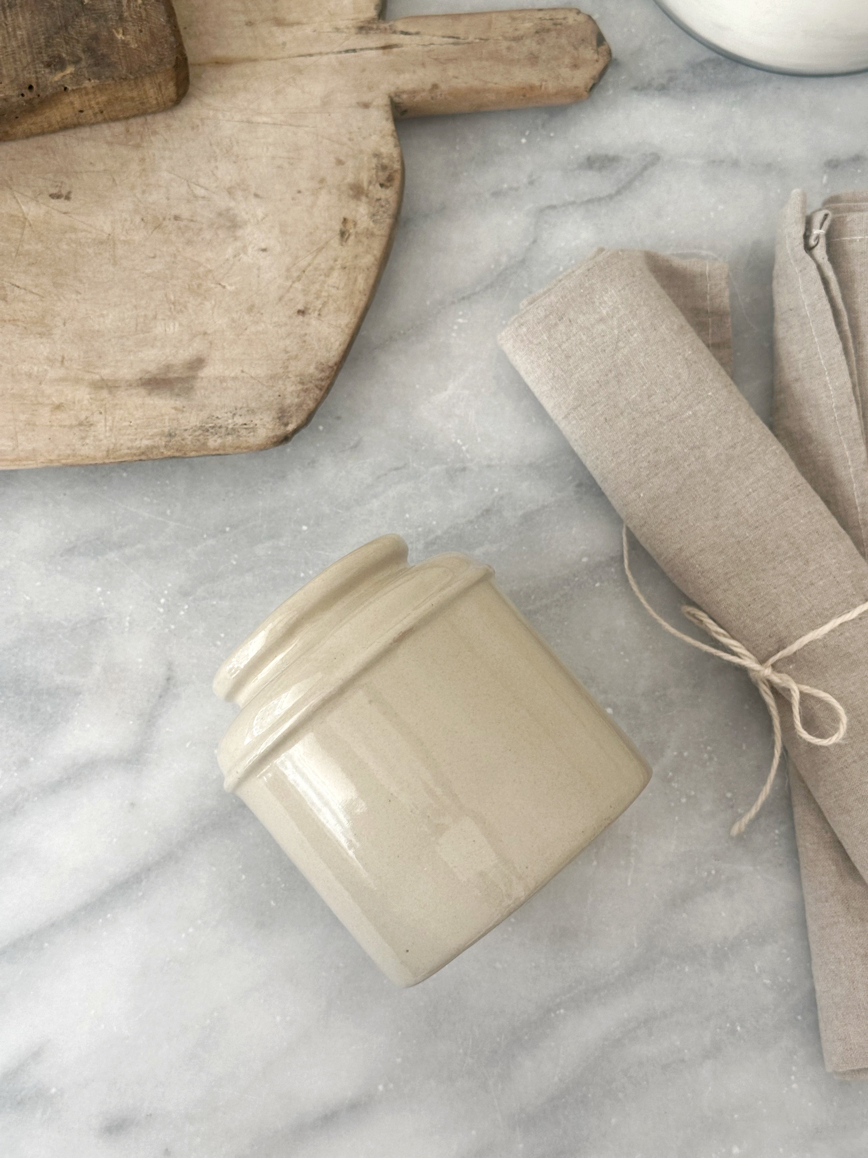 A beautifully simple vintage stoneware jar with a soft cream glaze and classic rolled rim. This piece exudes timeless charm, whether displayed on open shelving or used functionally. Its petite size makes it perfect for holding dried herbs, pens, or a small bundle of wildflowers. Subtle crazing and gentle wear speak to its history and add to its rustic, collected feel. A quiet staple for any cozy, curated home.