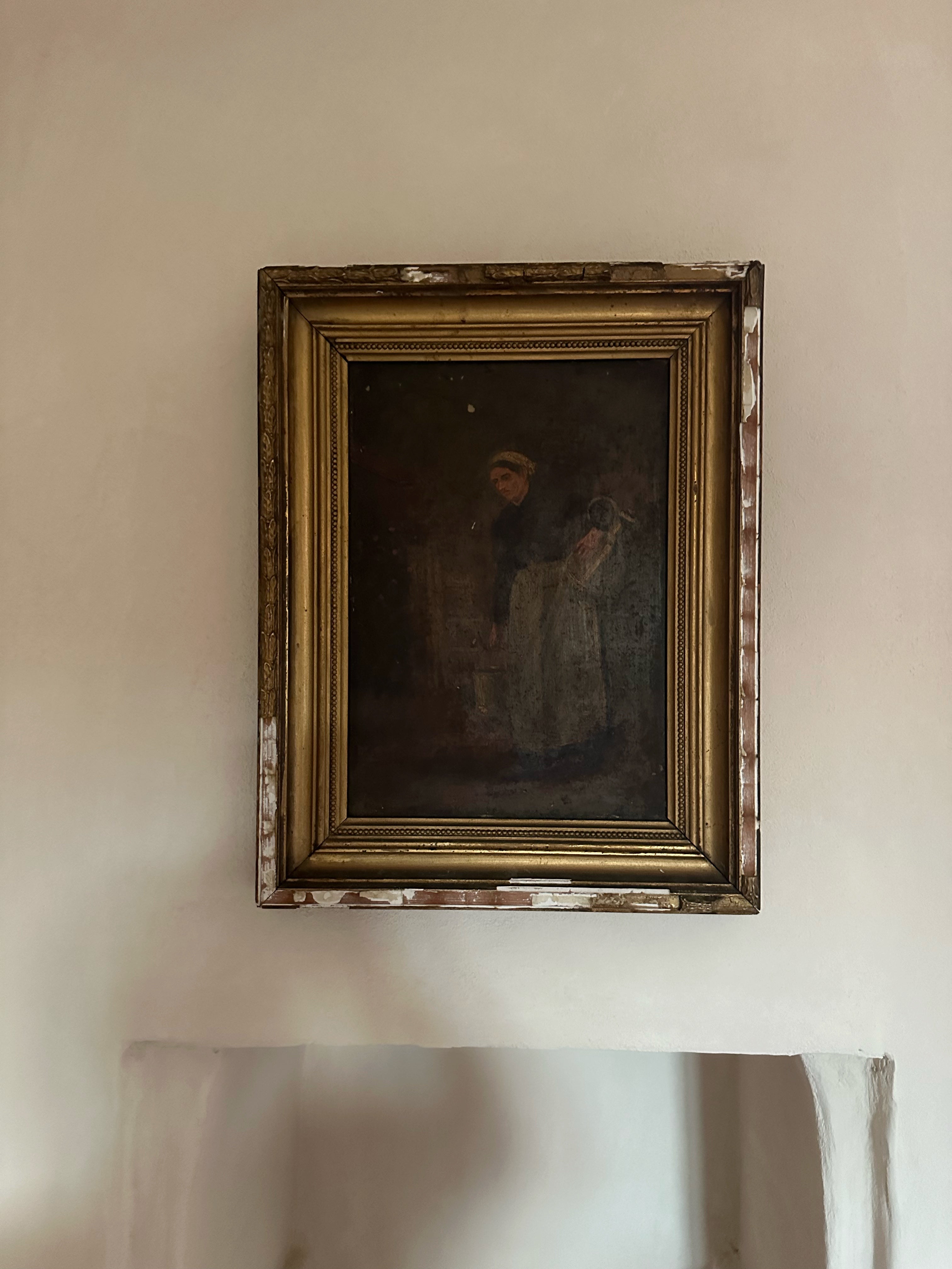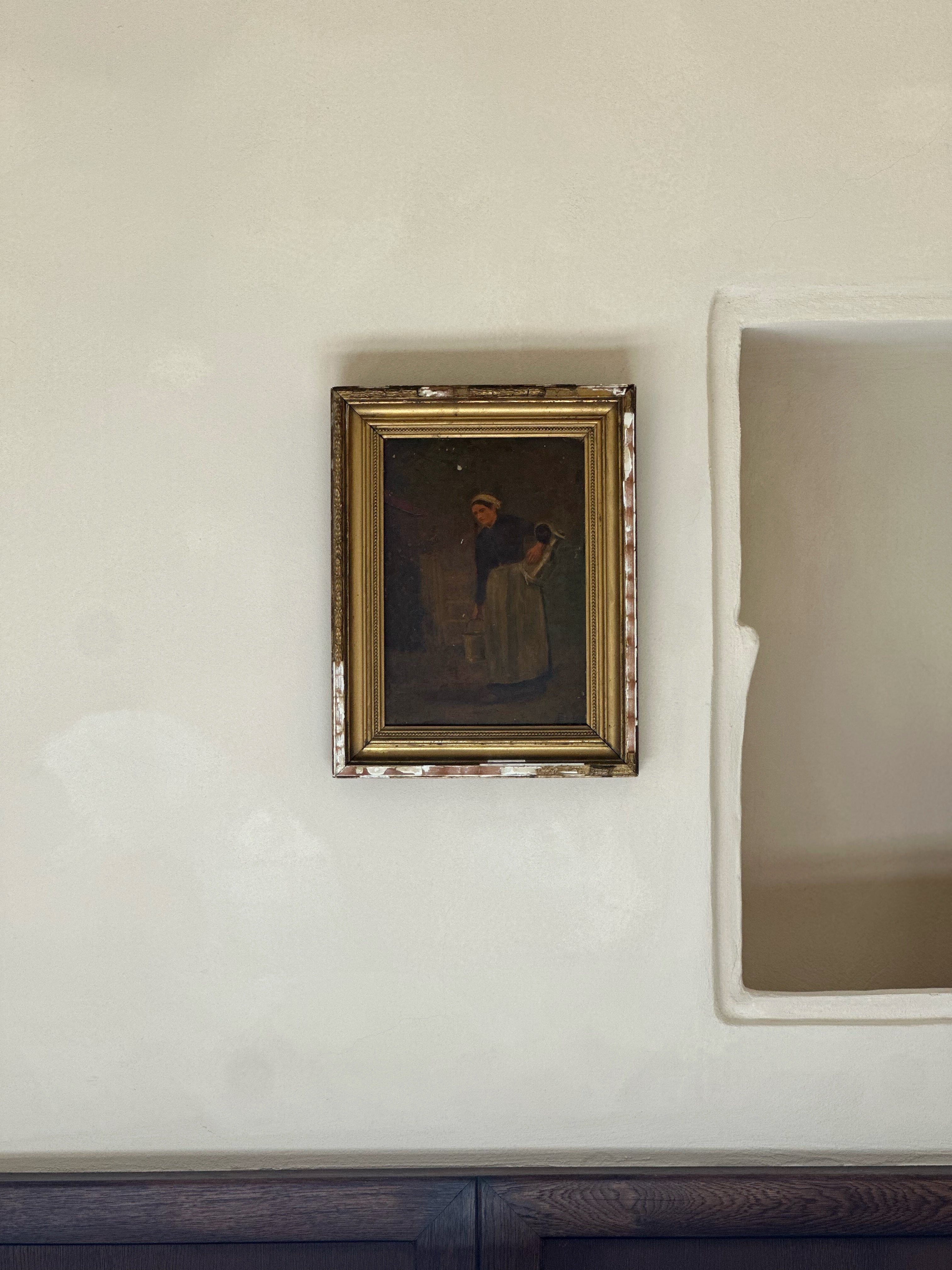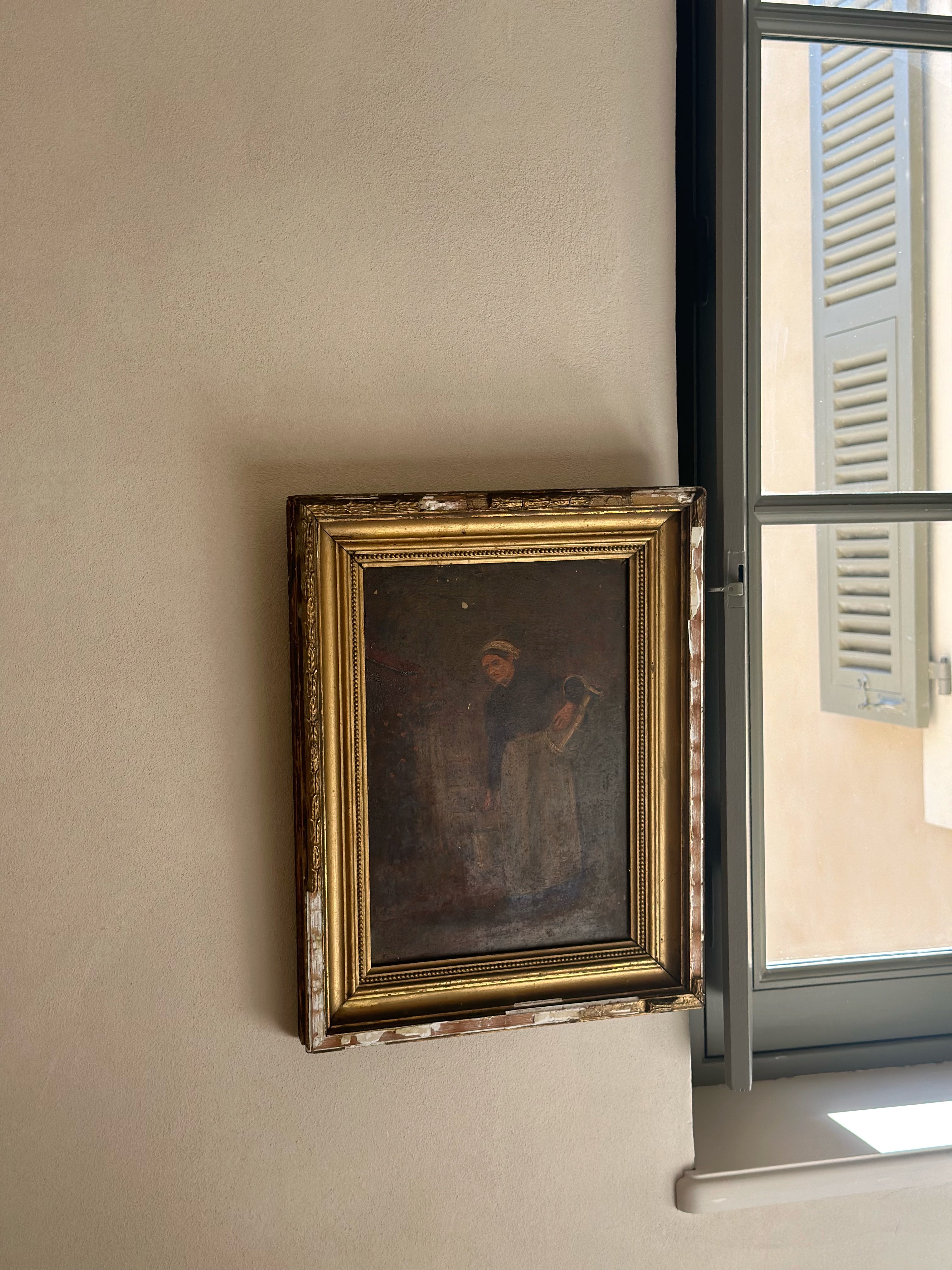 This antique French painting, likely from the 19th century, depicts a solitary woman absorbed in her daily chores. The muted, earthy tones and soft brushwork beautifully capture the quiet dignity of her task, evoking a sense of simplicity and timeless labor. The artwork is framed in an ornate, gilded frame with a weathered patina that enhances its character, adding a sense of history and charm. The frame can be left as is, embracing its imperfections, or reframed to suit a more modern aesthetic.