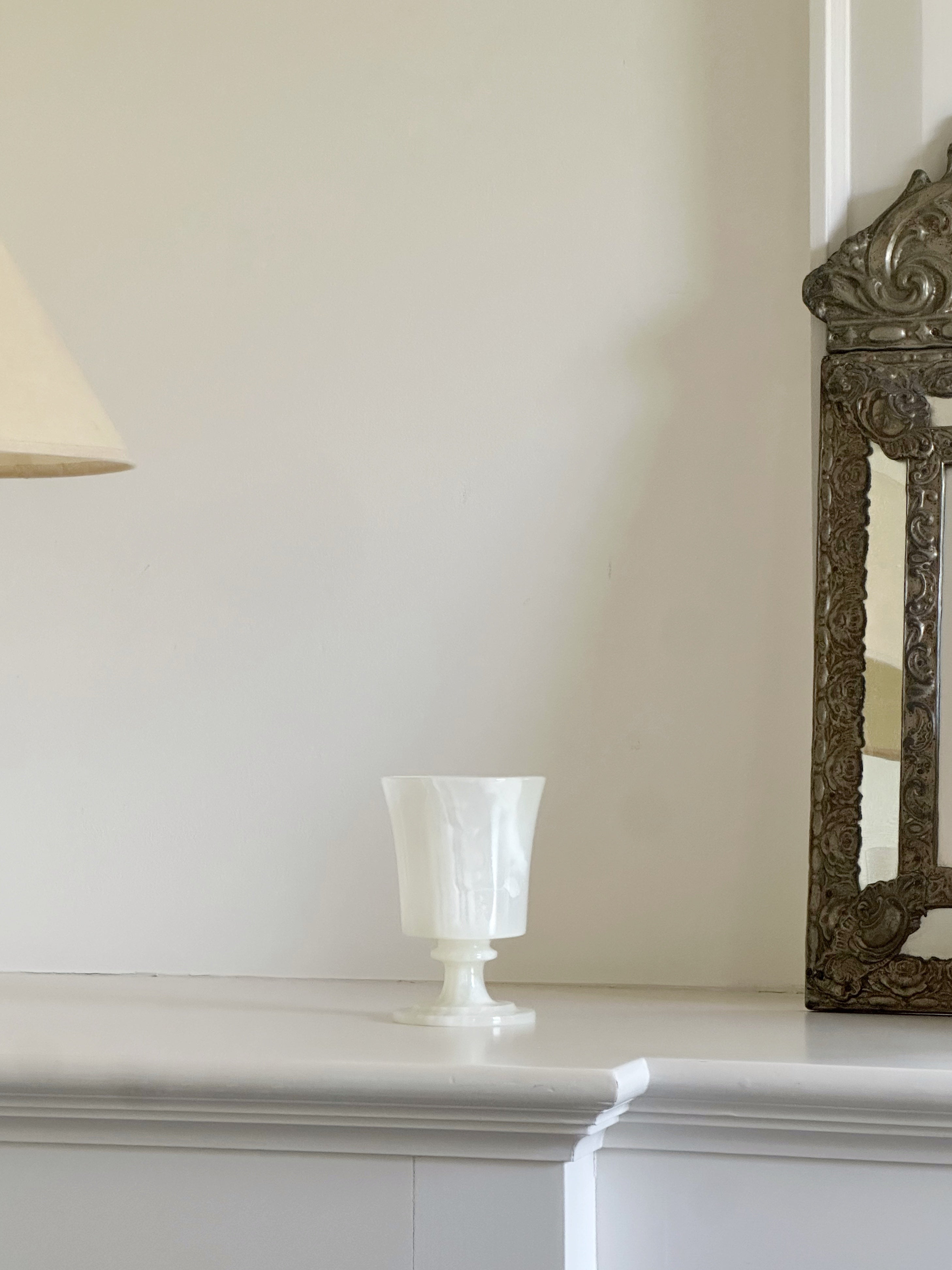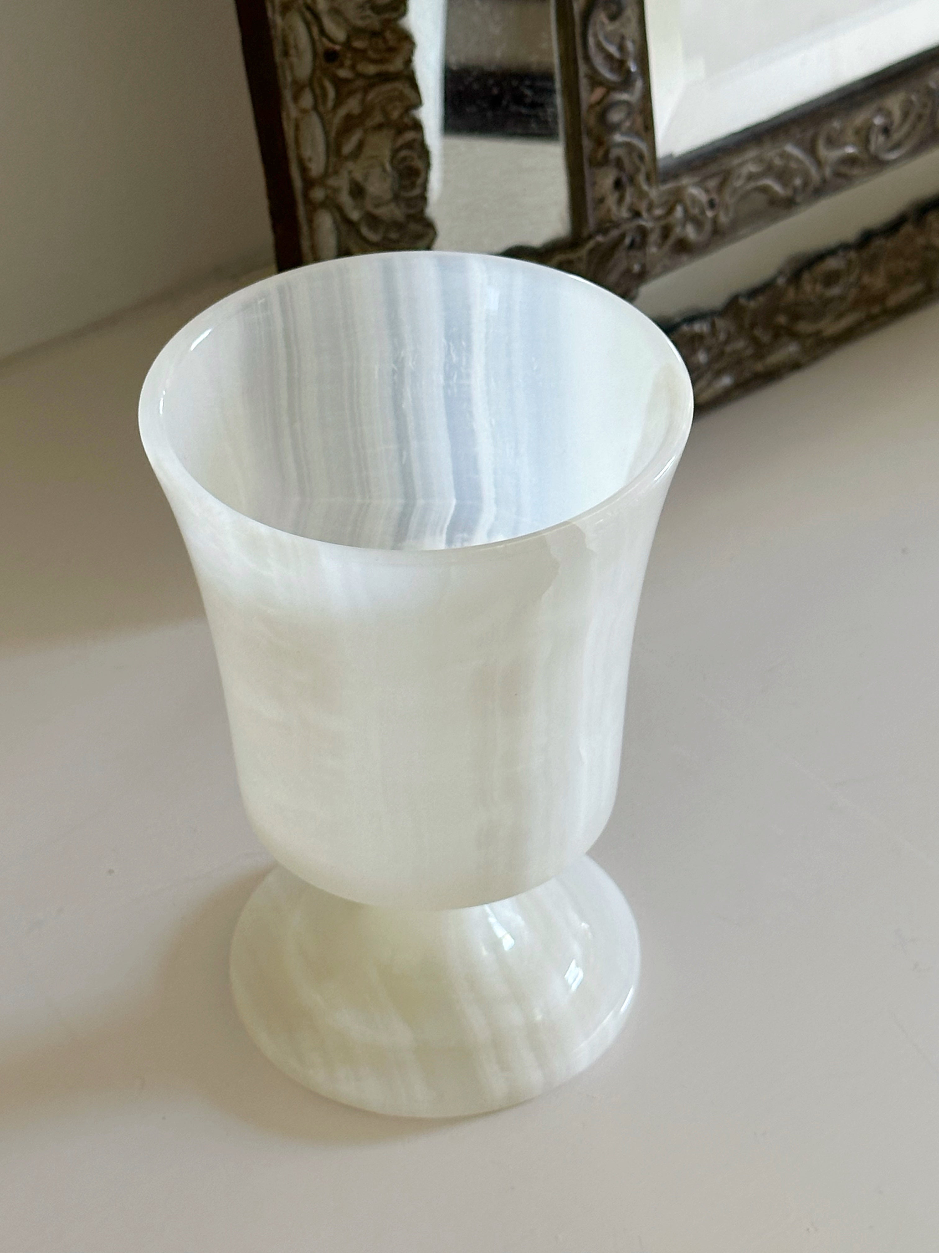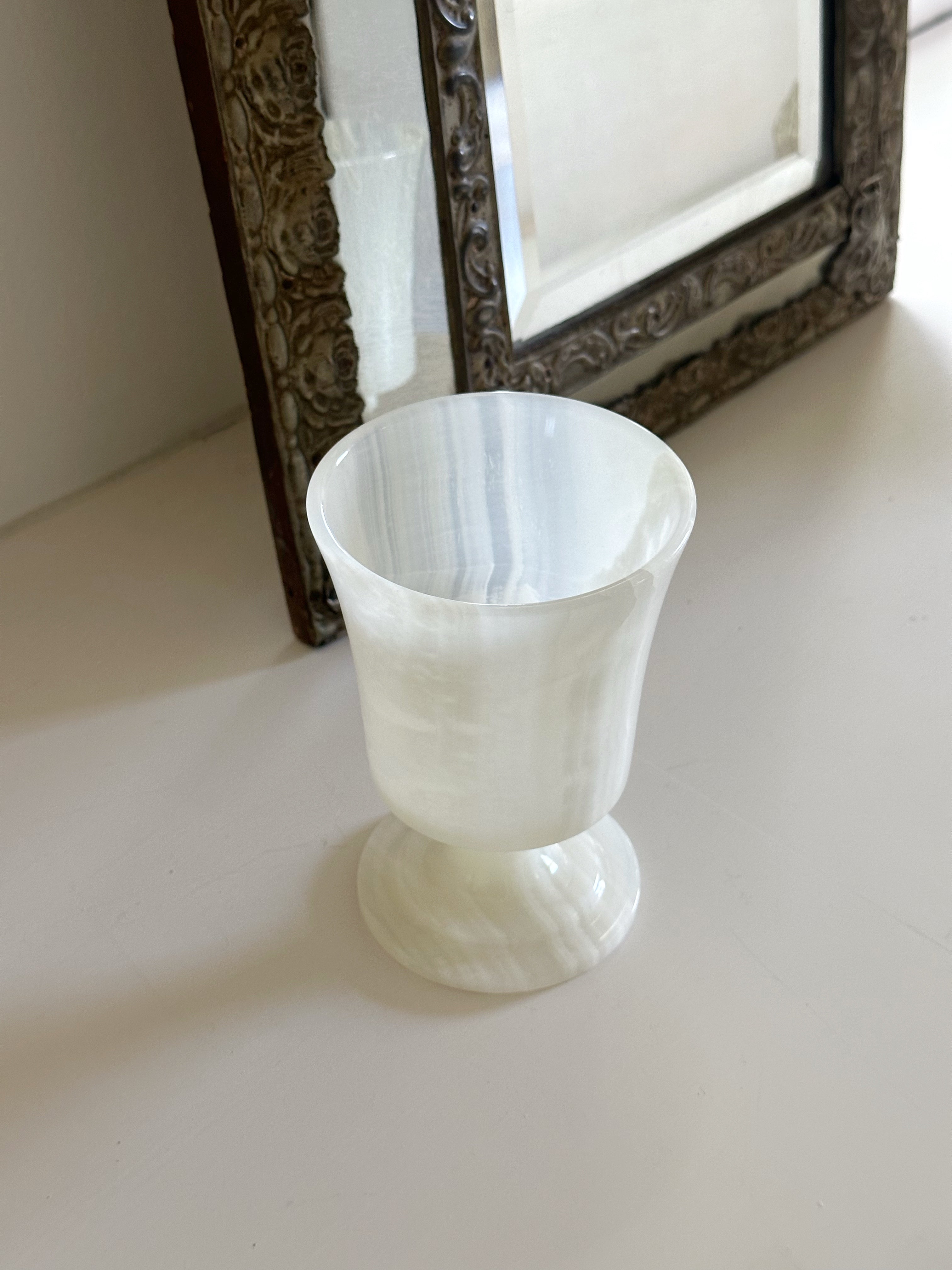 Hand-carved from natural onyx, this vintage vessel glows with a soft, quiet translucence. Its cream-toned surface is traced with earthy striations, each one unique to the stone. The flared cup, slender stem, and rounded base give it a sculptural presence - refined yet organic.
