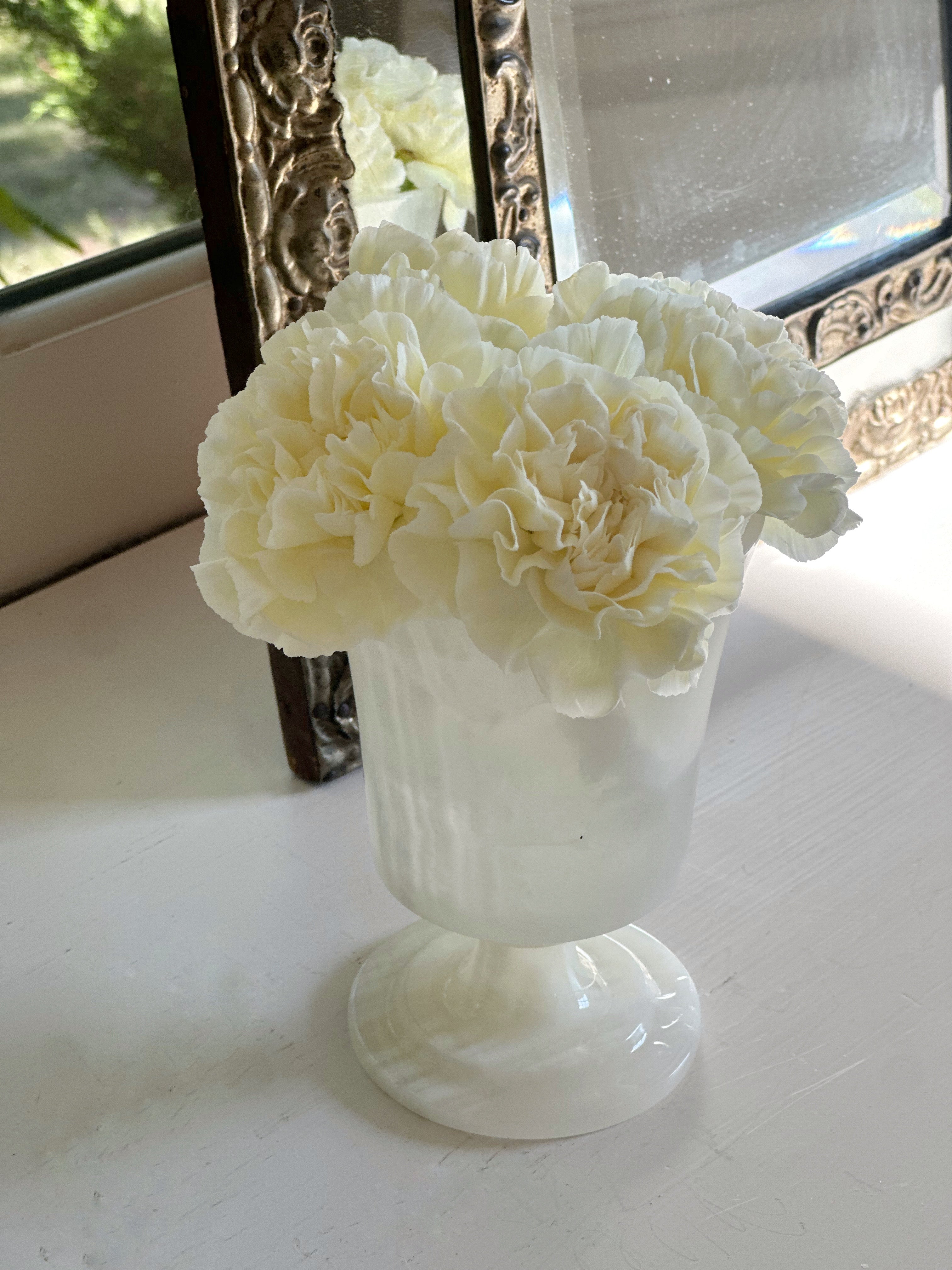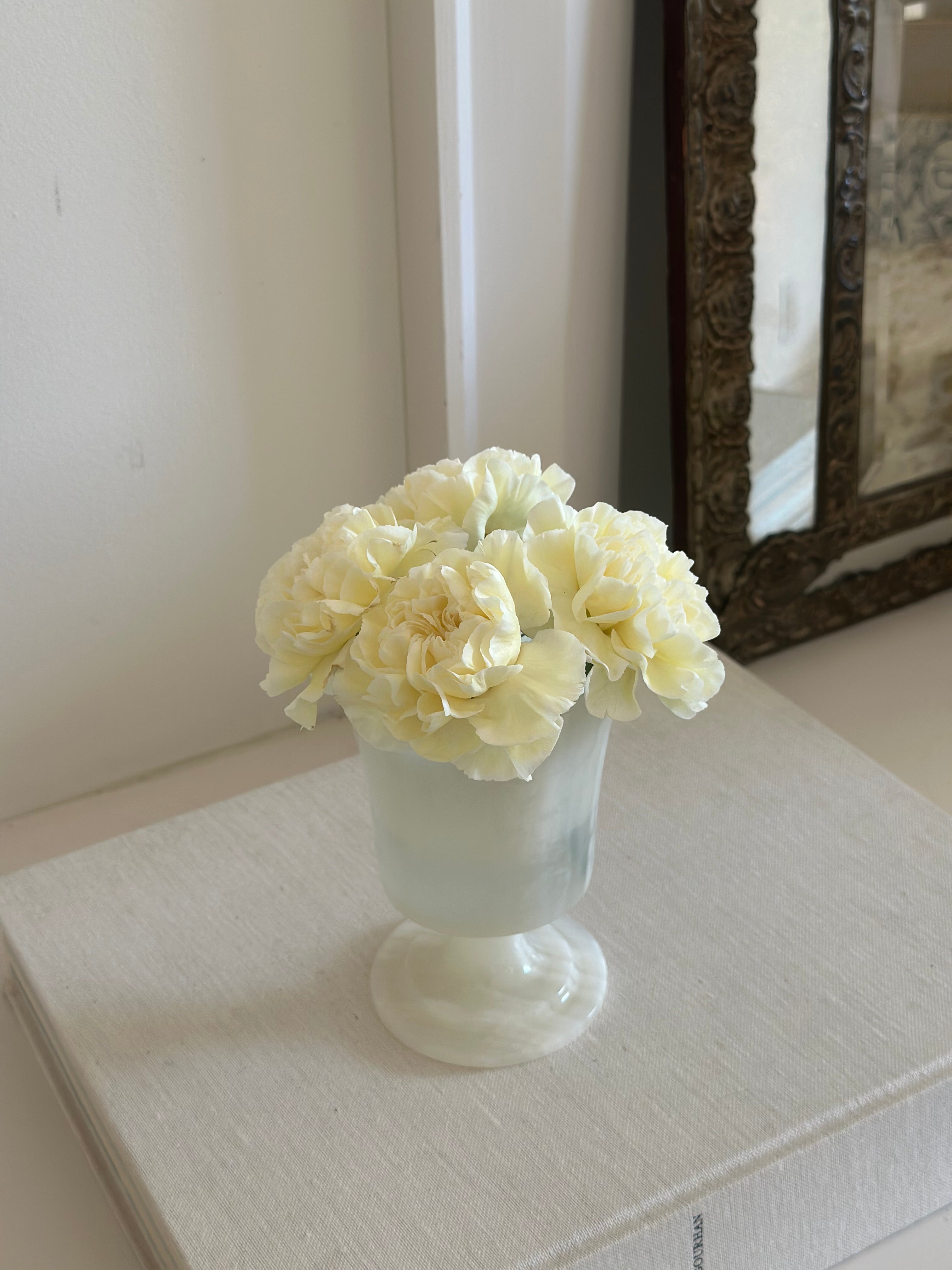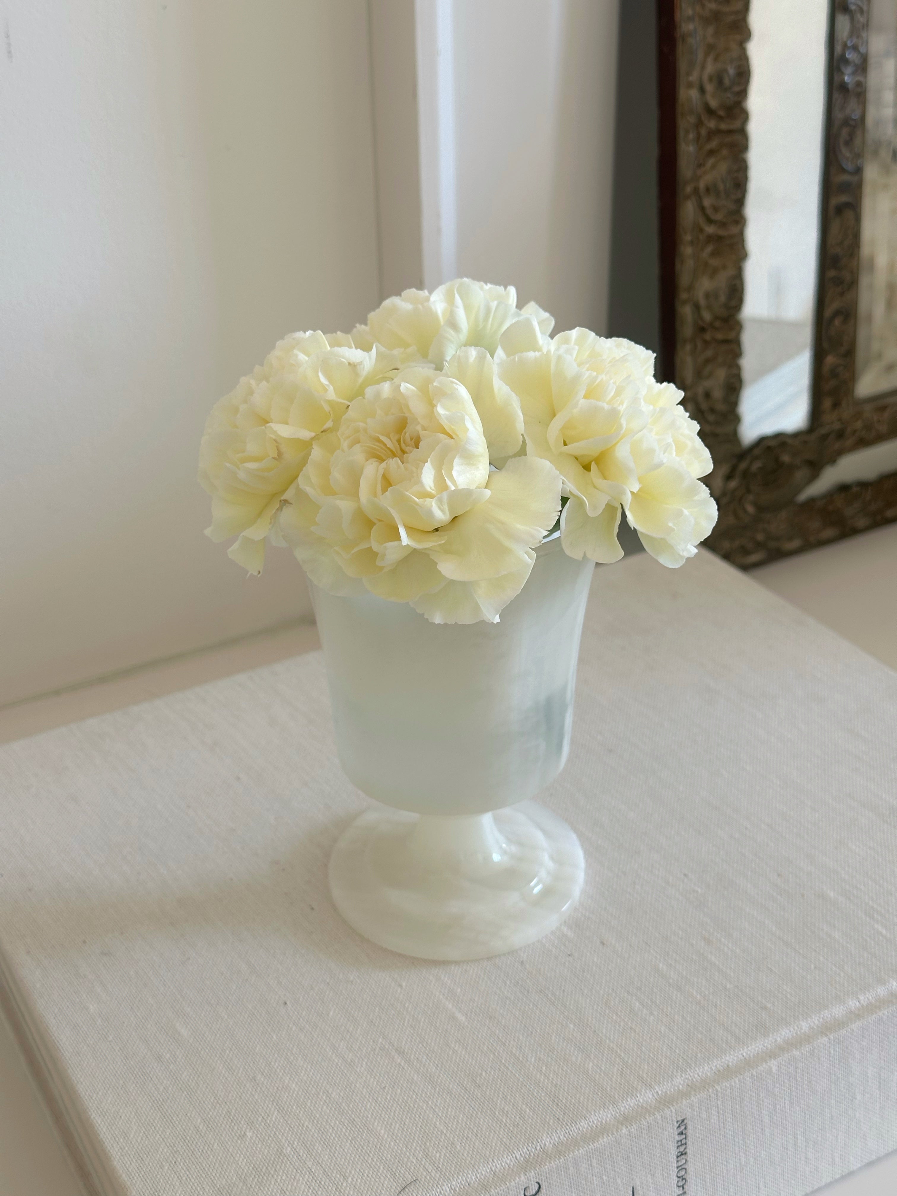 Hand-carved from natural onyx, this vintage vessel glows with a soft, quiet translucence. Its cream-toned surface is traced with earthy striations, each one unique to the stone. The flared cup, slender stem, and rounded base give it a sculptural presence - refined yet organic.