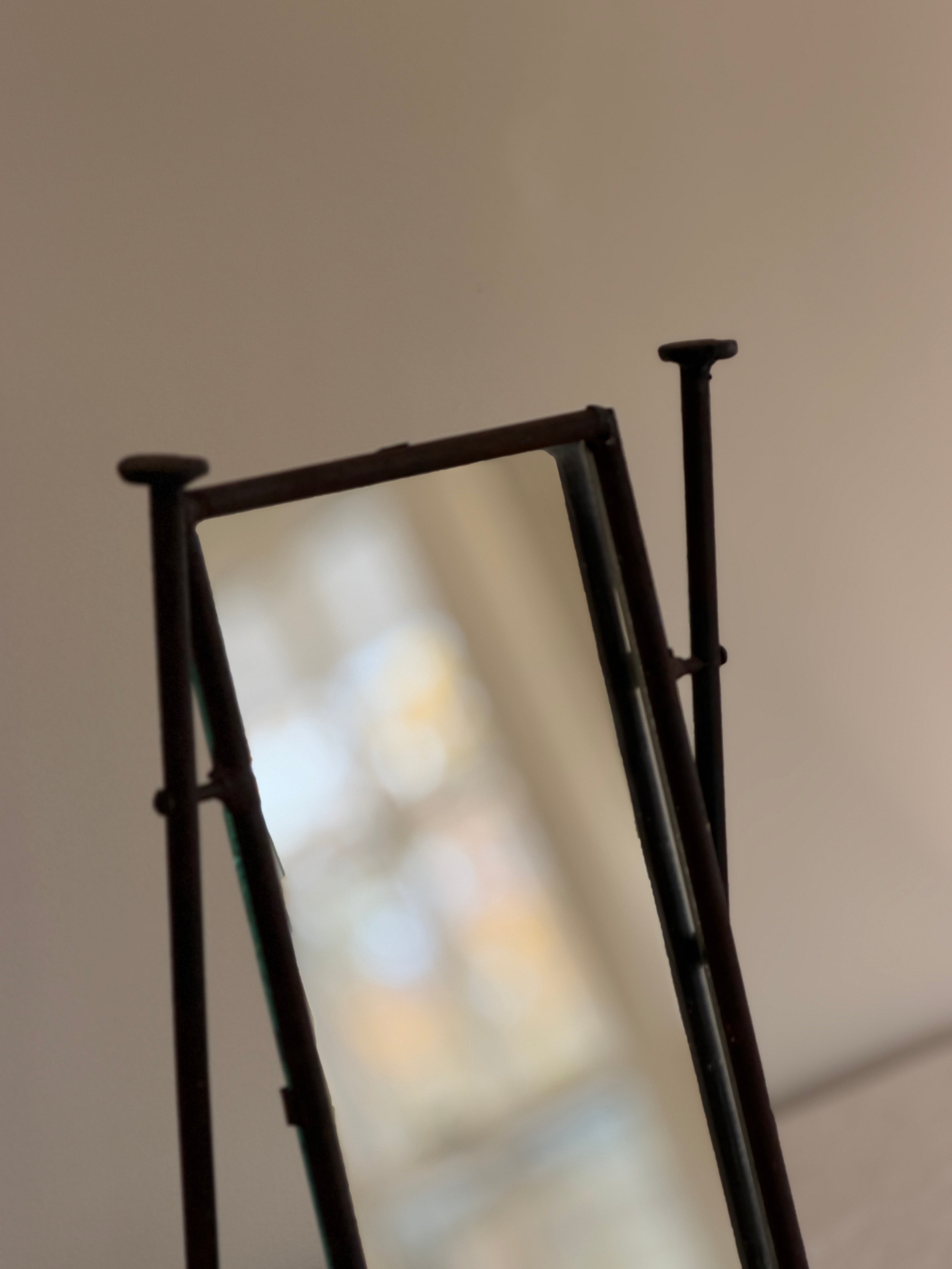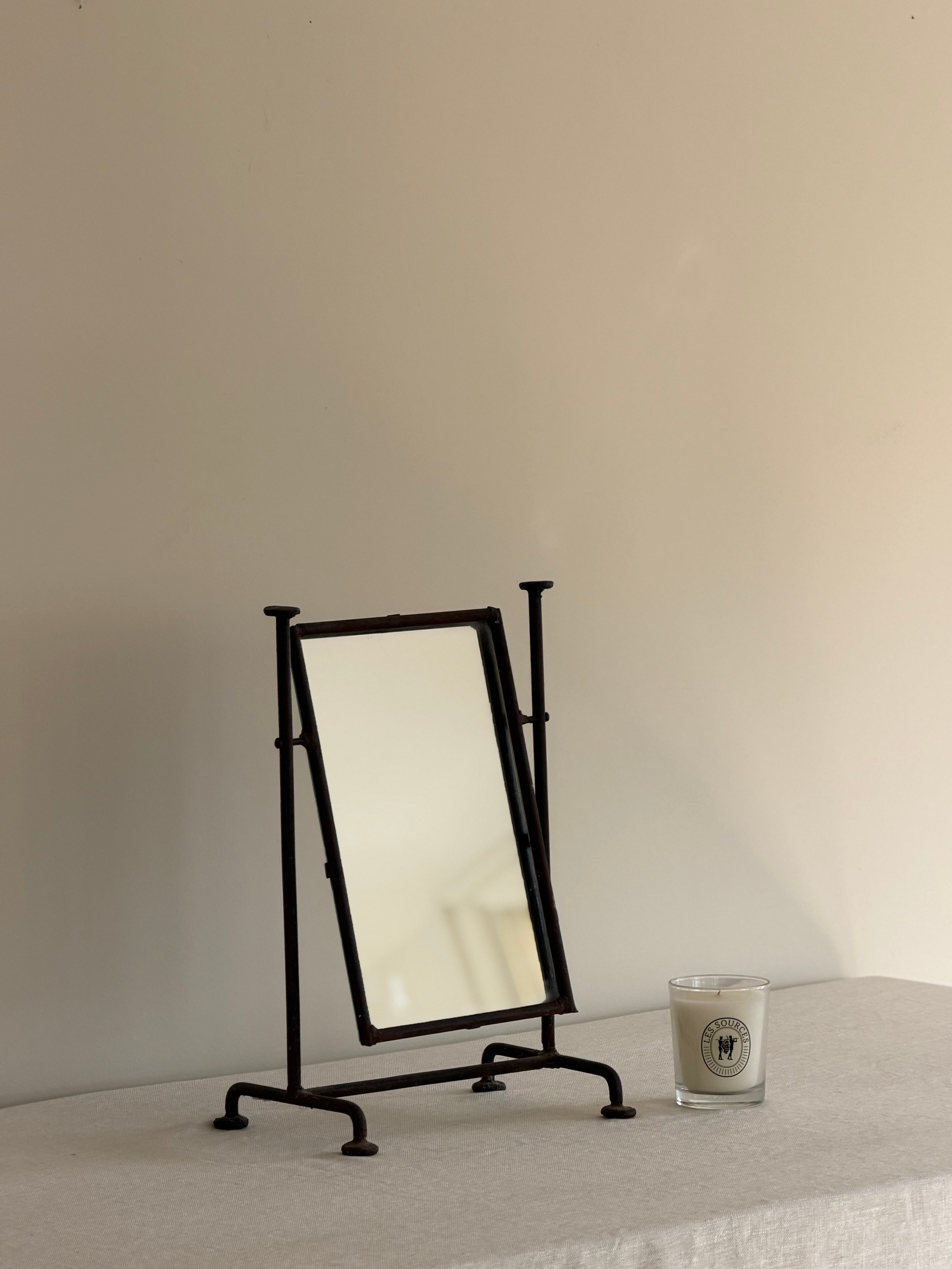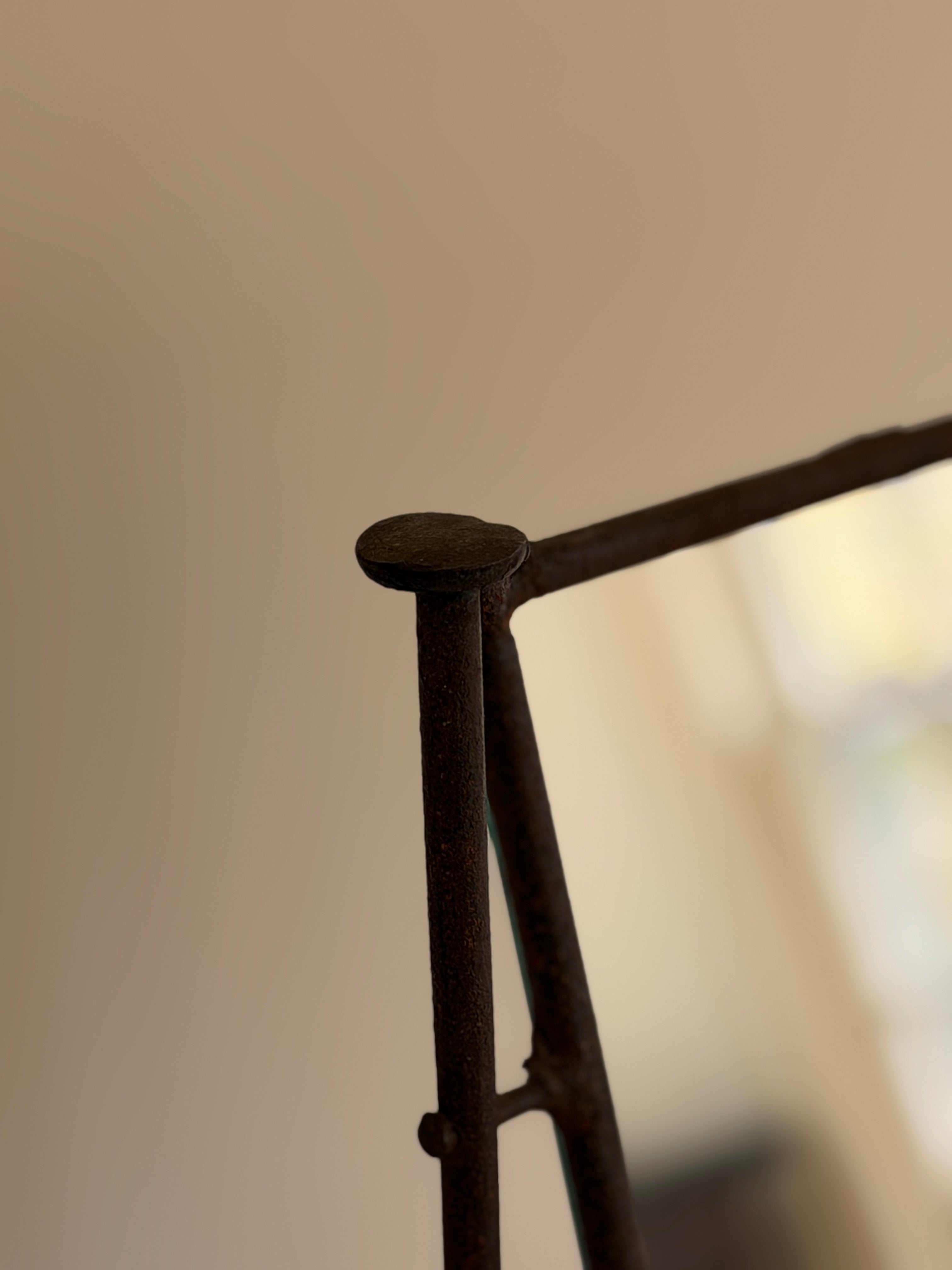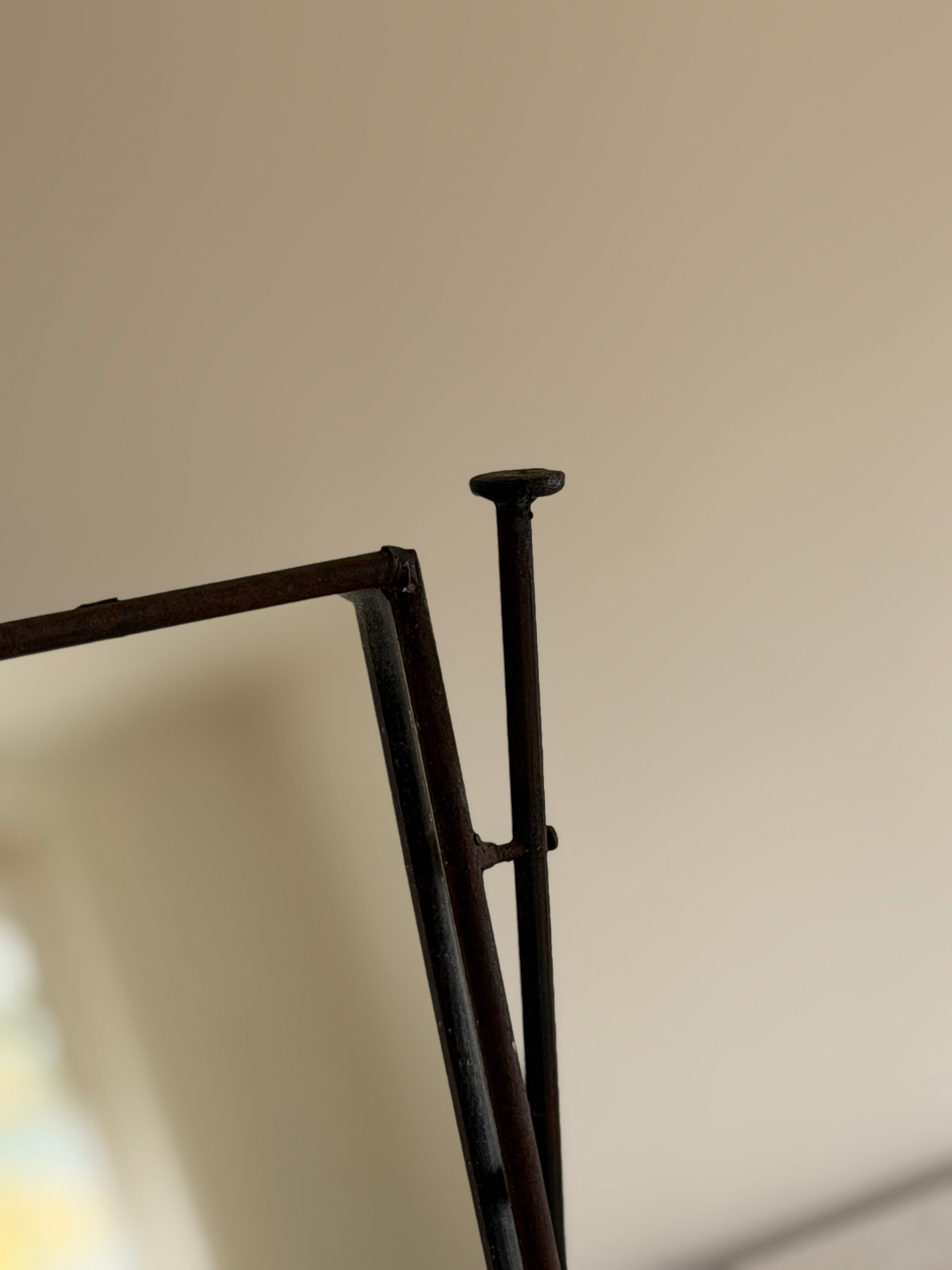 OOAK vintage vanity mirror, hand-formed in iron with a patina that feels softly gathered over time. Its slender legs and eased edges carry the quiet poetry of a maker’s hand, while the pivoting glass catches changing light throughout the day.