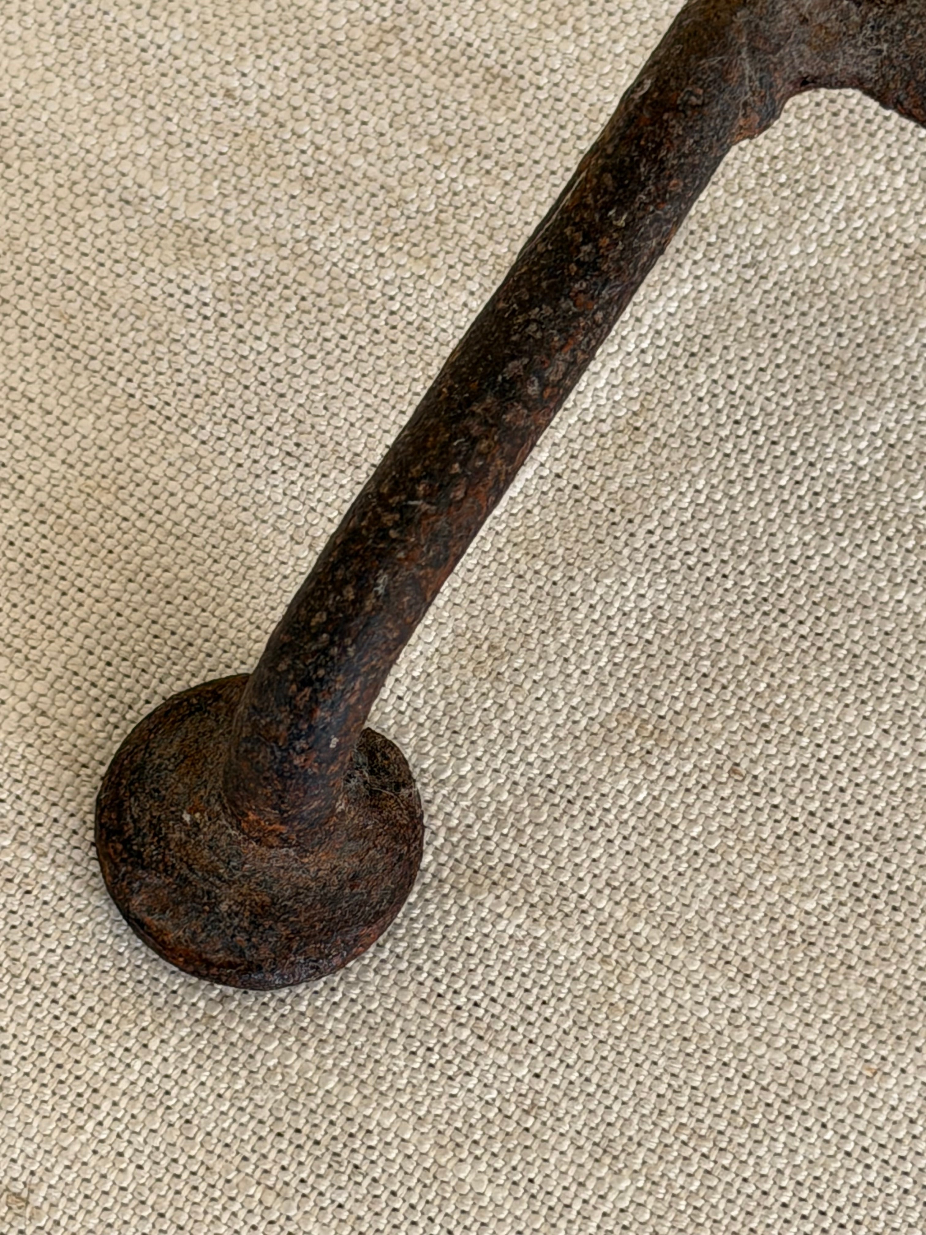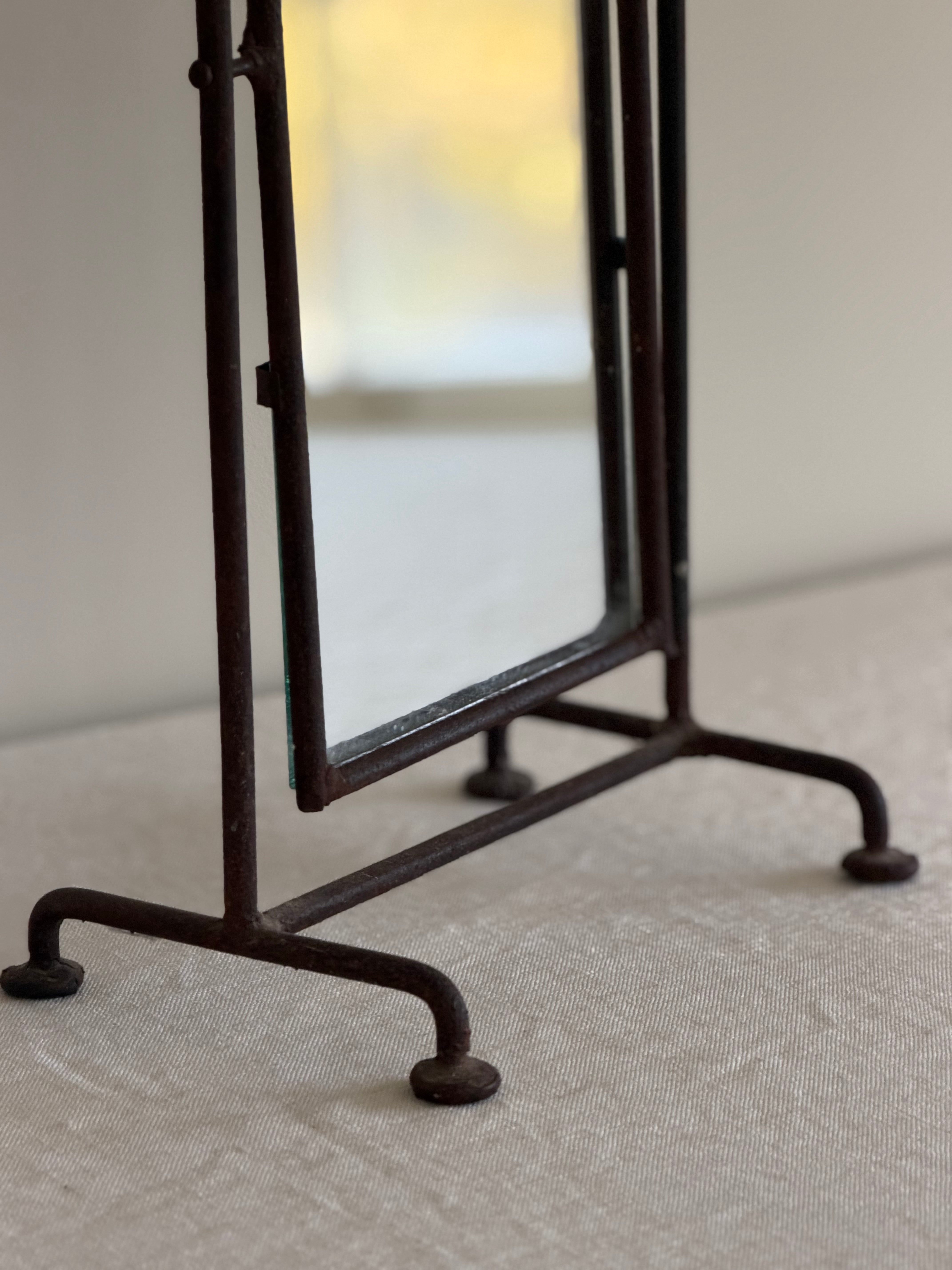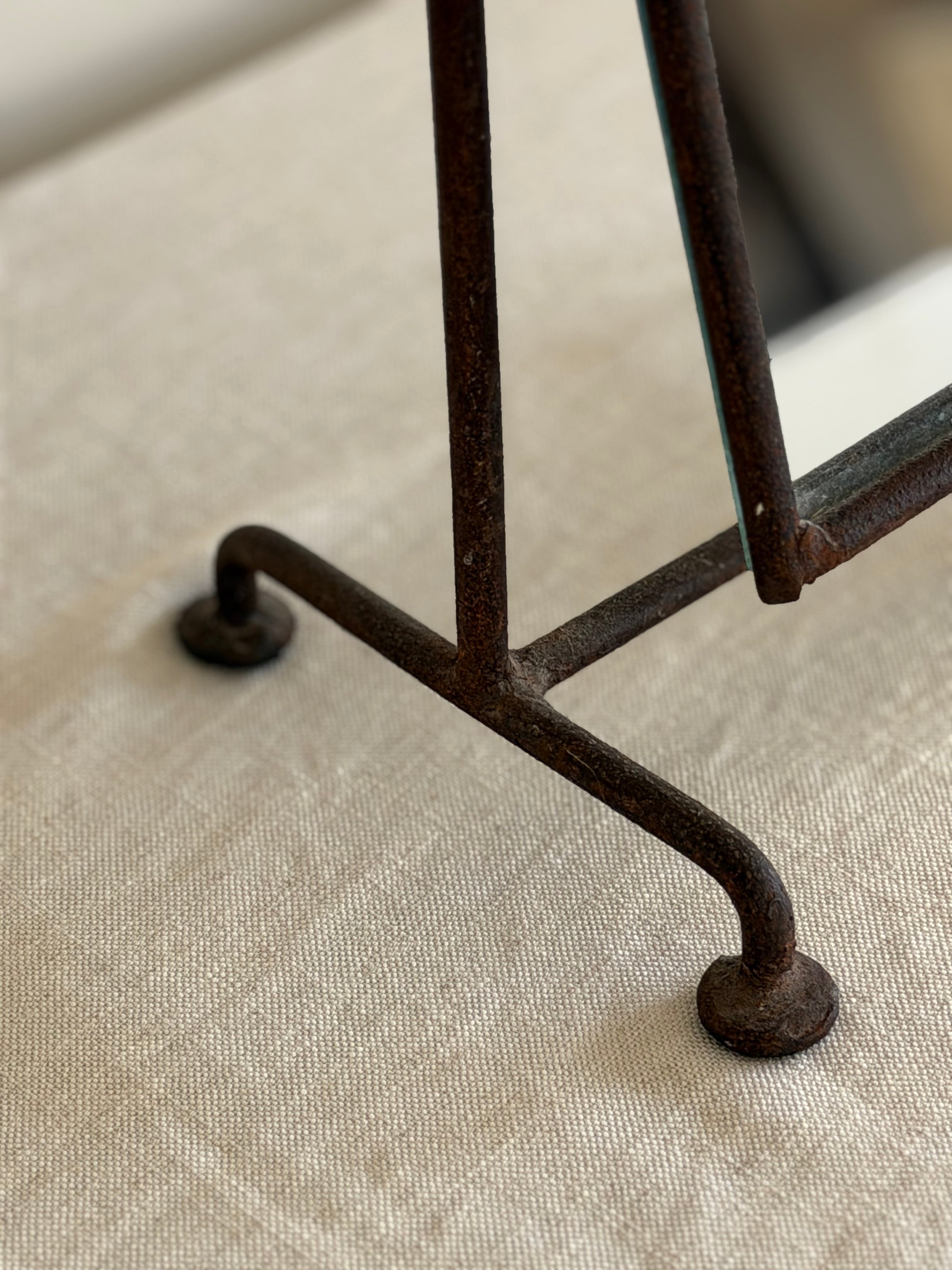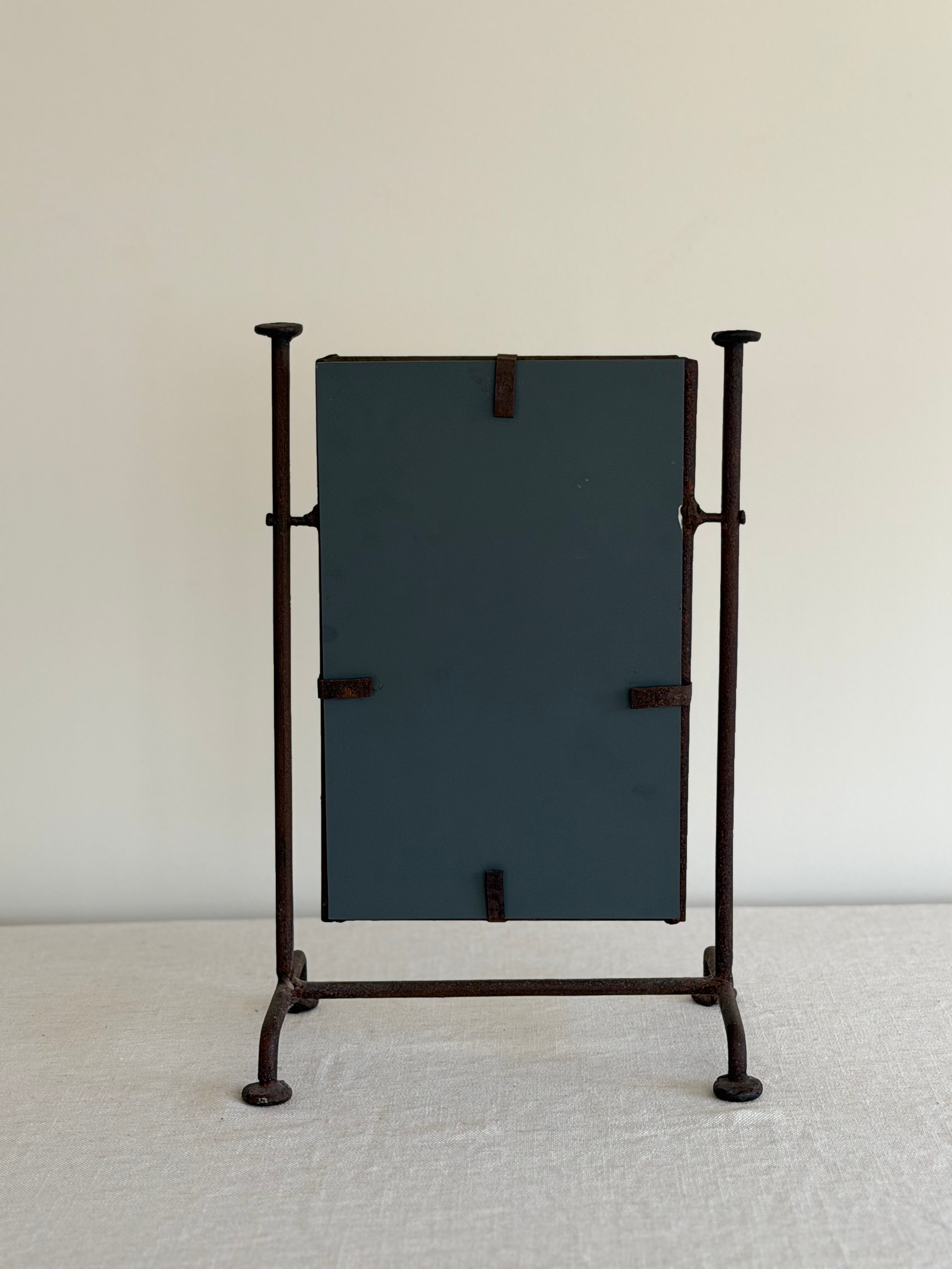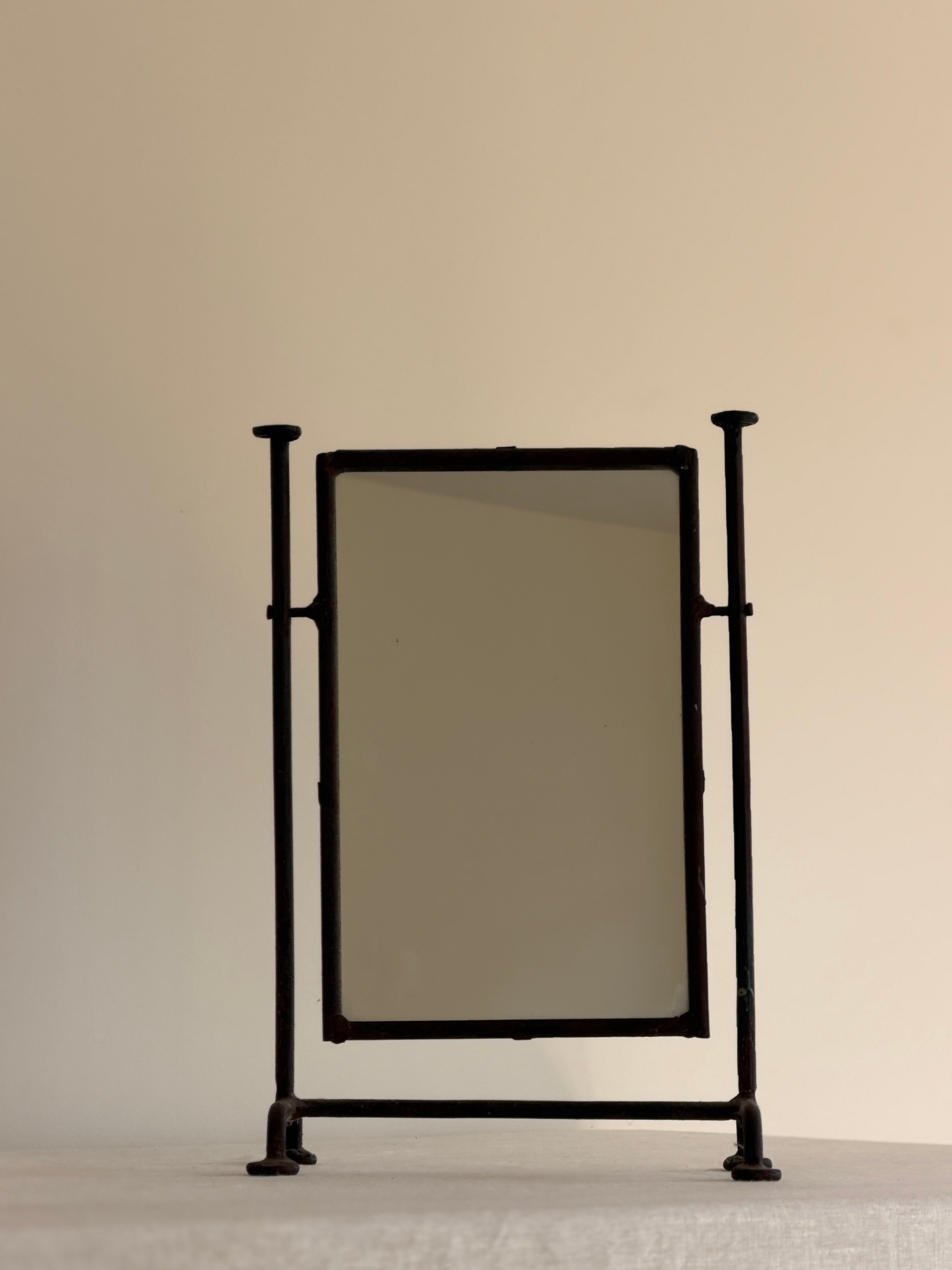 OOAK vintage vanity mirror, hand-formed in iron with a patina that feels softly gathered over time. Its slender legs and eased edges carry the quiet poetry of a maker’s hand, while the pivoting glass catches changing light throughout the day.