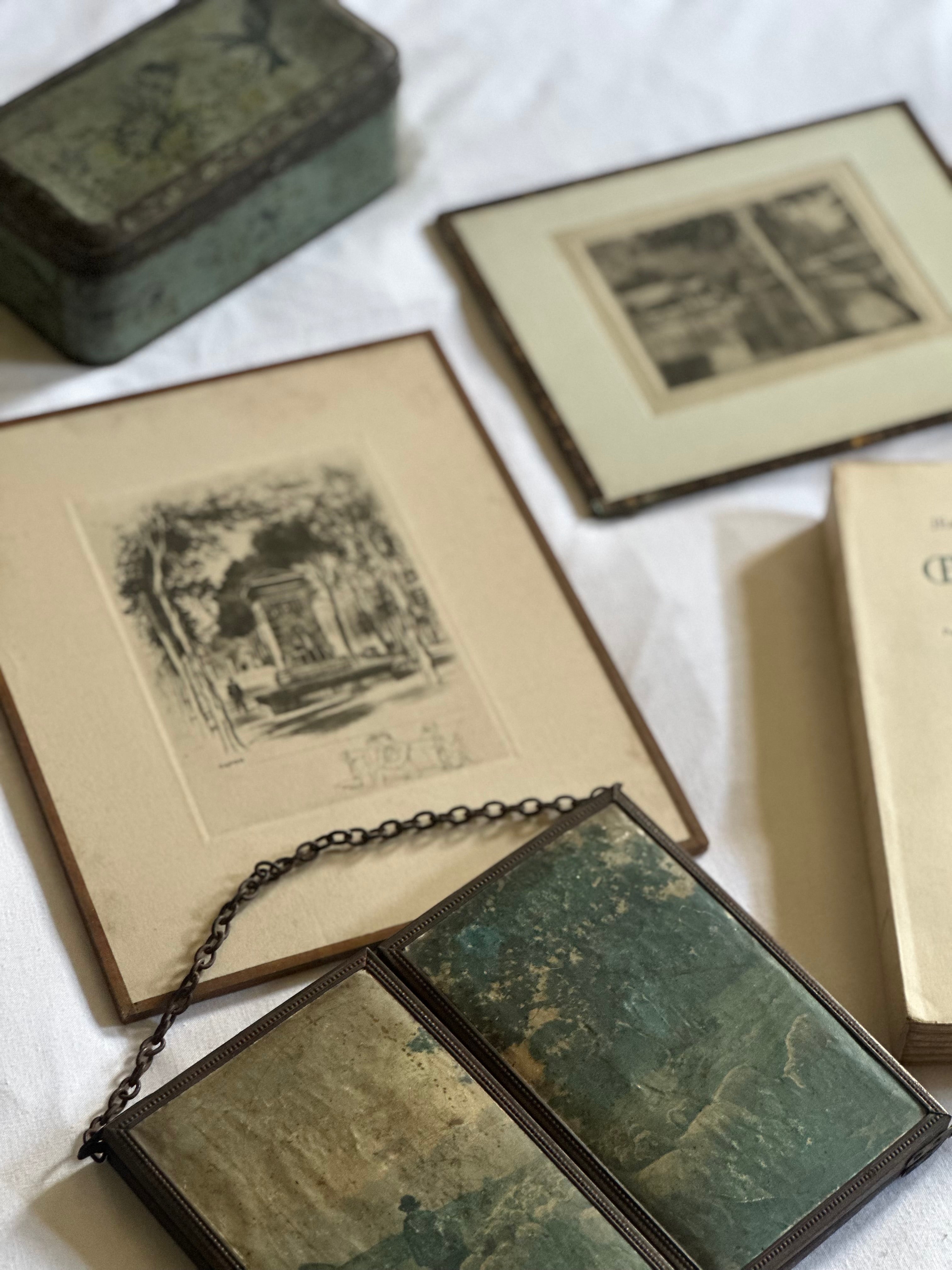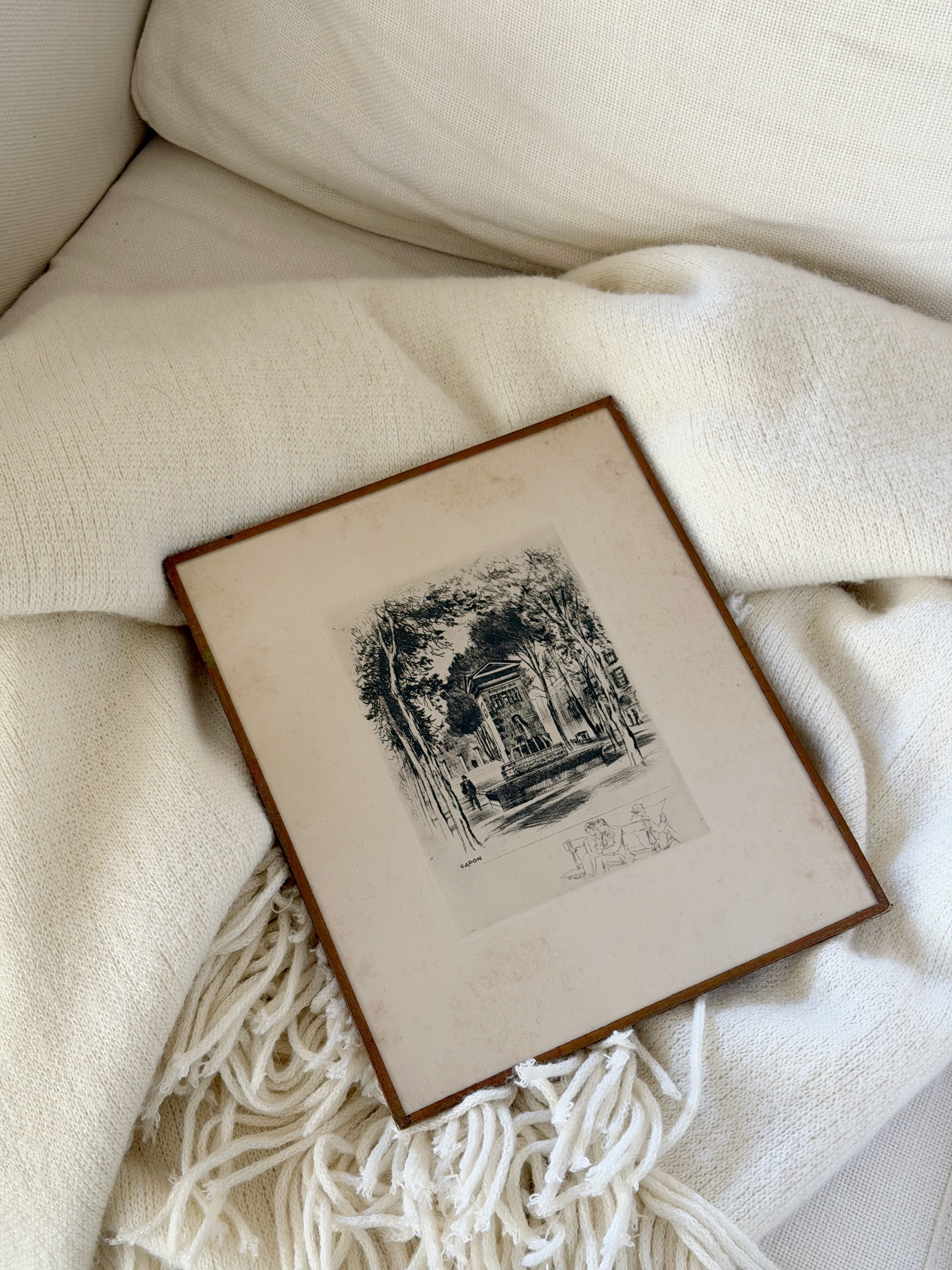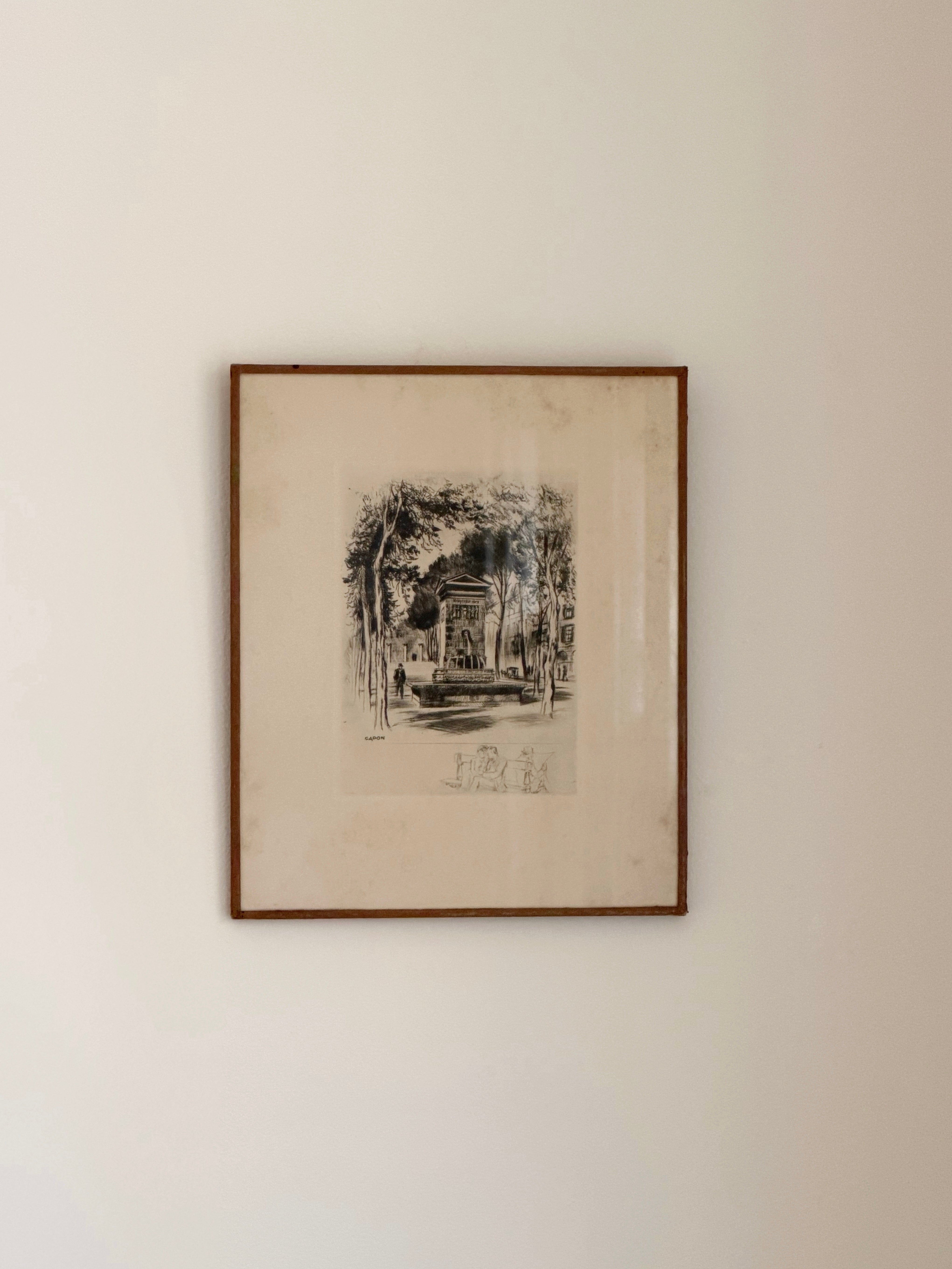 A petite antique French print capturing a calm moment beside a fountain. Trees gather above the water, architecture frames the square, and figures pause in the soft quiet of an ordinary day. The paper and mat have aged gently over time, giving the piece a warm and nostalgic character. The patinated metal frame holds it with a simple charm that feels well-traveled.