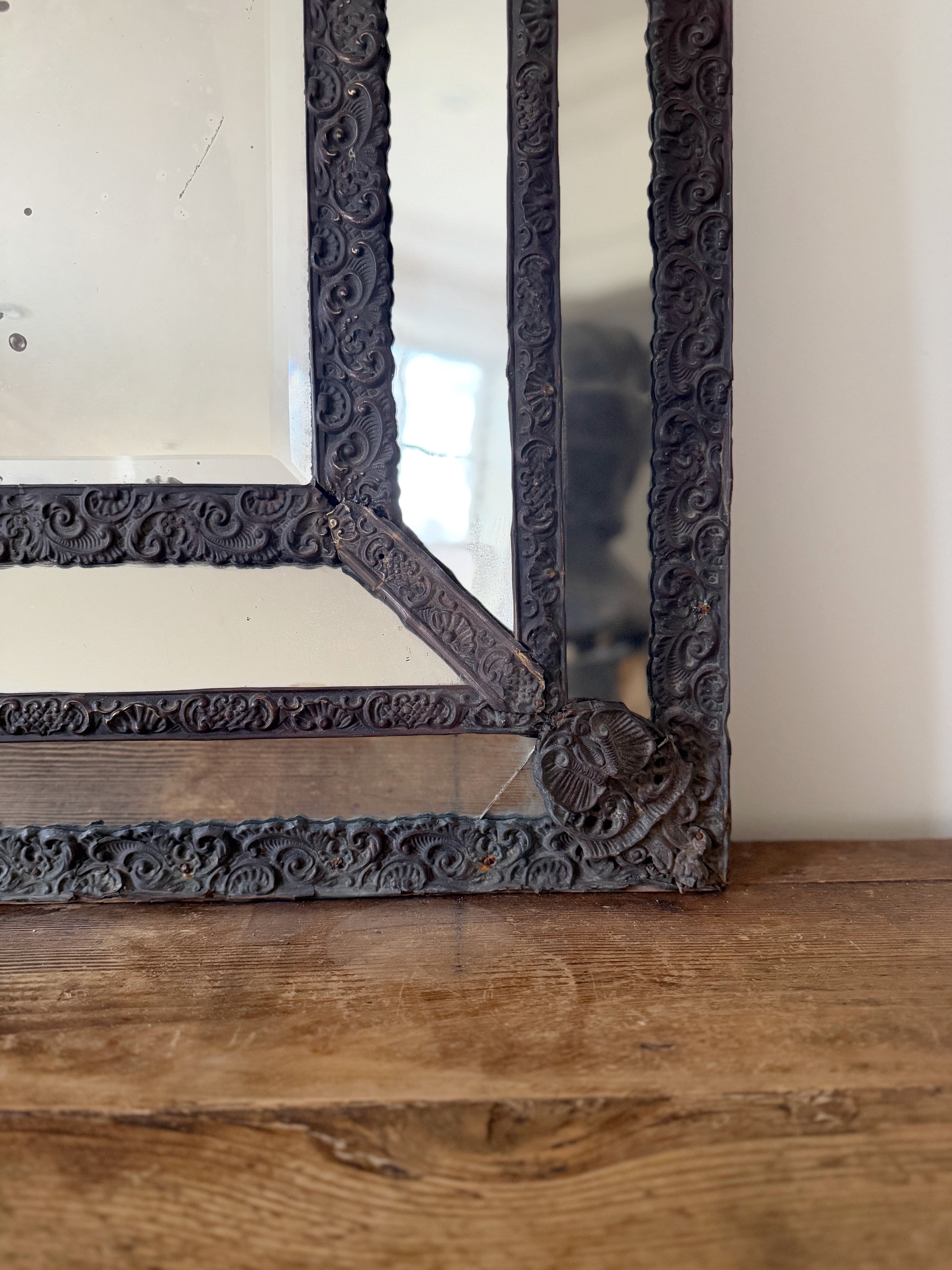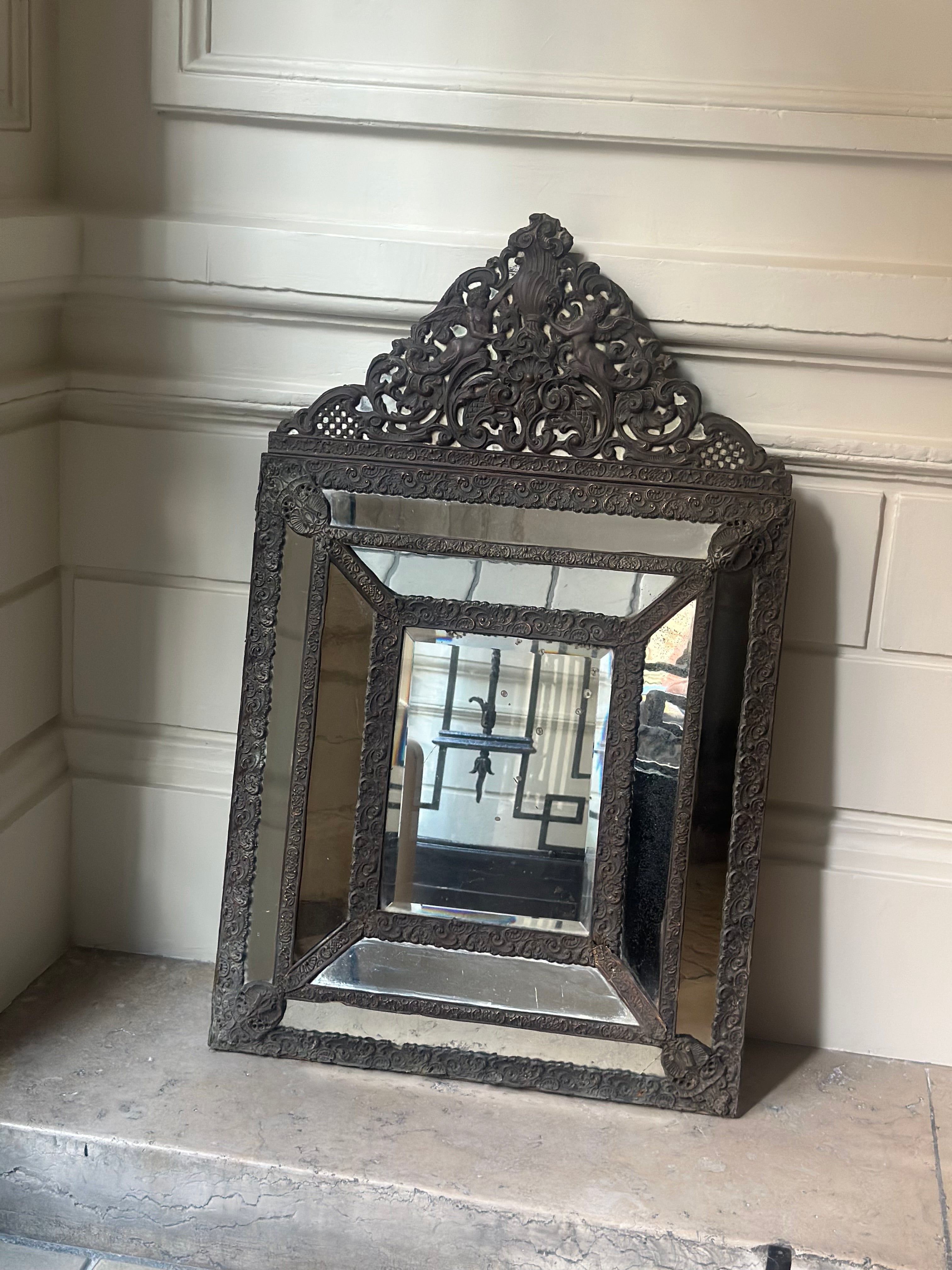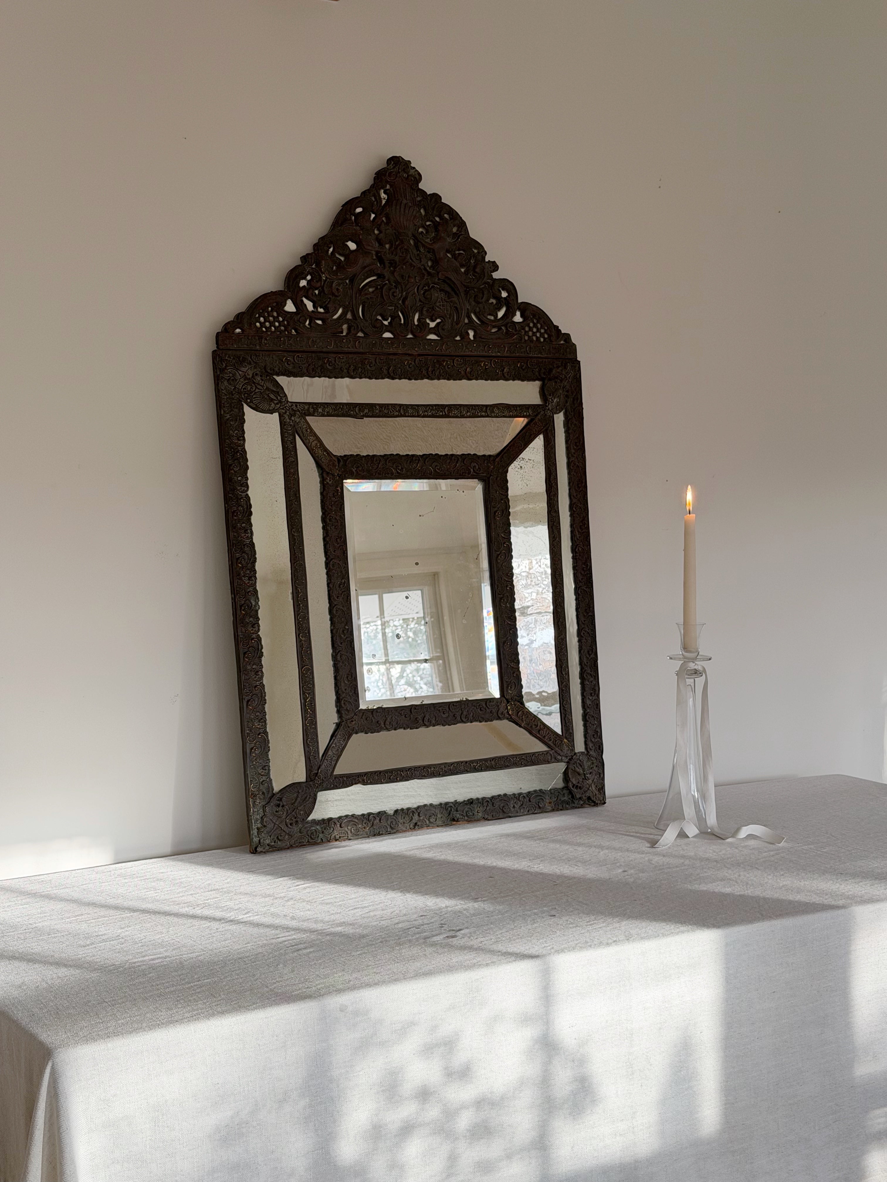 Crafted in the Napoléon III era of the late 19th century, this French repoussé mirror is a rare beauty in an unusually generous scale — especially remarkable given that mirrors of this style were typically made much smaller. Her raised metalwork — curling leaves, soft scrolls, and that sculptural pierced crest — speaks to the quiet grandeur found in rural French homes of the period.