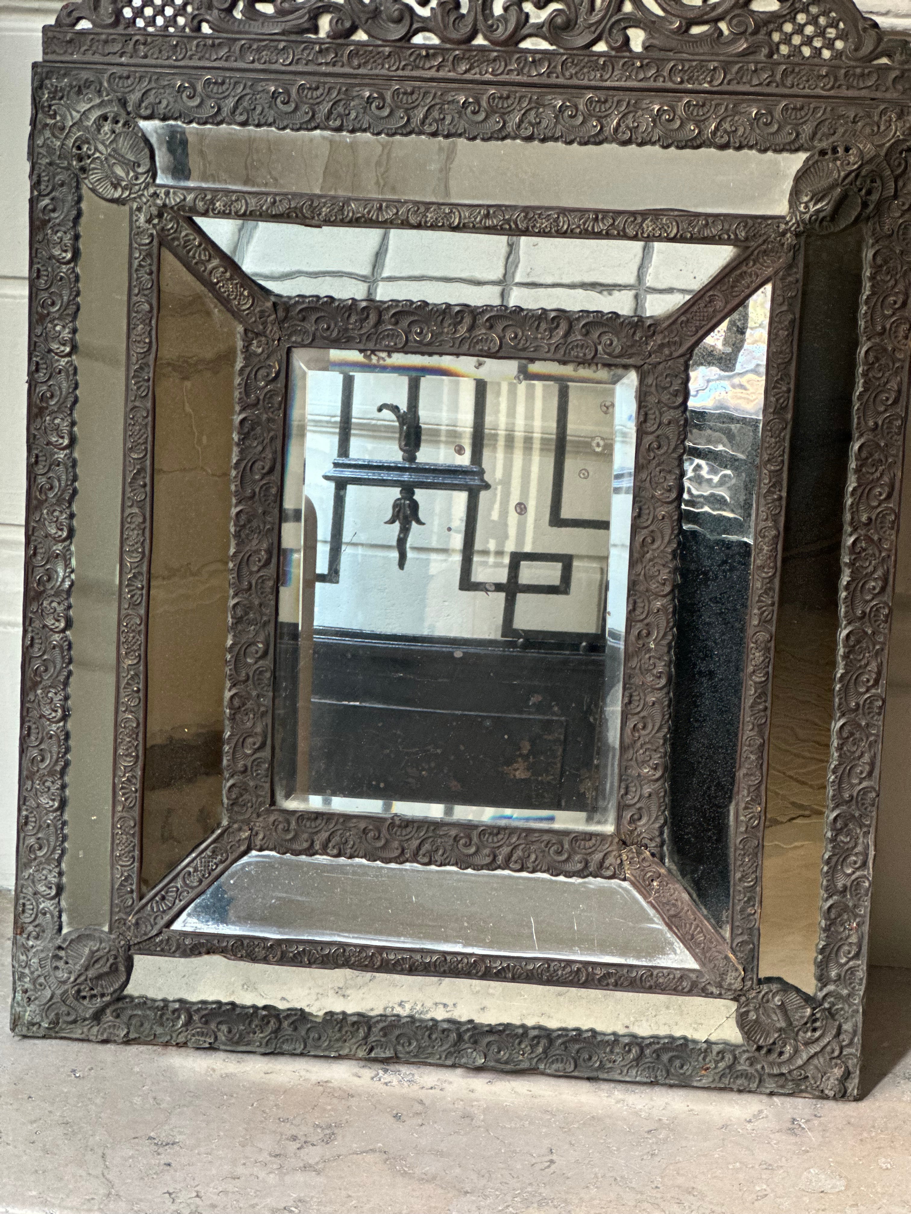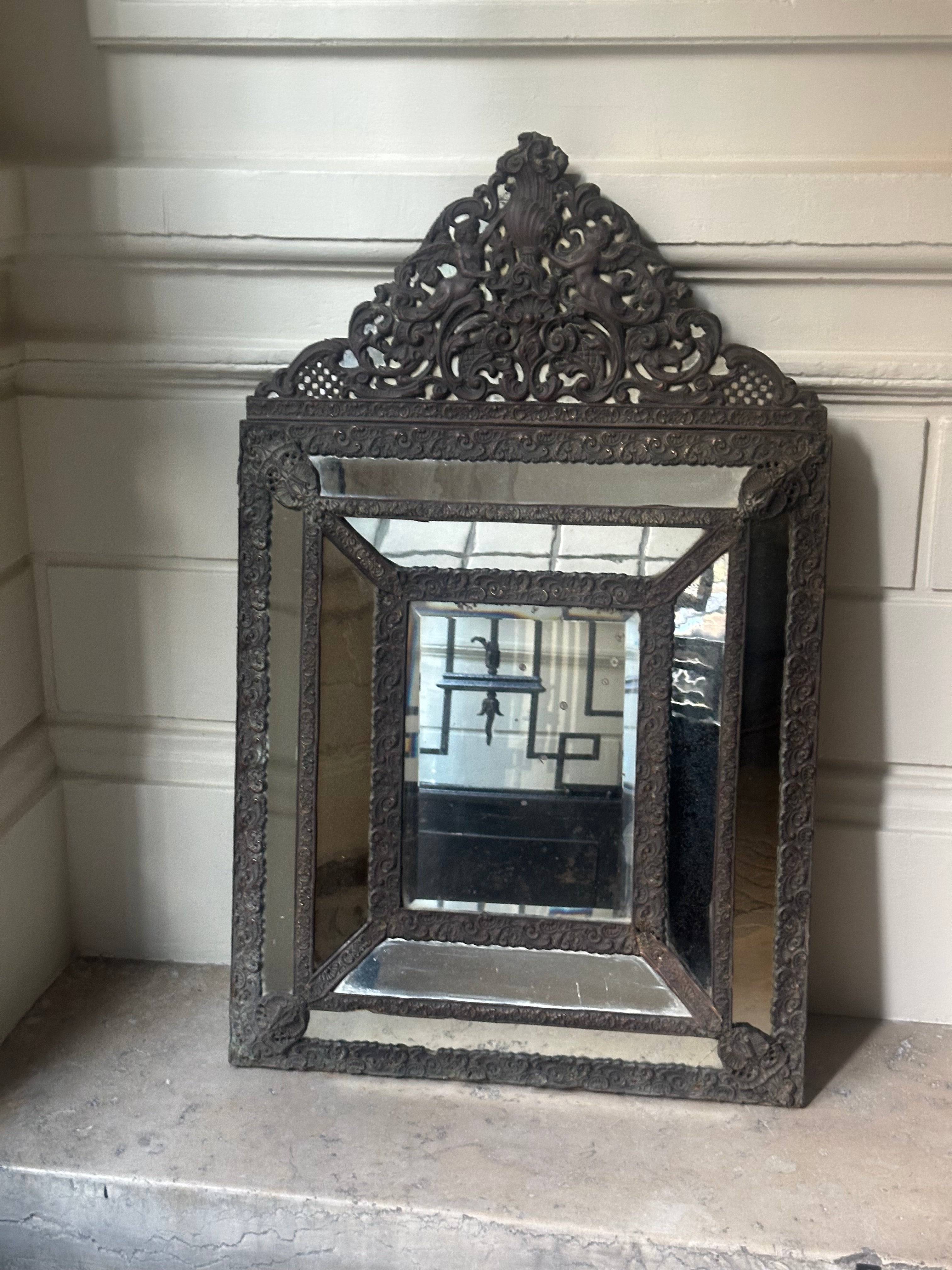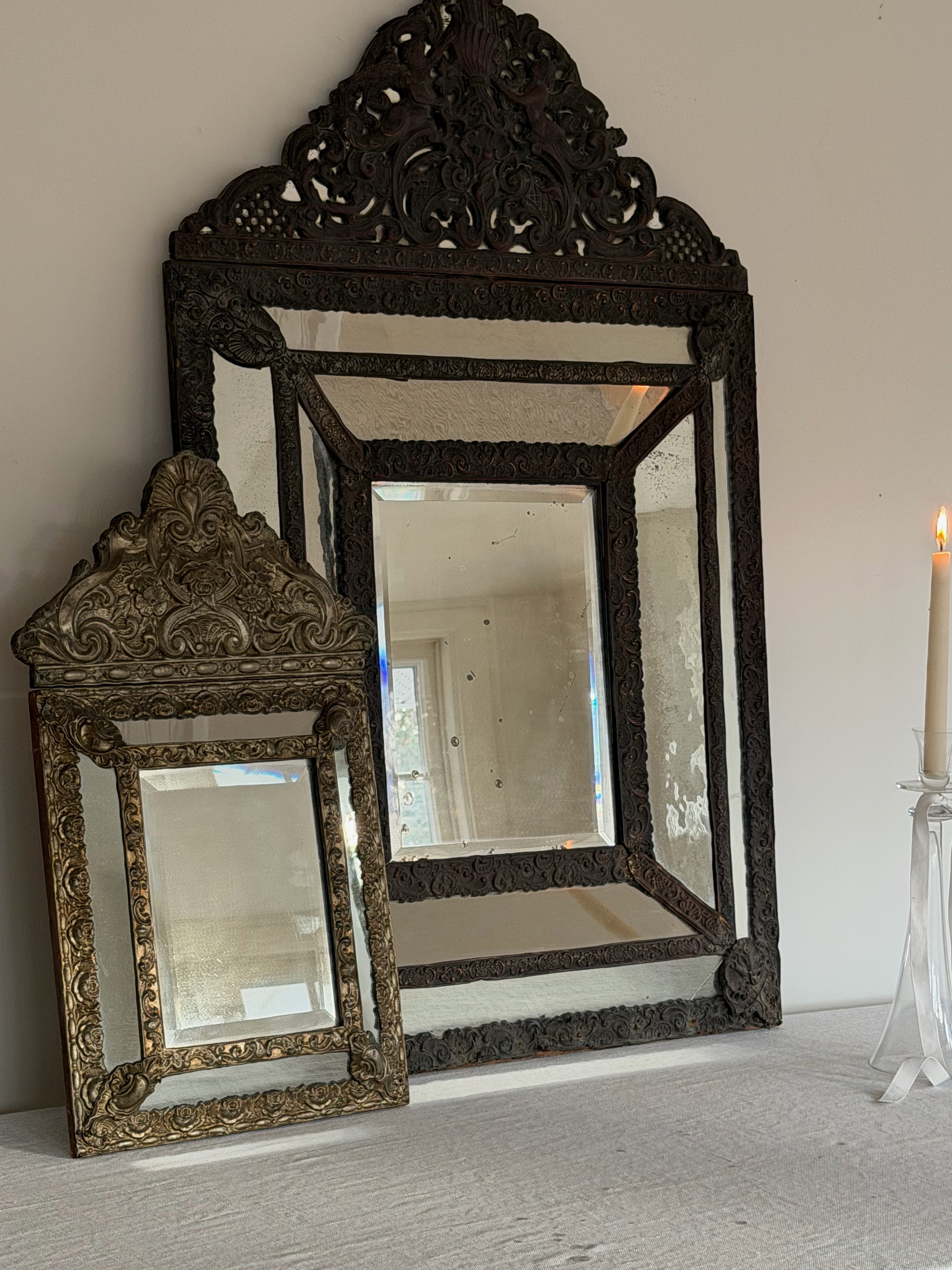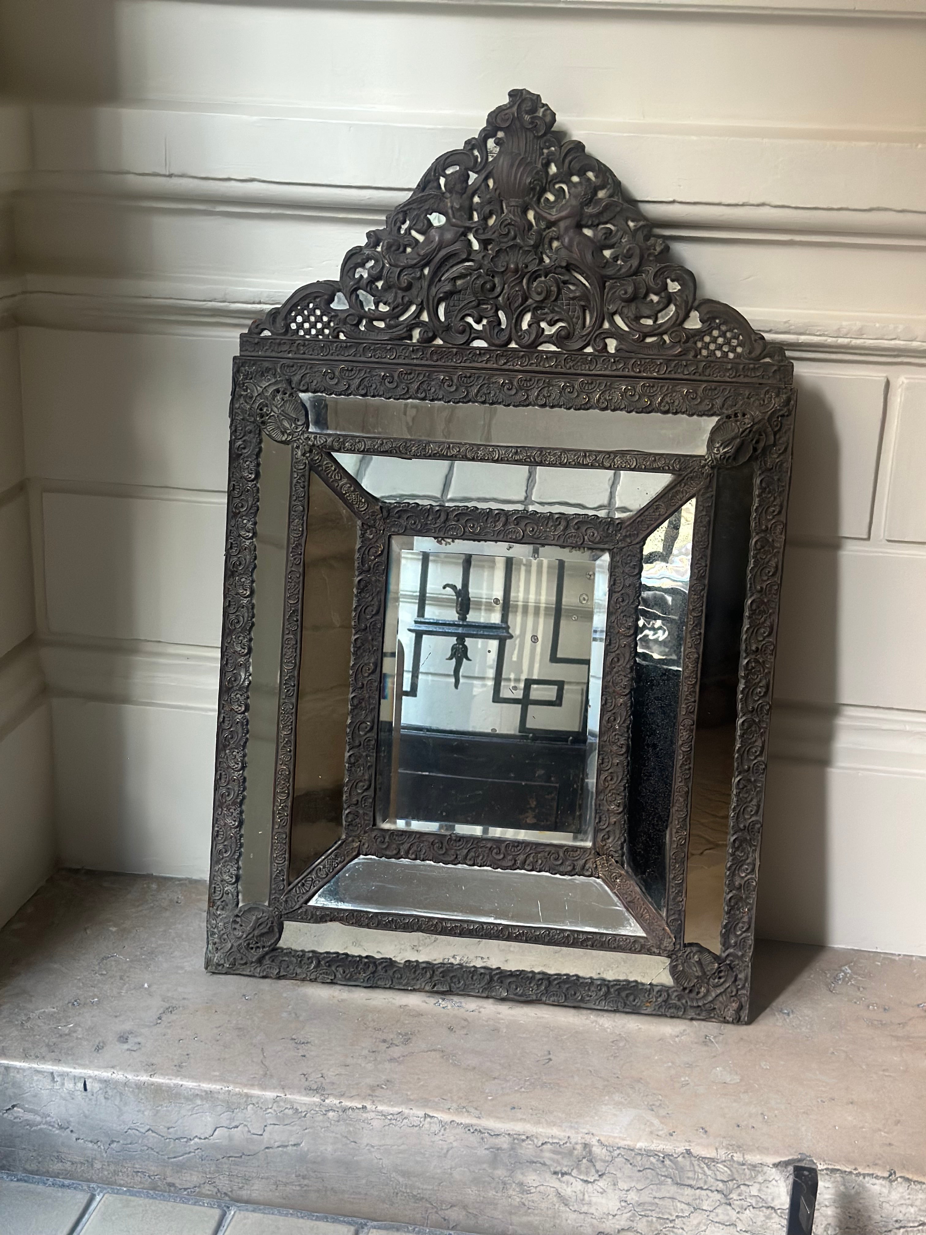 Crafted in the Napoléon III era of the late 19th century, this French repoussé mirror is a rare beauty in an unusually generous scale — especially remarkable given that mirrors of this style were typically made much smaller. Her raised metalwork — curling leaves, soft scrolls, and that sculptural pierced crest — speaks to the quiet grandeur found in rural French homes of the period.