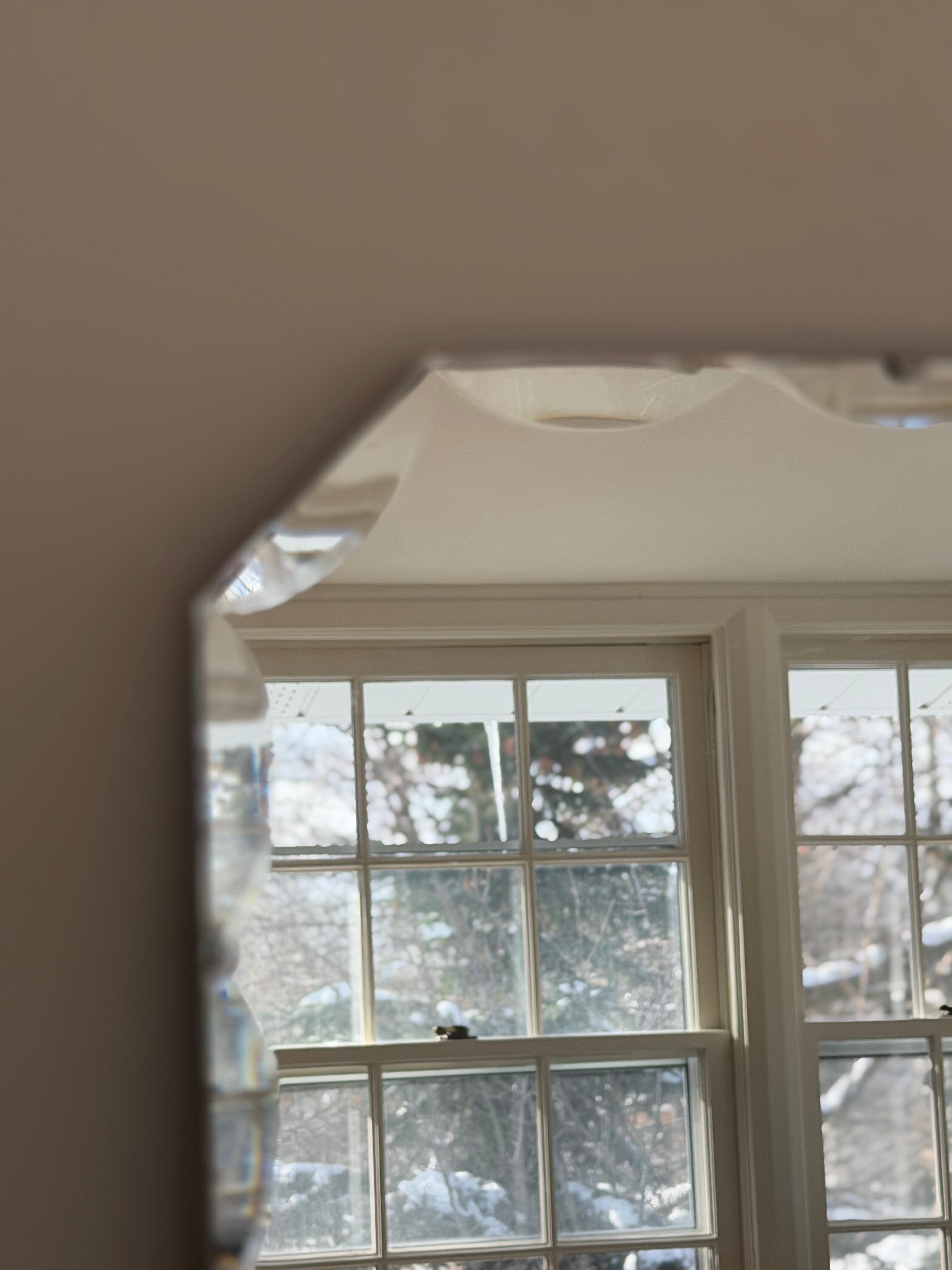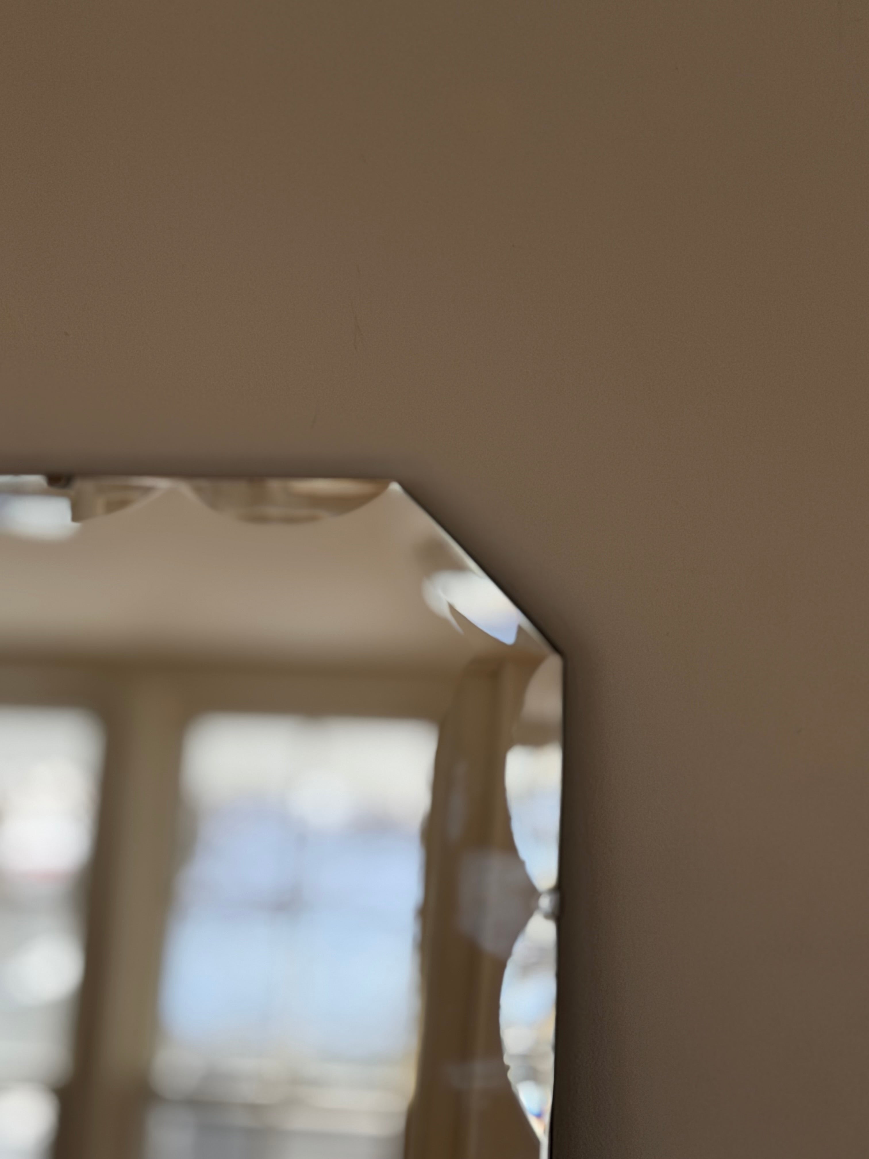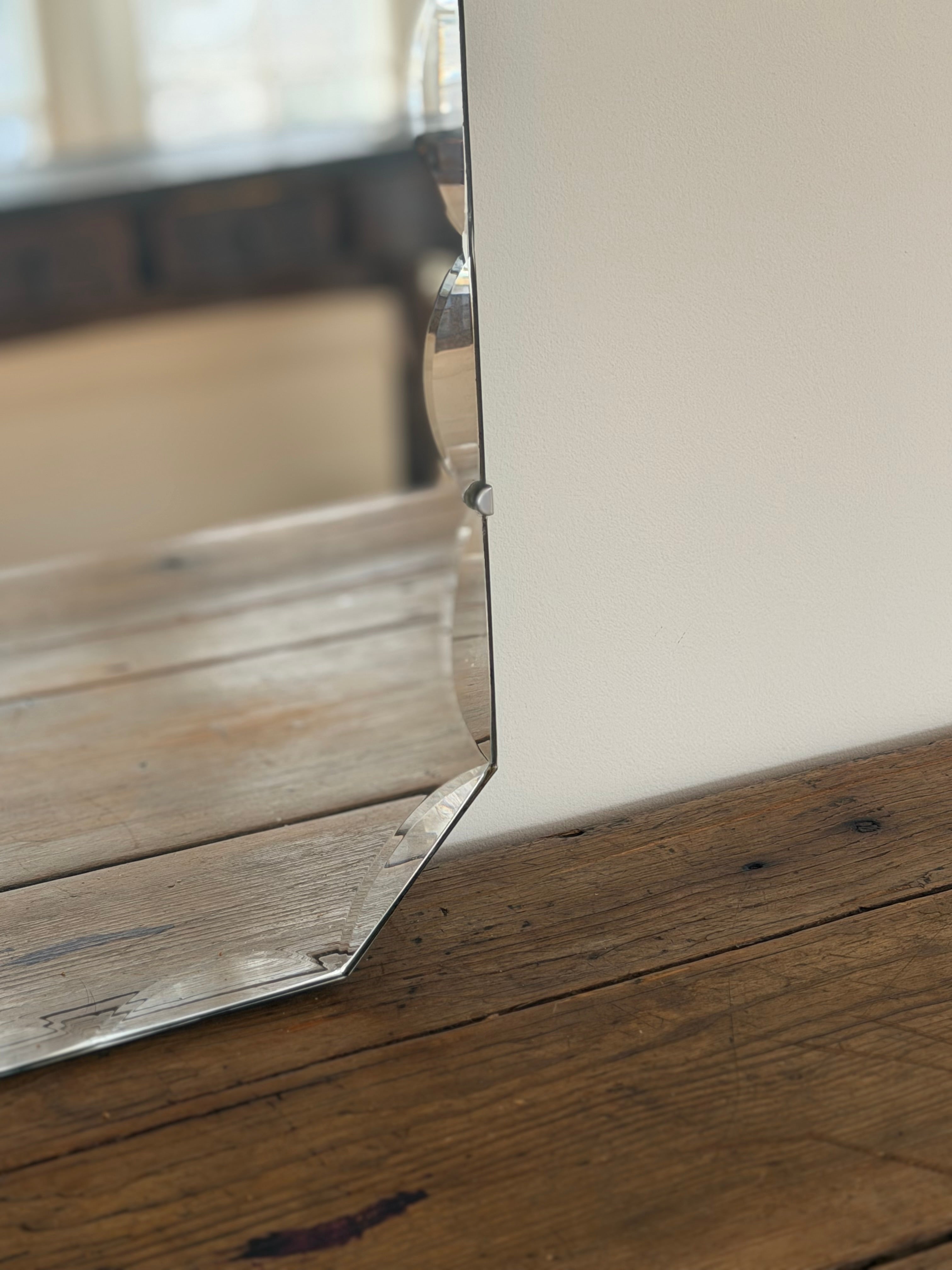 A softly timeworn mirror with a gentle scalloped edge, likely dating to the mid-20th century. The hand-cut glass catches light beautifully, creating a subtle play of reflection that feels warm rather than sharp.
