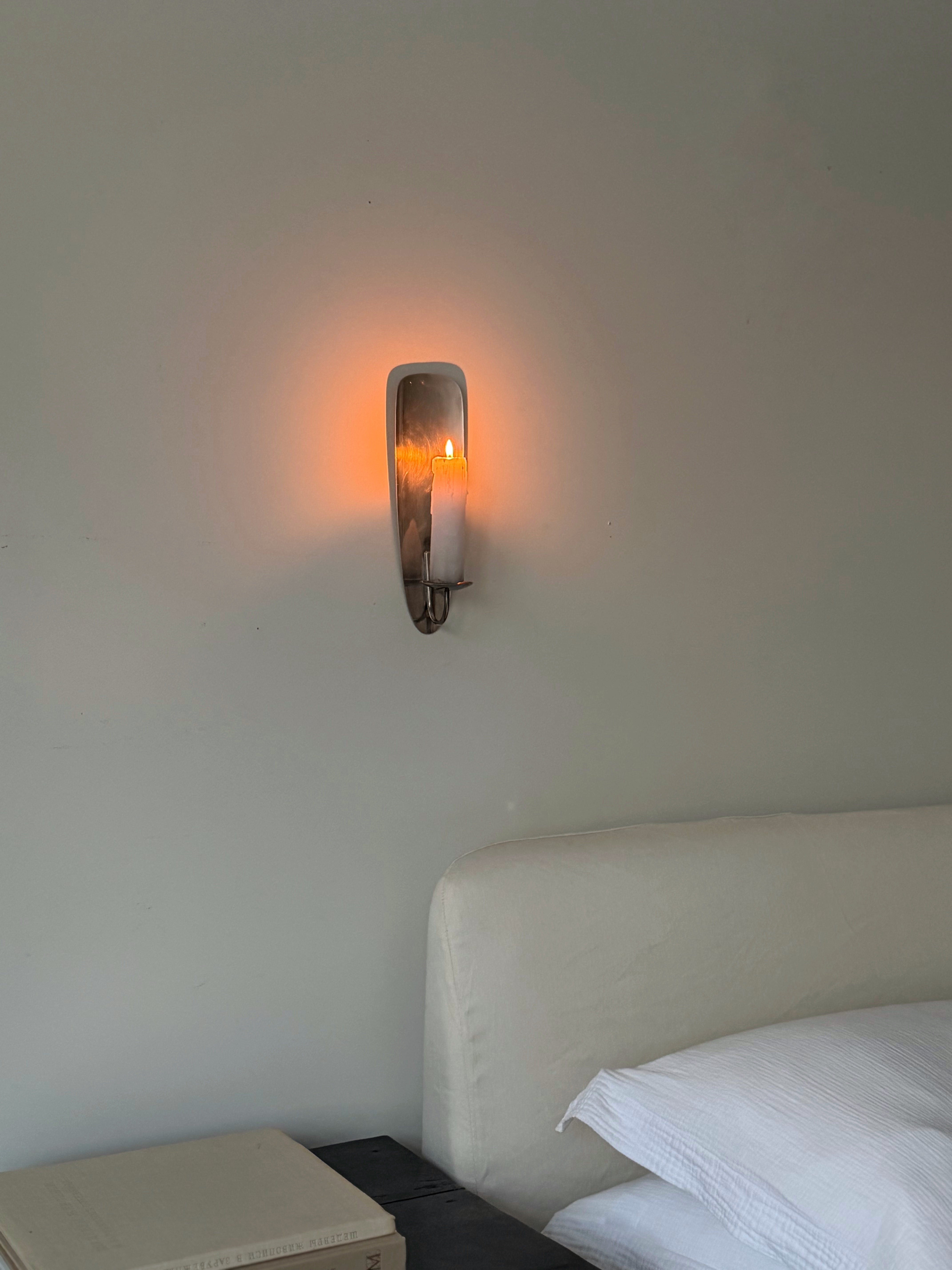 Designed to hold a single taper candle, the piece features a small drip tray and a beautifully balanced profile — simple, intentional, and refined. Its clean lines and thoughtful proportions make it an easy addition to a hallway, bedroom, powder room, or layered beside a favourite mirror.