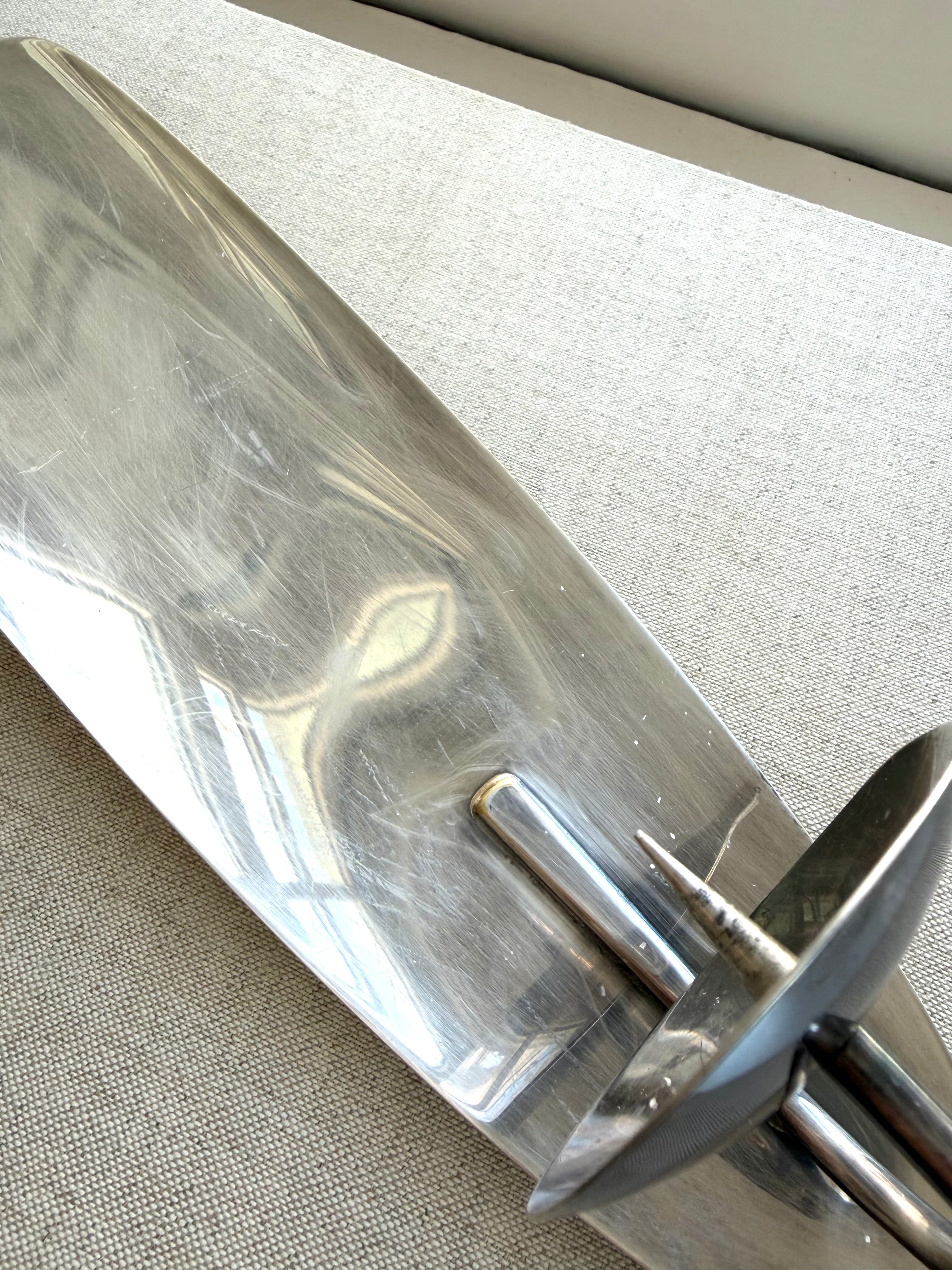 A quietly striking vintage wall sconce with a sculptural, elongated silhouette. The polished chrome surface curves gently against the wall, reflecting light in a soft and subtle way.