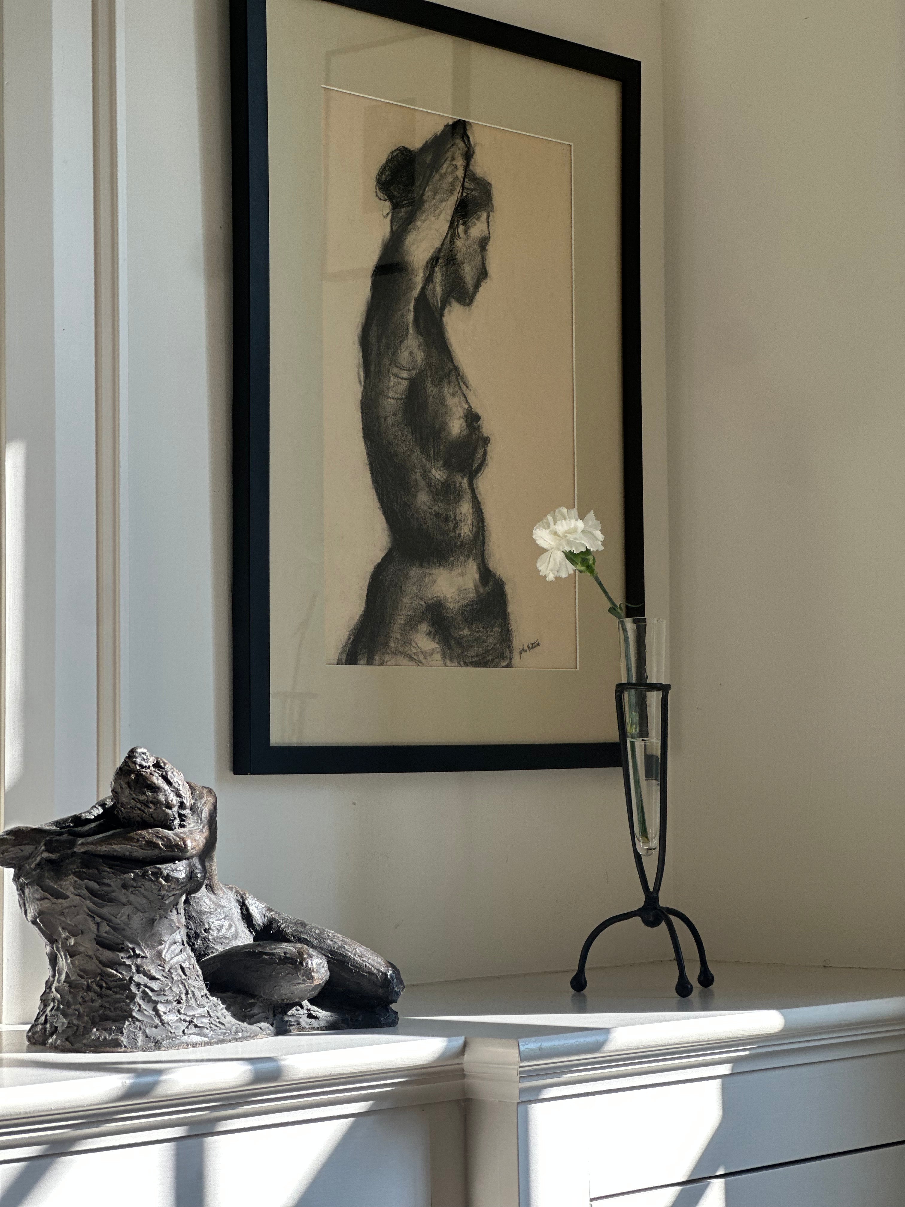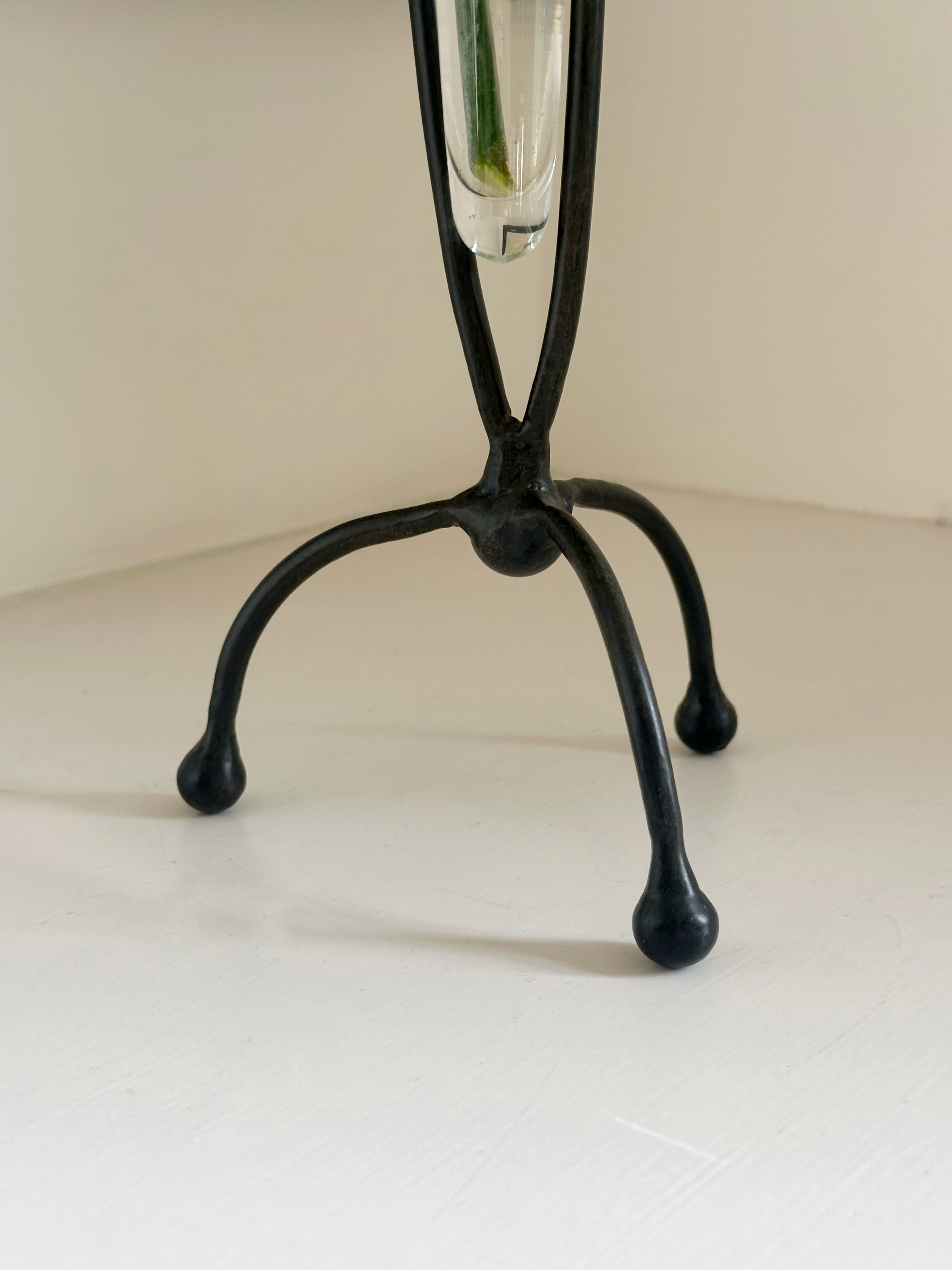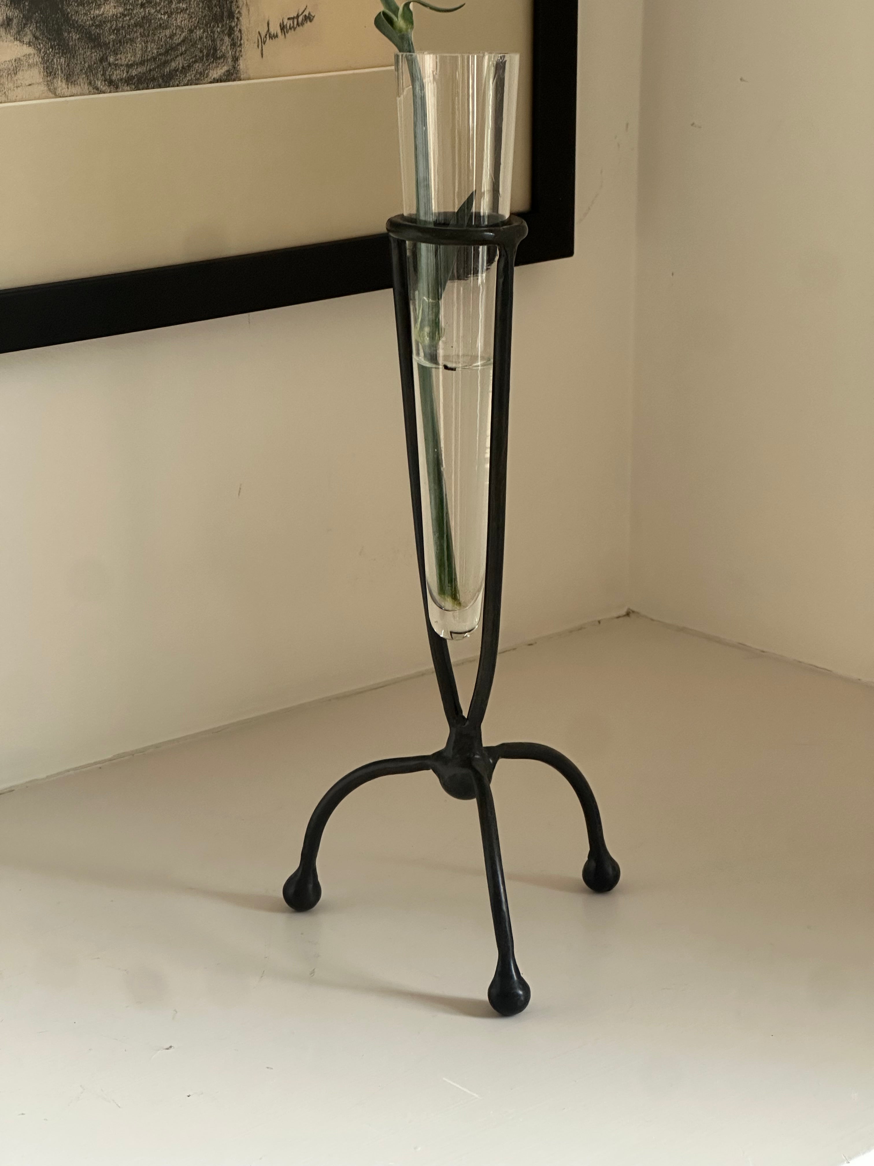 A delicate way to display a single bloom. A clear glass tube rests within a slender iron tripod stand, giving this piece both balance and presence. Perfect on a desk, nightstand, or windowsill, it highlights the quiet beauty of a single flower or cutting. The patinated frame adds a sculptural contrast, making it as much an art object as a vessel—proof that sometimes one flower is all you need.