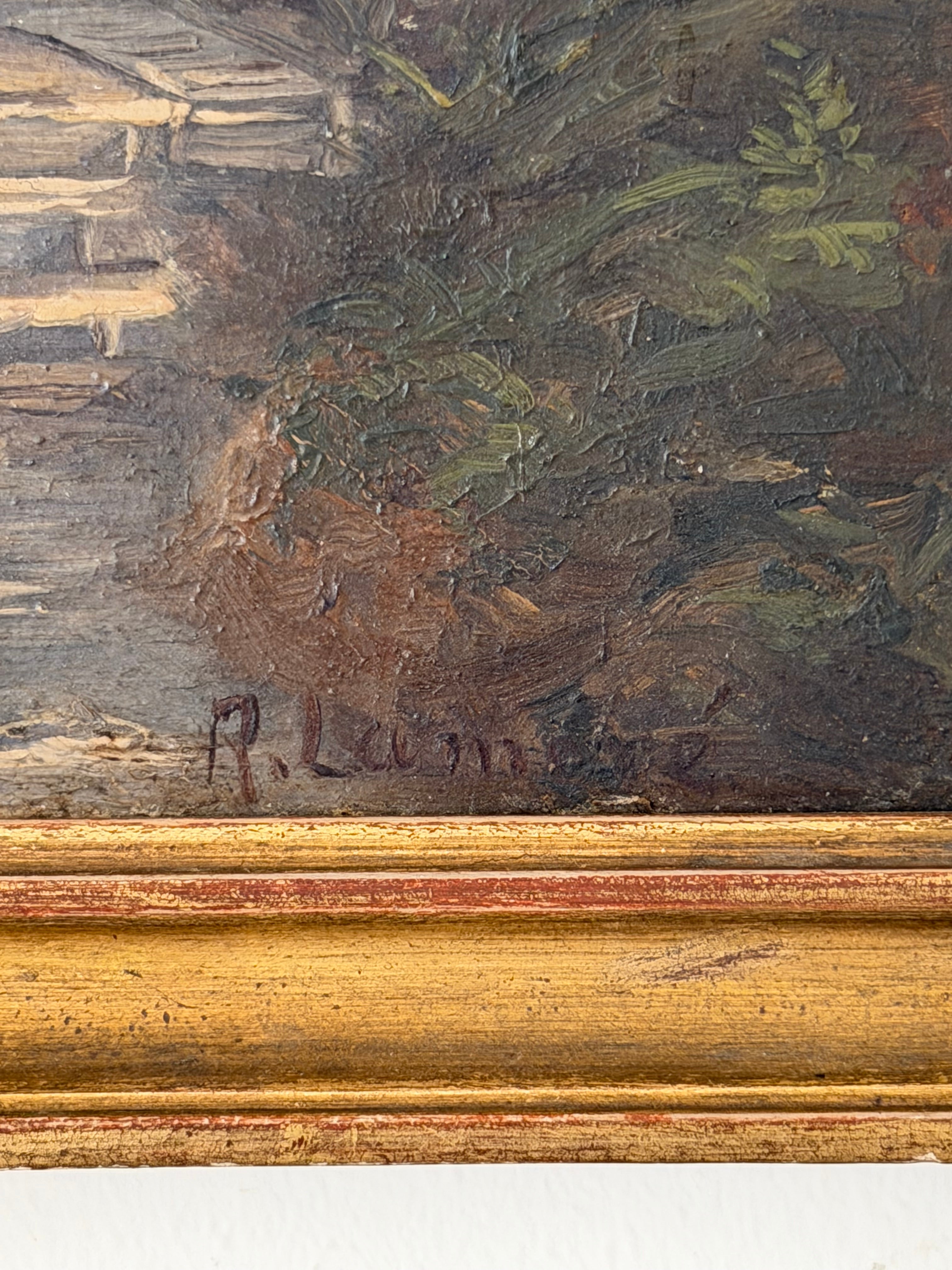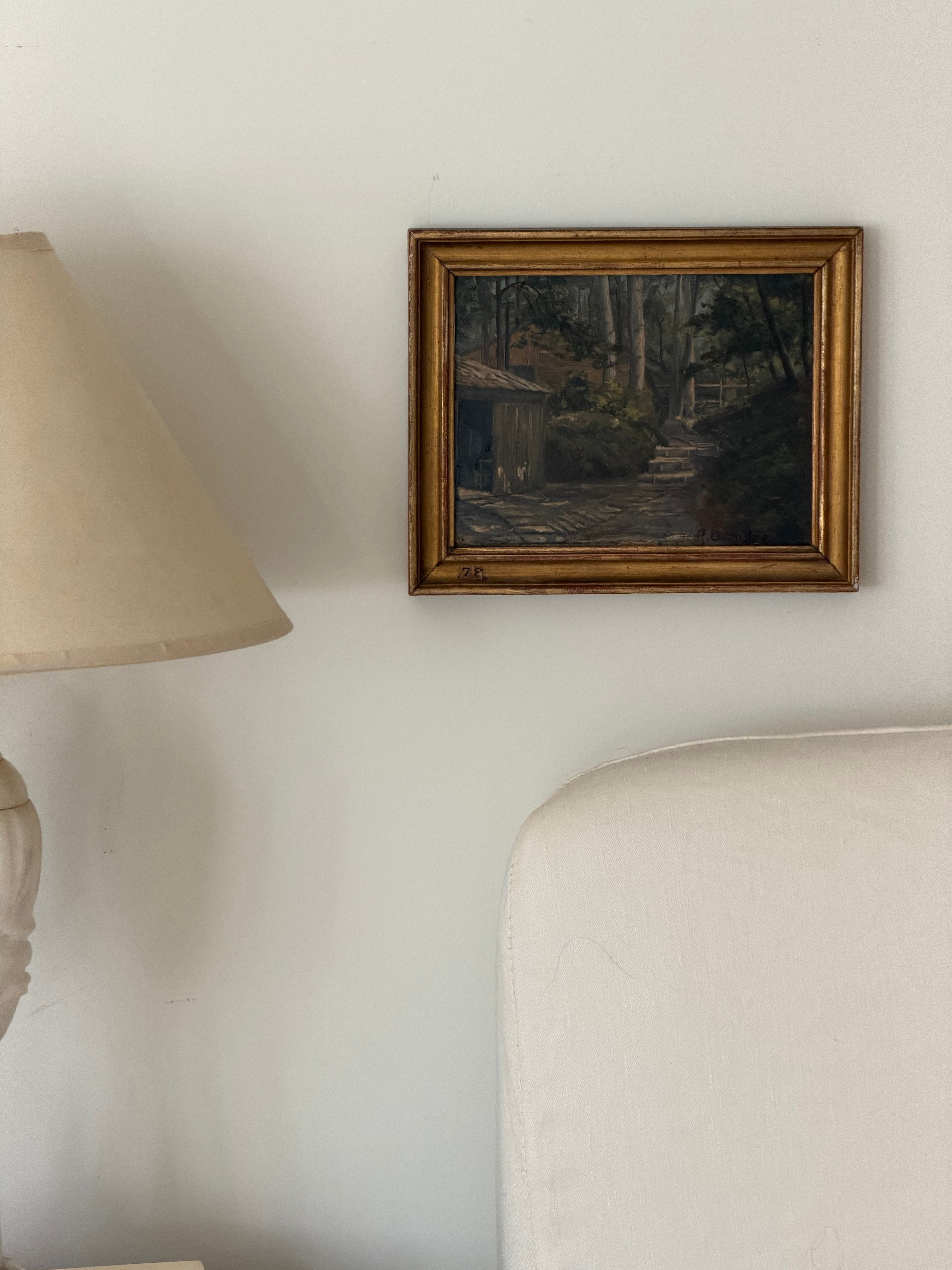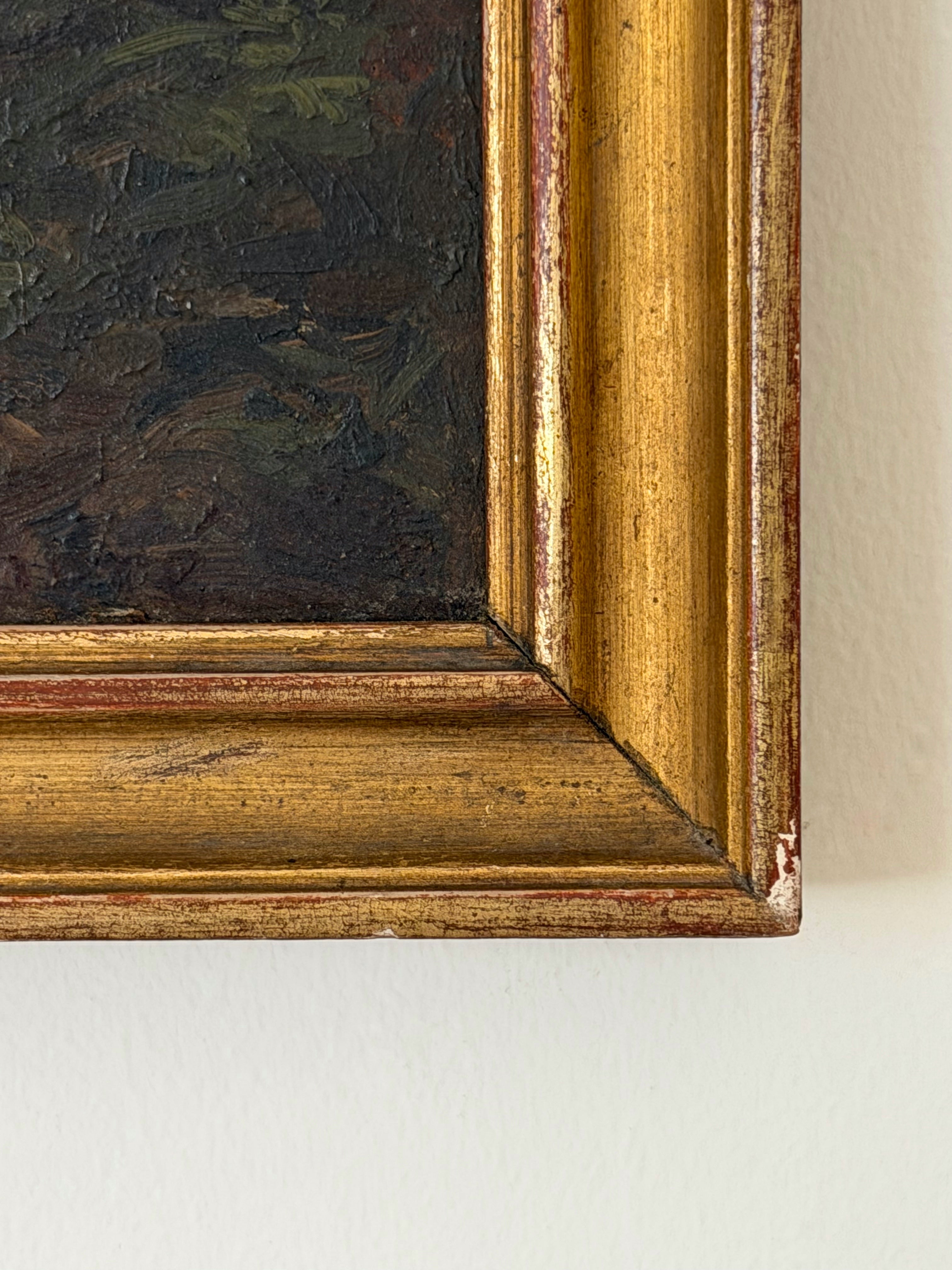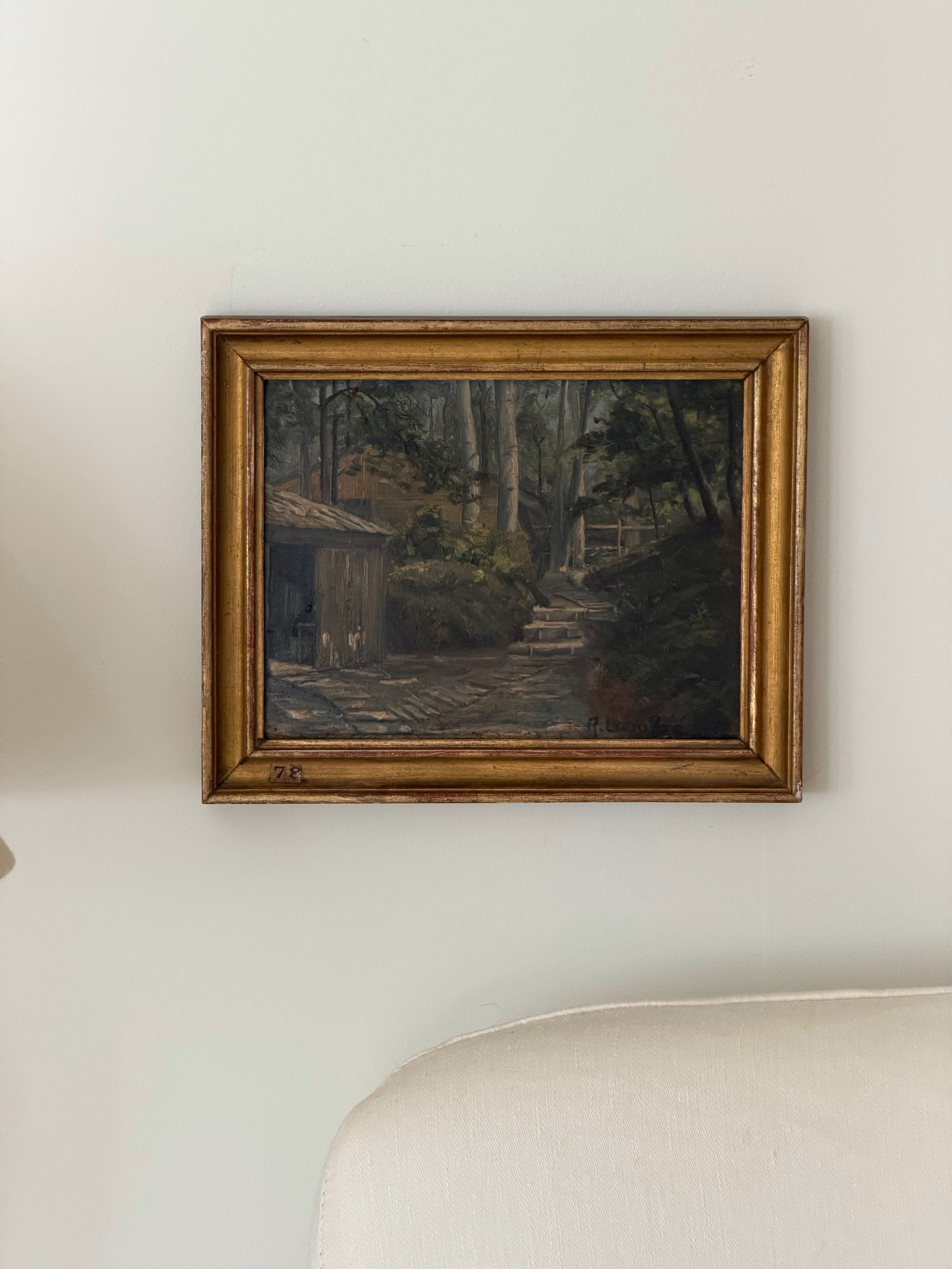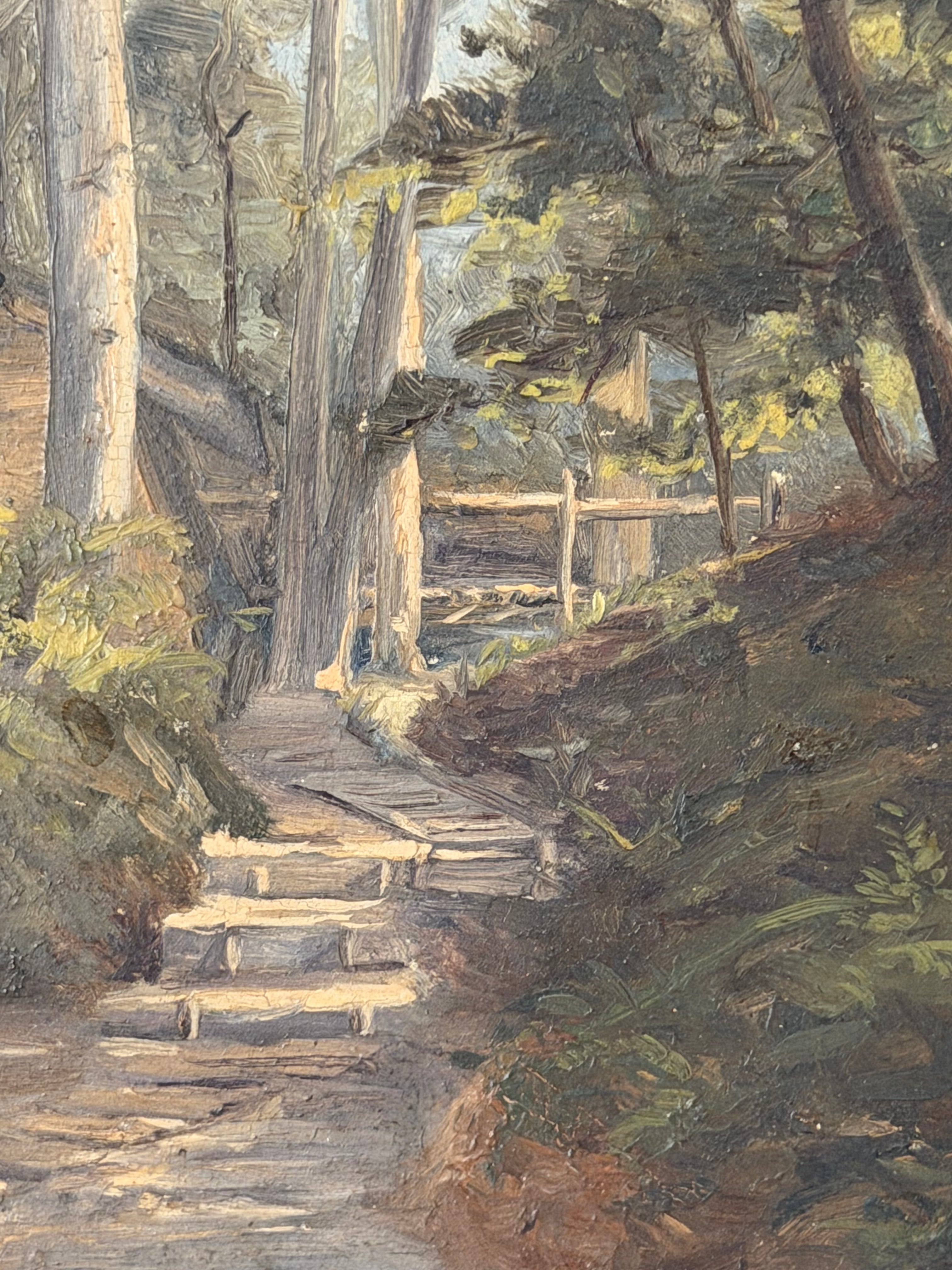 A small antique landscape depicting a shaded footpath leading into the woods. The palette is cool and muted — deep greens, soft charcoal, and quiet earth tones — giving the painting a grounded, inward mood.