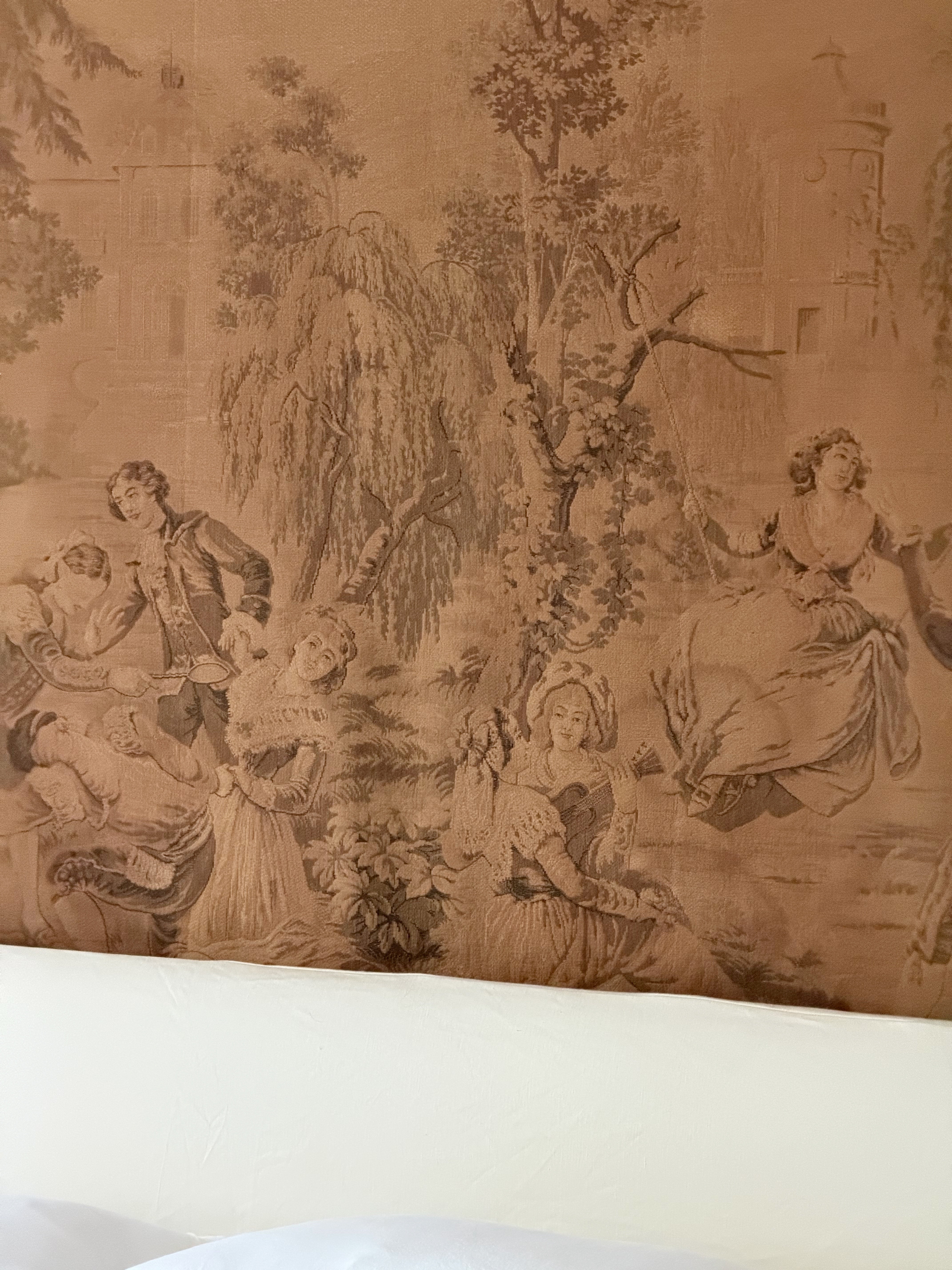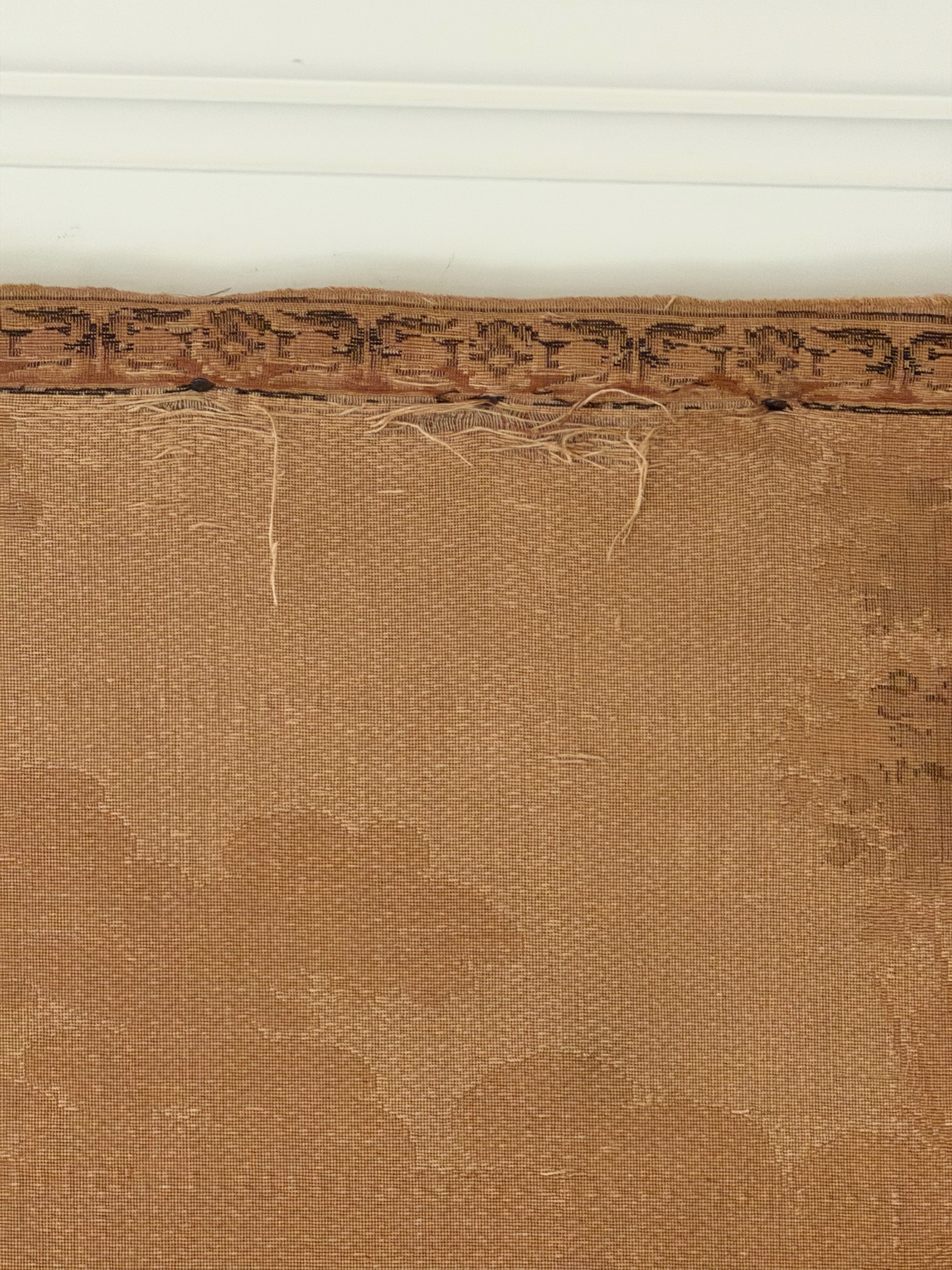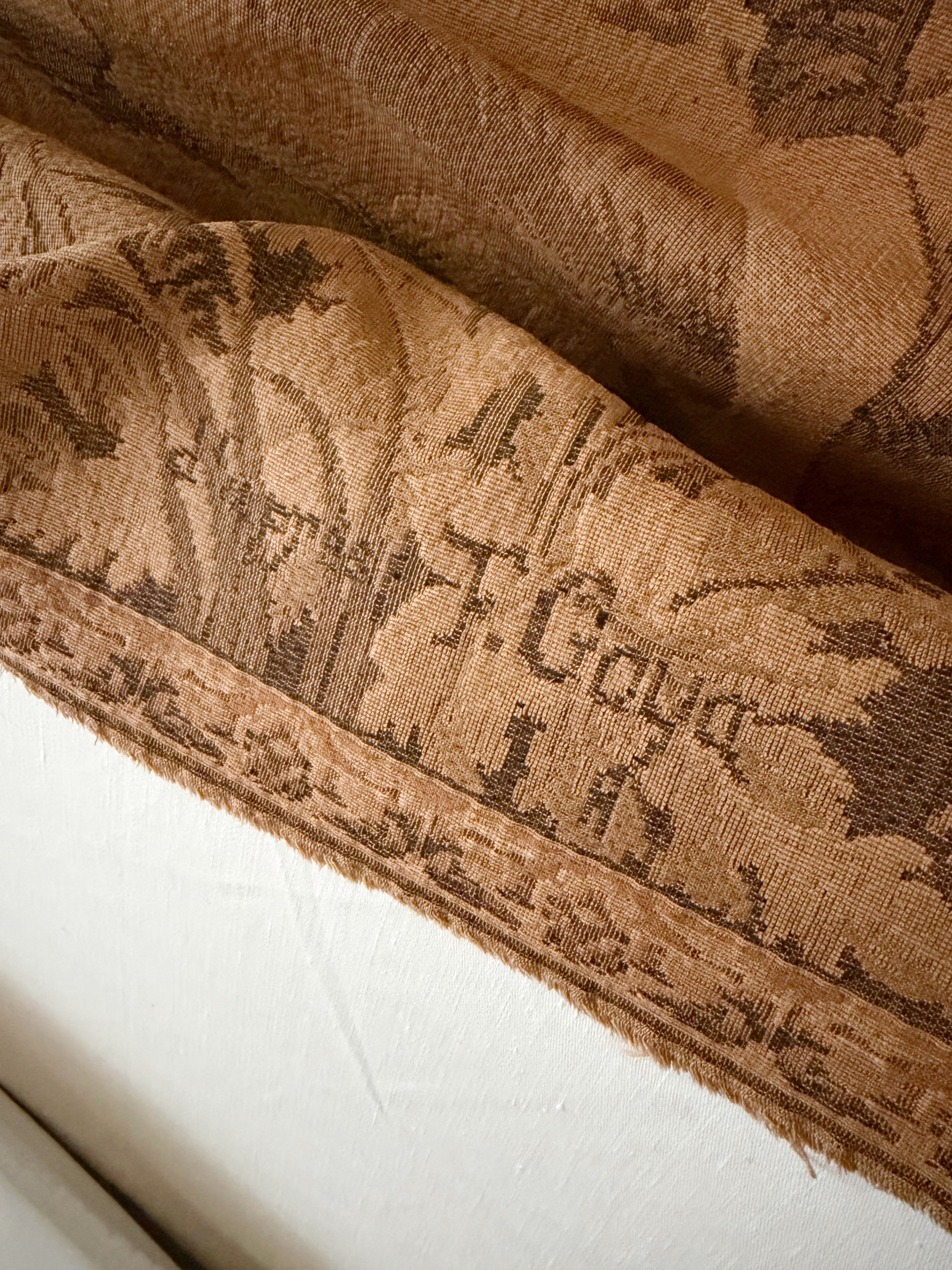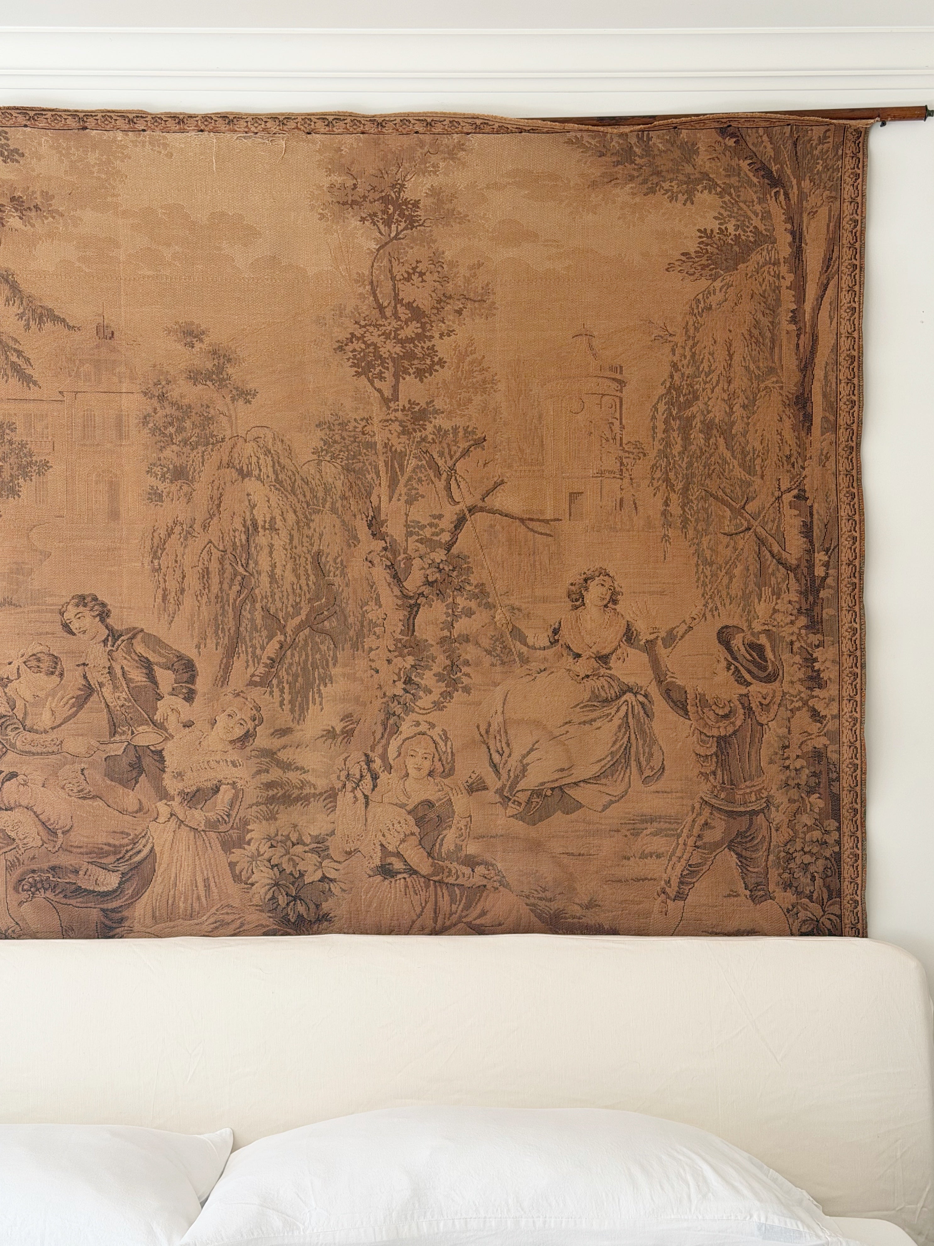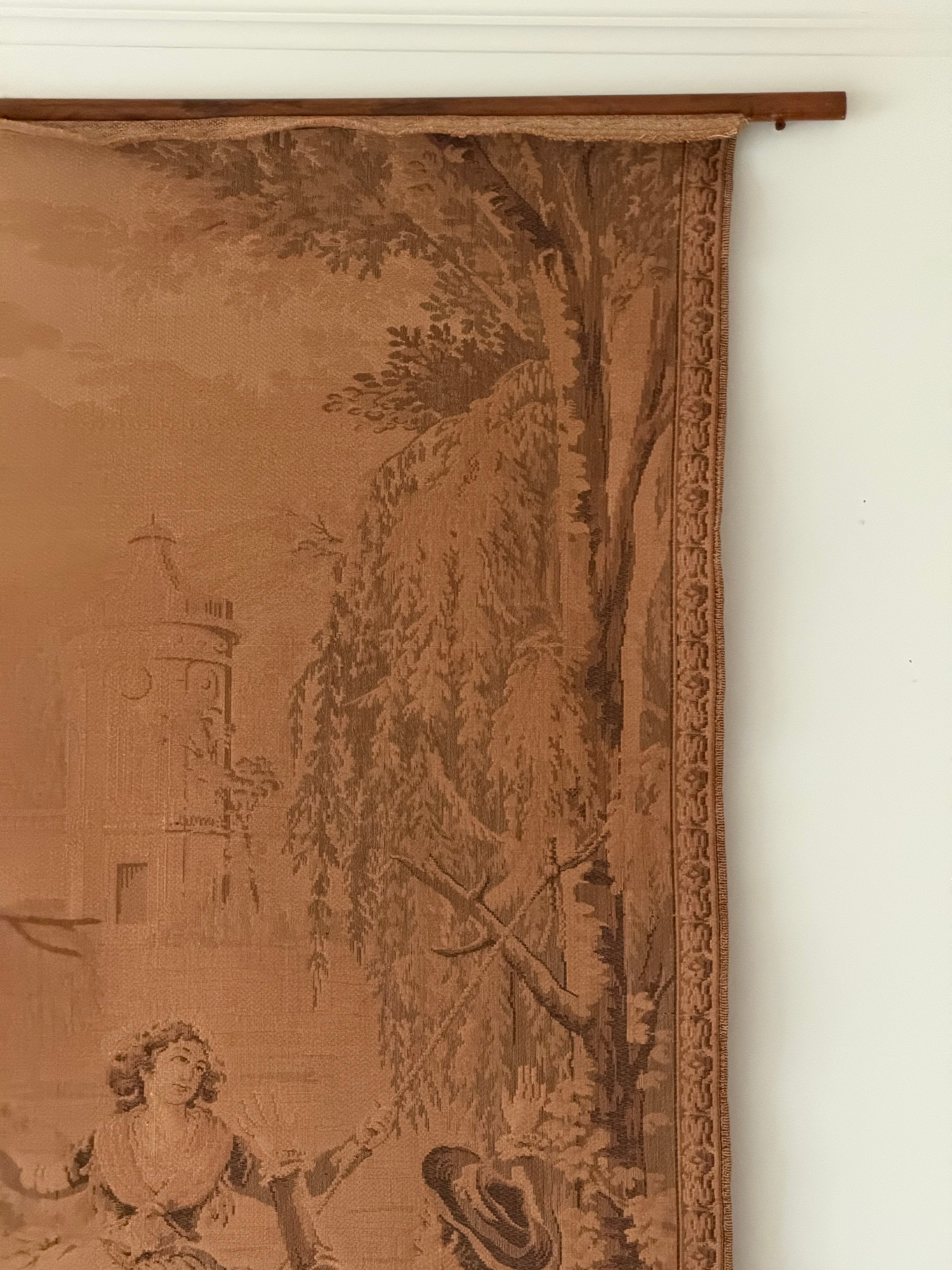 Sepia pieces are already rare, especially those in a larger width, and this one has that expansive, room-anchoring presence that’s so hard to come across. Still on its original rod, it hangs beautifully and brings an unmistakable note of old-world romance to any room.