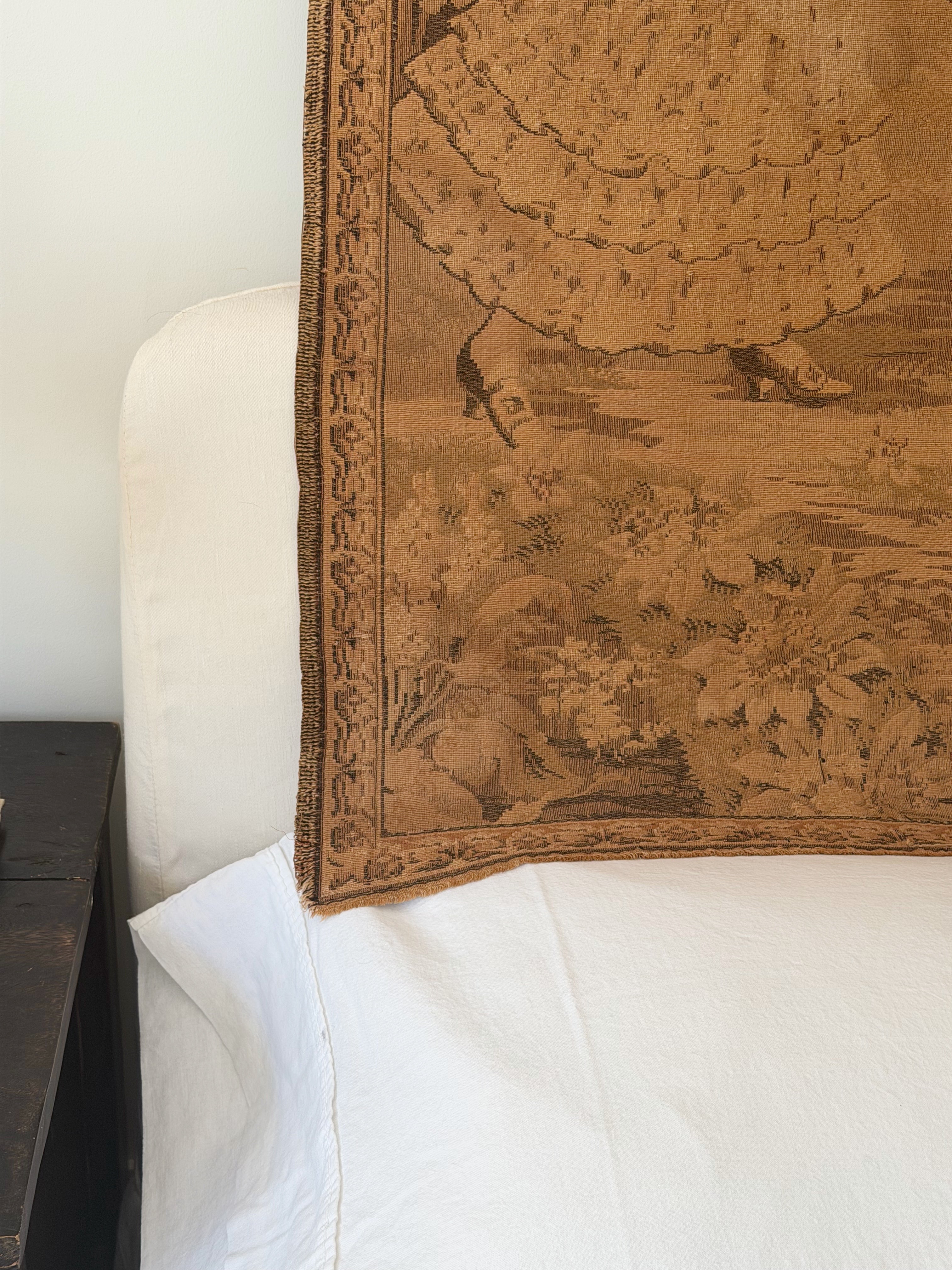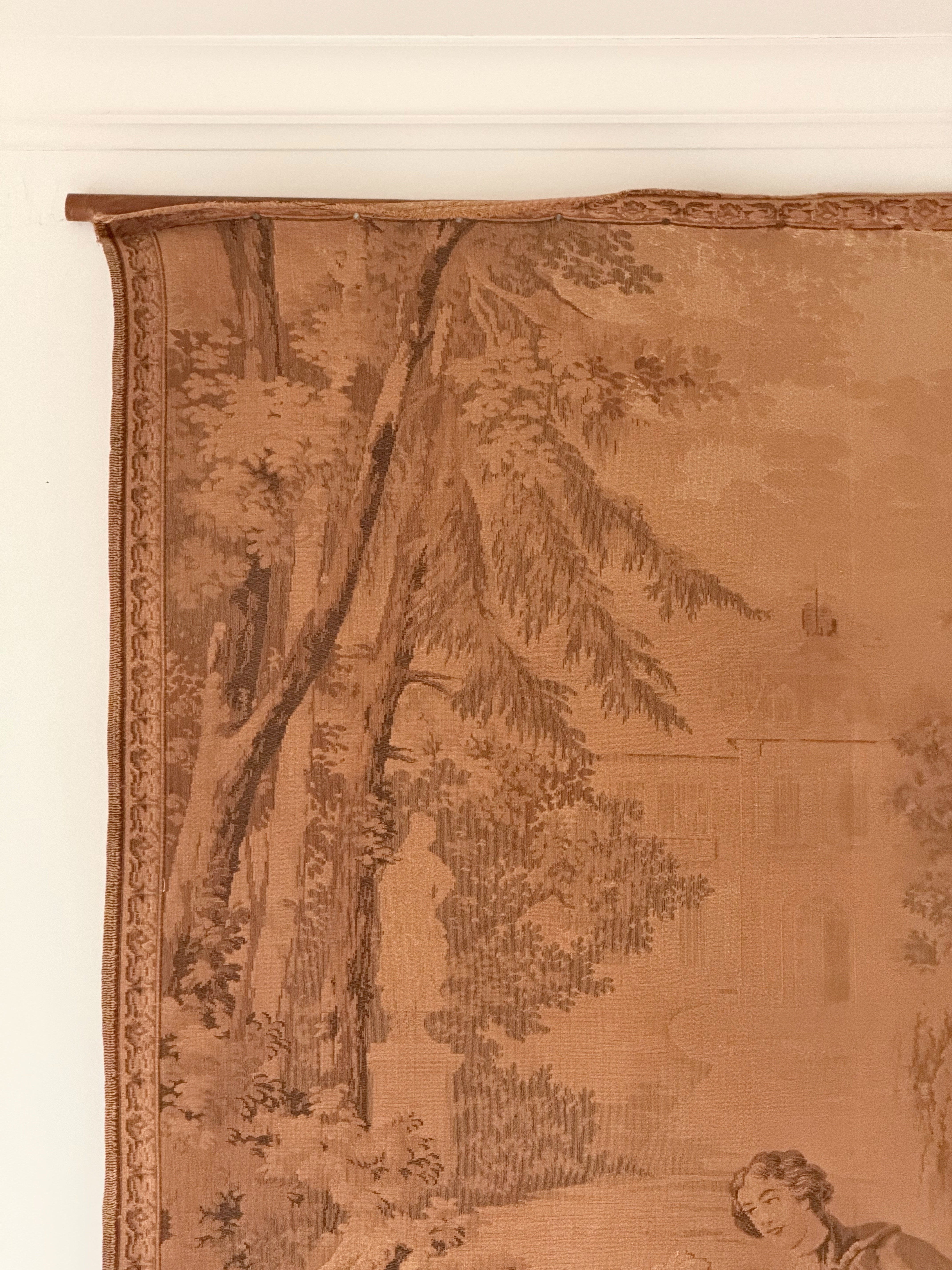 A lush antique French tapestry woven in warm sepia tones, carrying that quietly poetic softness only monochrome textiles can hold. The landscape feels rich and atmospheric — tall trees, gathered figures, and a distant château all rendered in a single, harmonious palette that glows gently with age, accented along the lower border by a woven inscription reading d’après F. Goya, a subtle nod to its artistic lineage.
