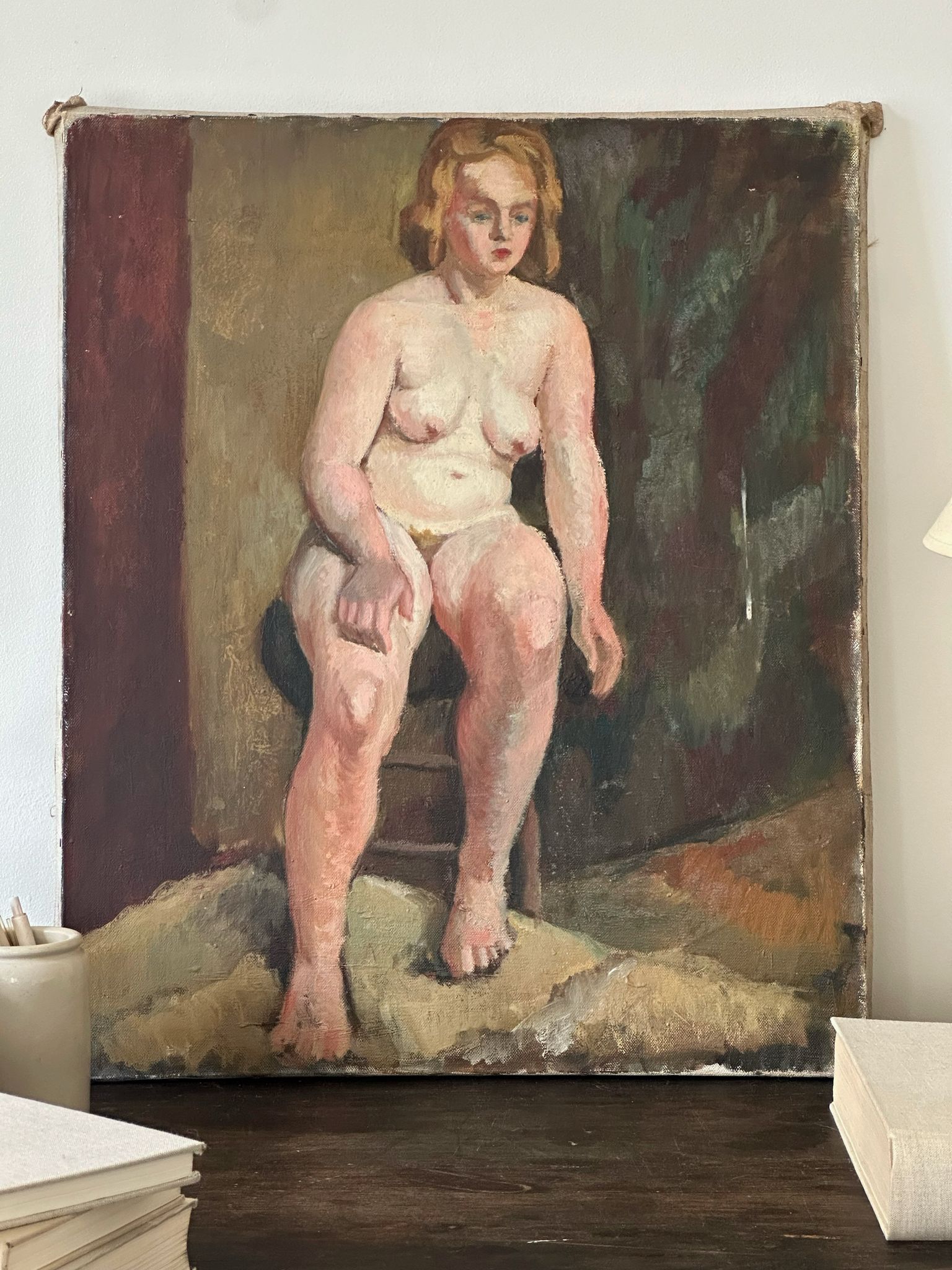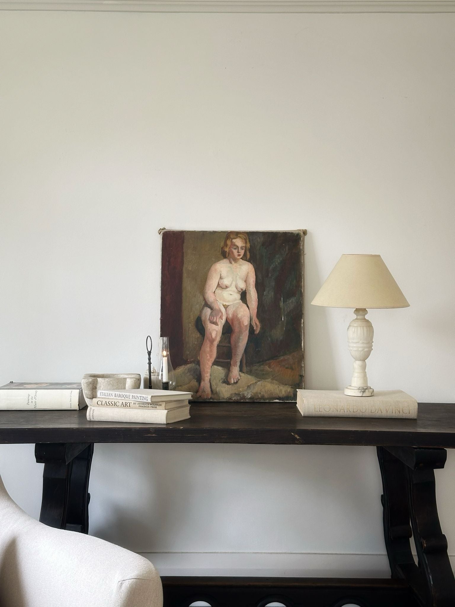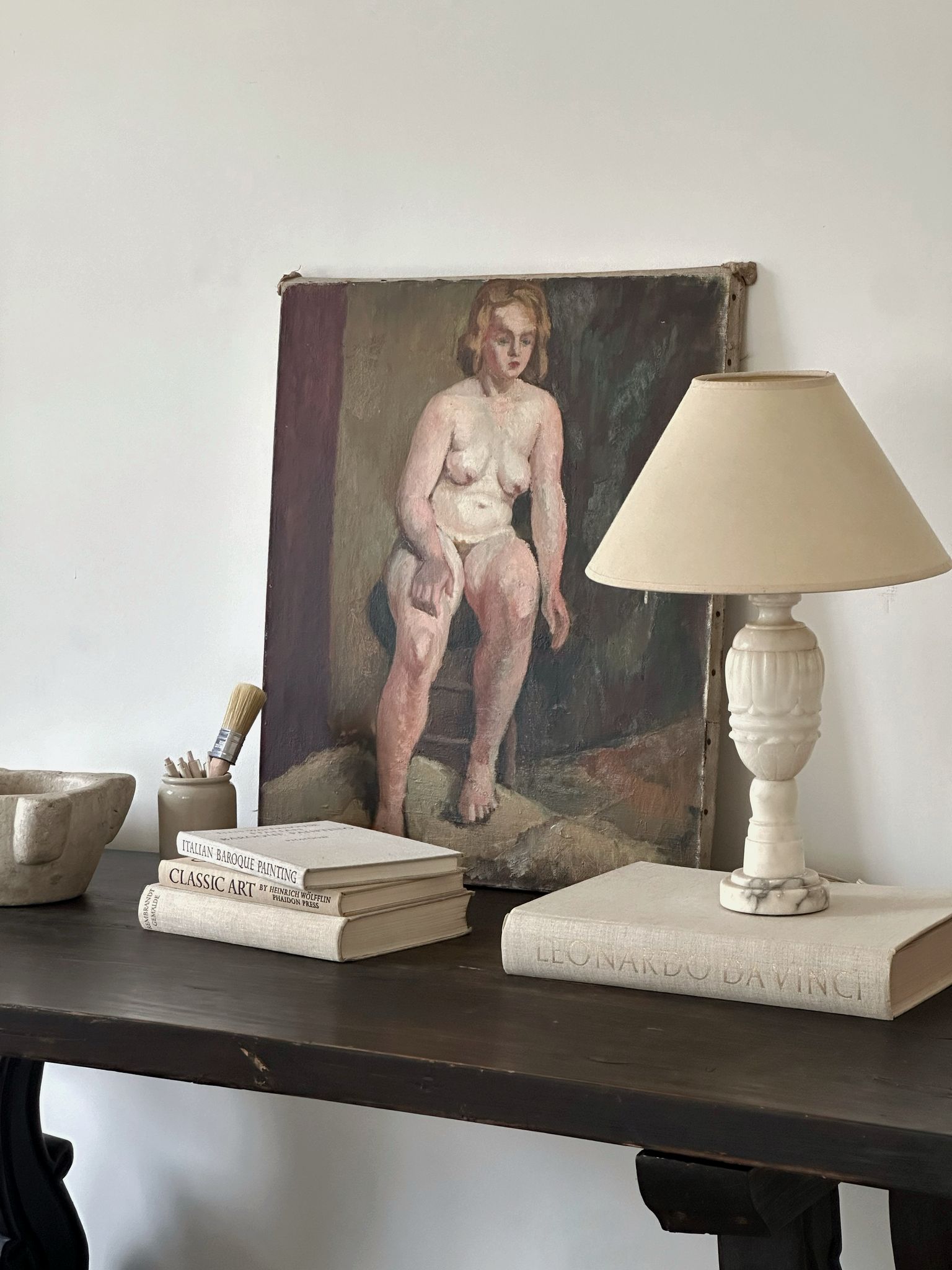 A quiet, painterly study of a seated figure, The Margaux carries a soft, timeworn beauty. Rendered in muted tones of clay, rose, and olive, she captures the human form in a way that feels both raw and tender—unposed, unguarded, and quietly alive.