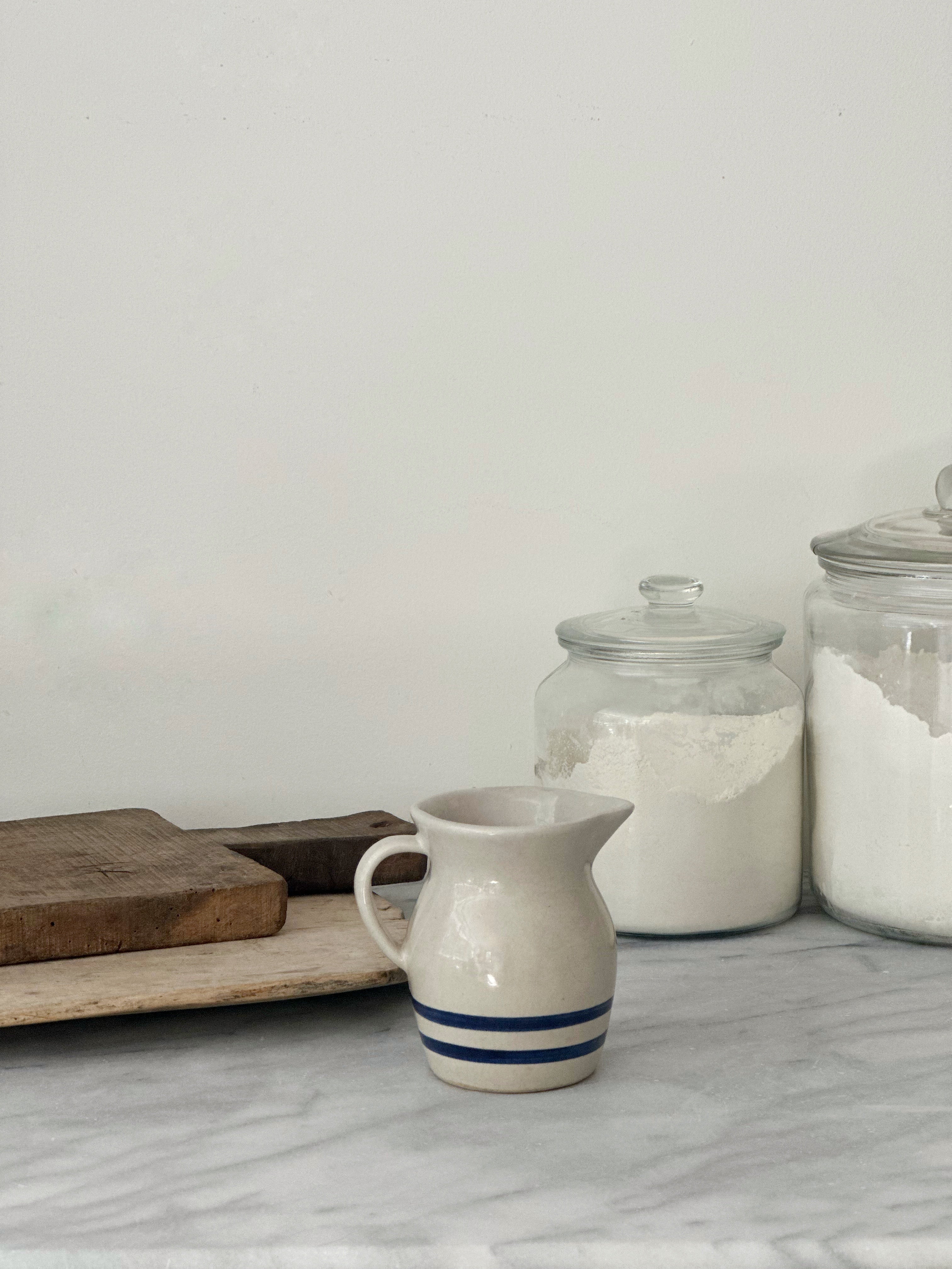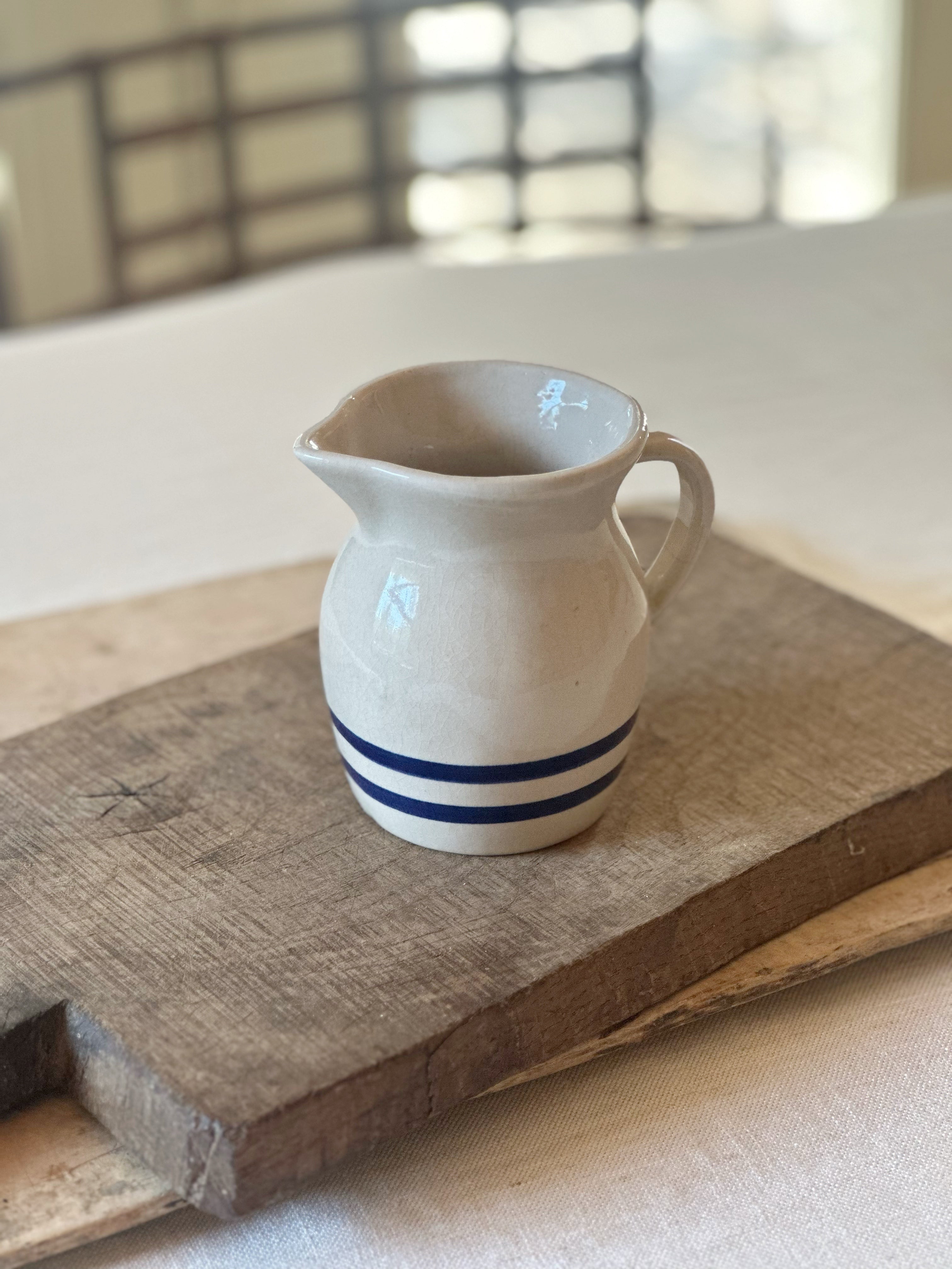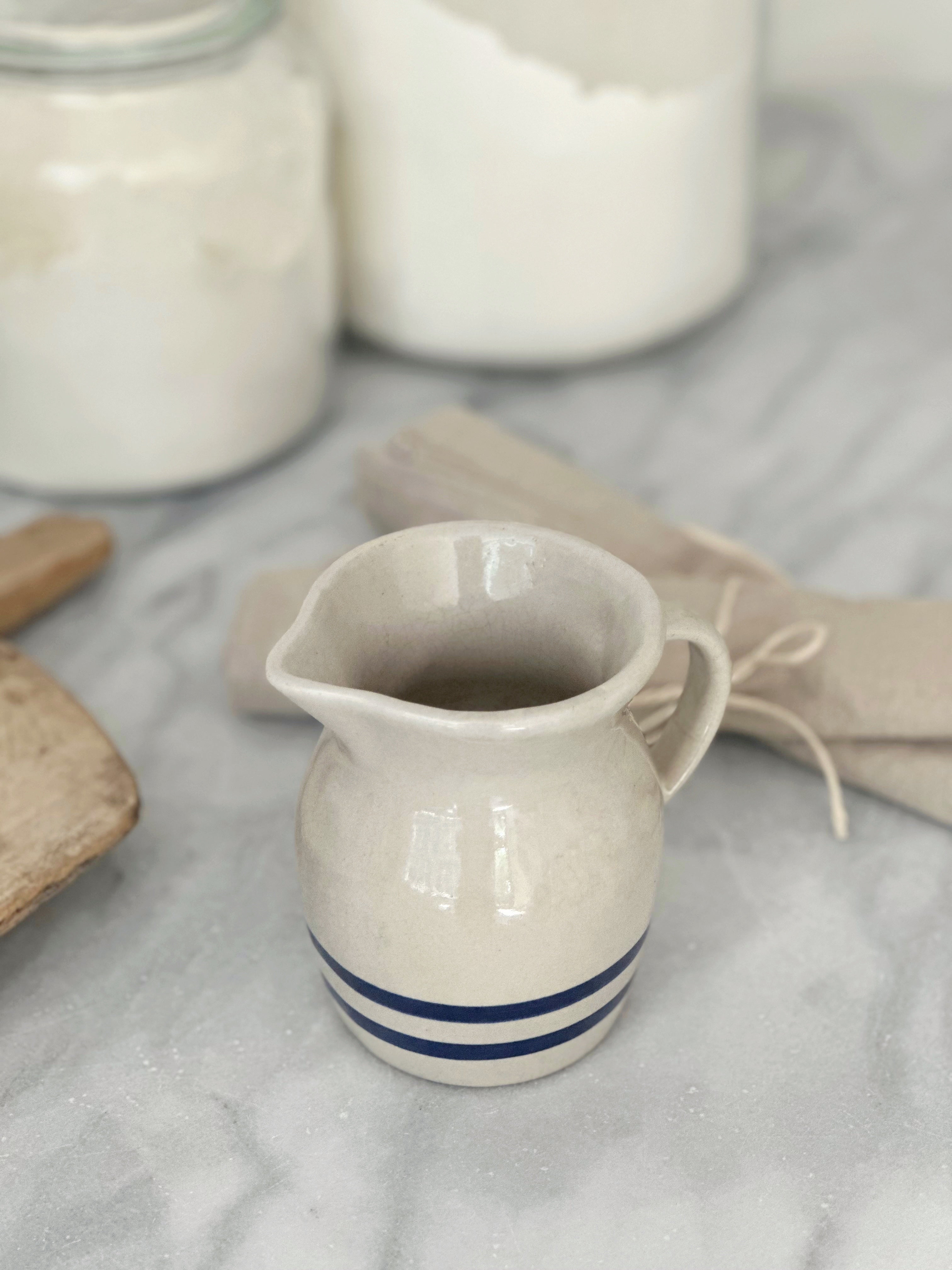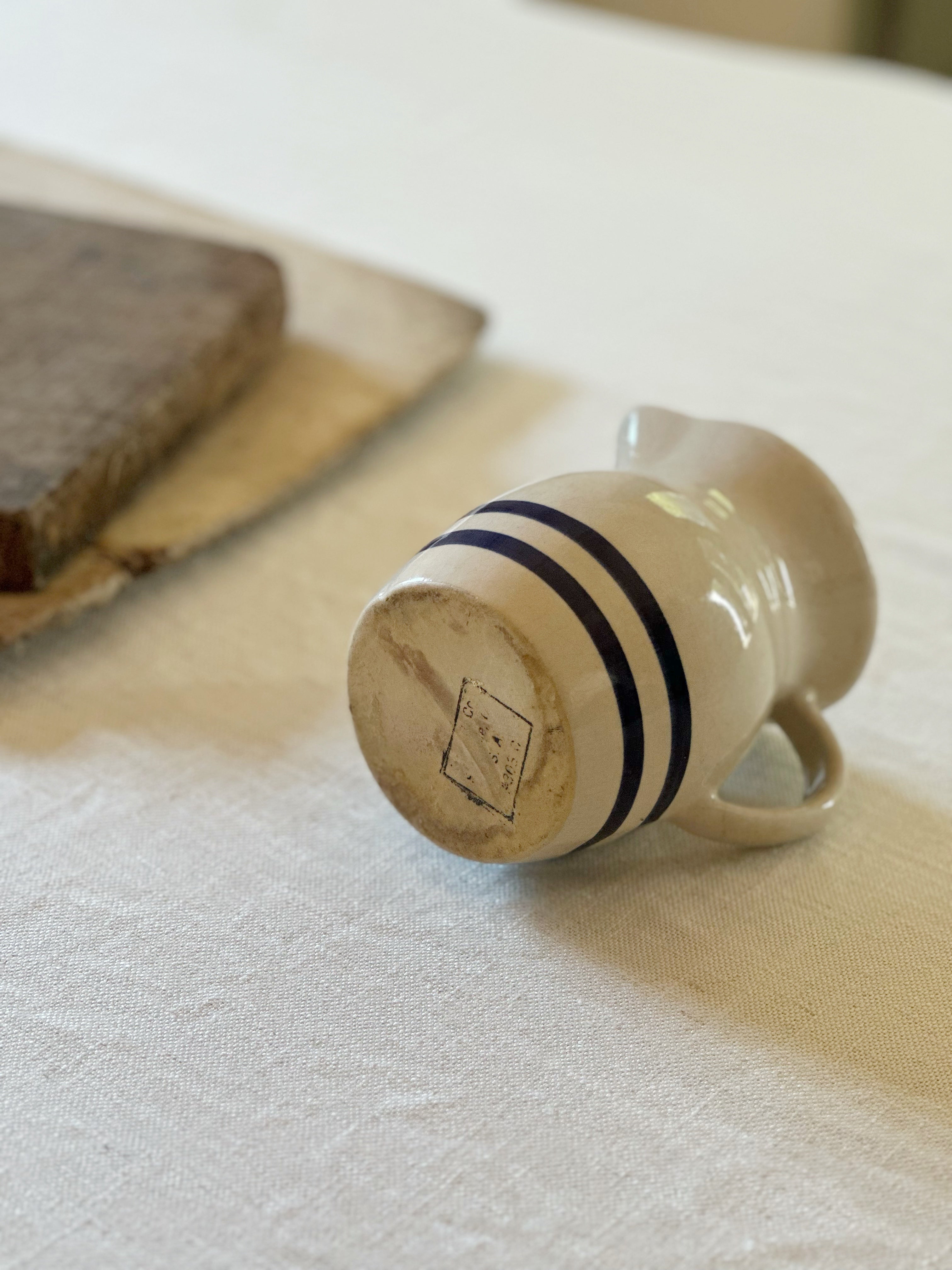 A timeless piece with quiet charm, this petite stoneware jug features classic double navy stripes and a soft ivory glaze with natural crackling throughout. Its gently curved silhouette and sturdy handle make it both functional and decorative—ideal for pouring, of course, but just as lovely holding a small bunch of garden blooms on your windowsill or breakfast table.