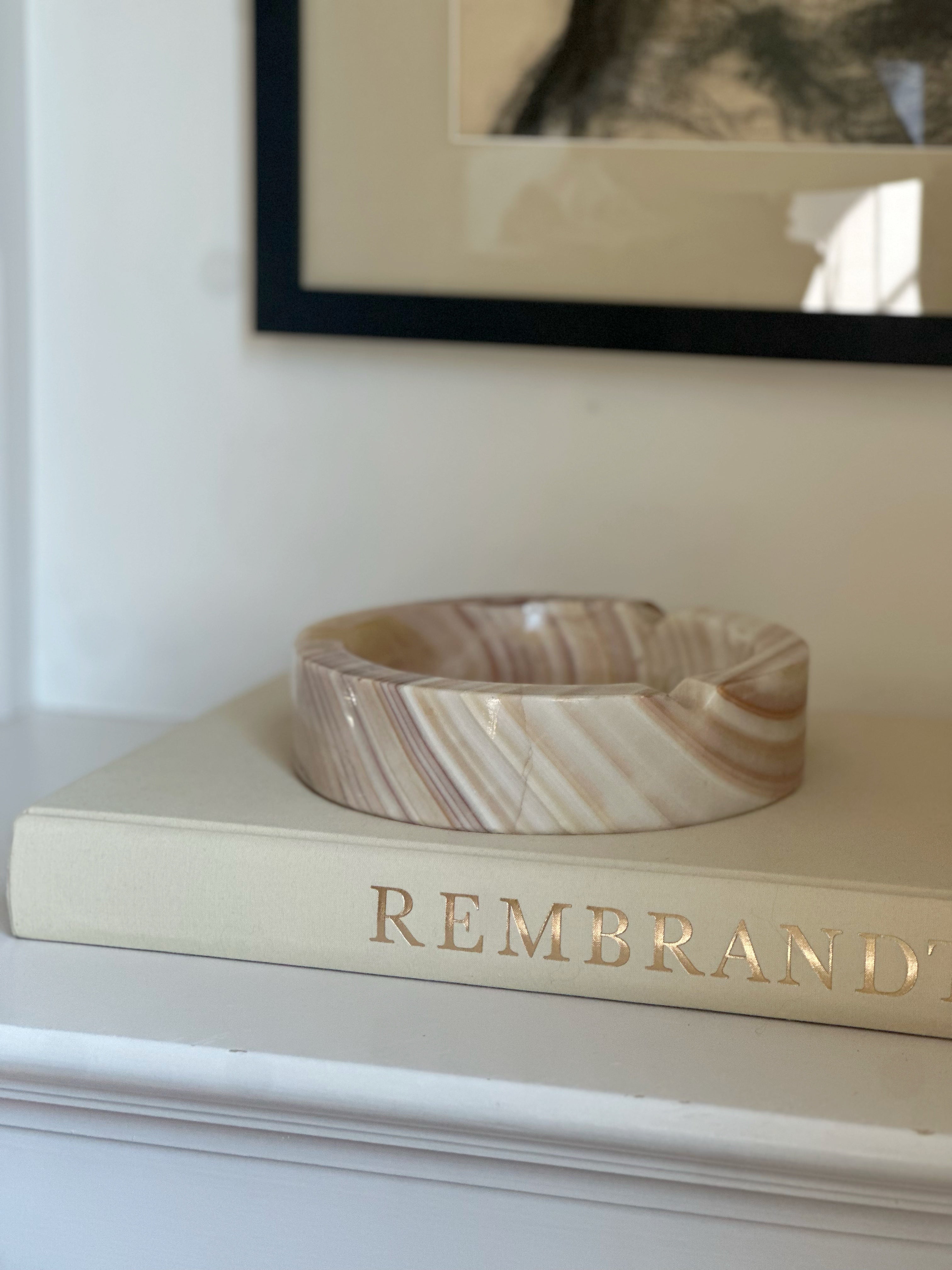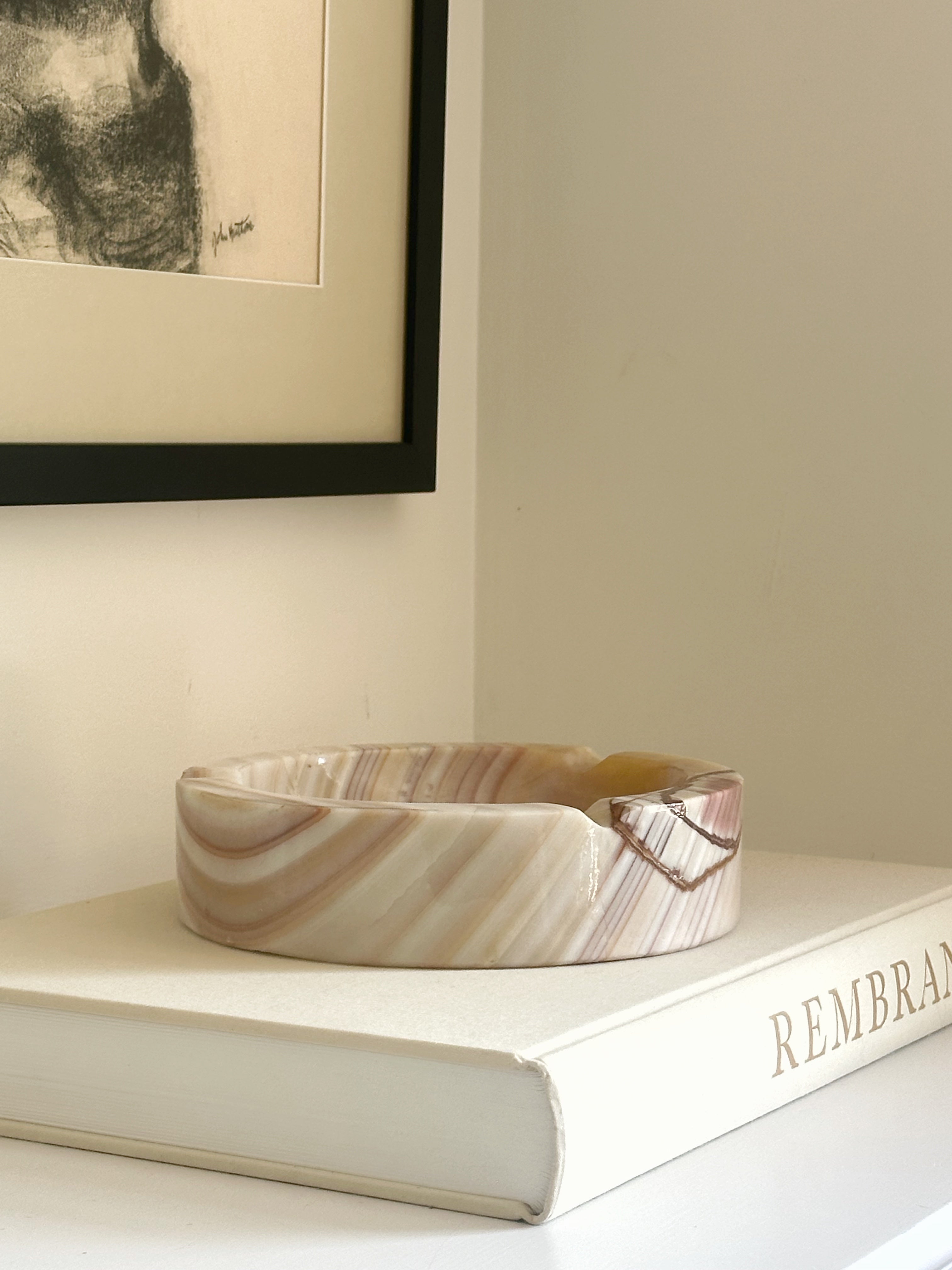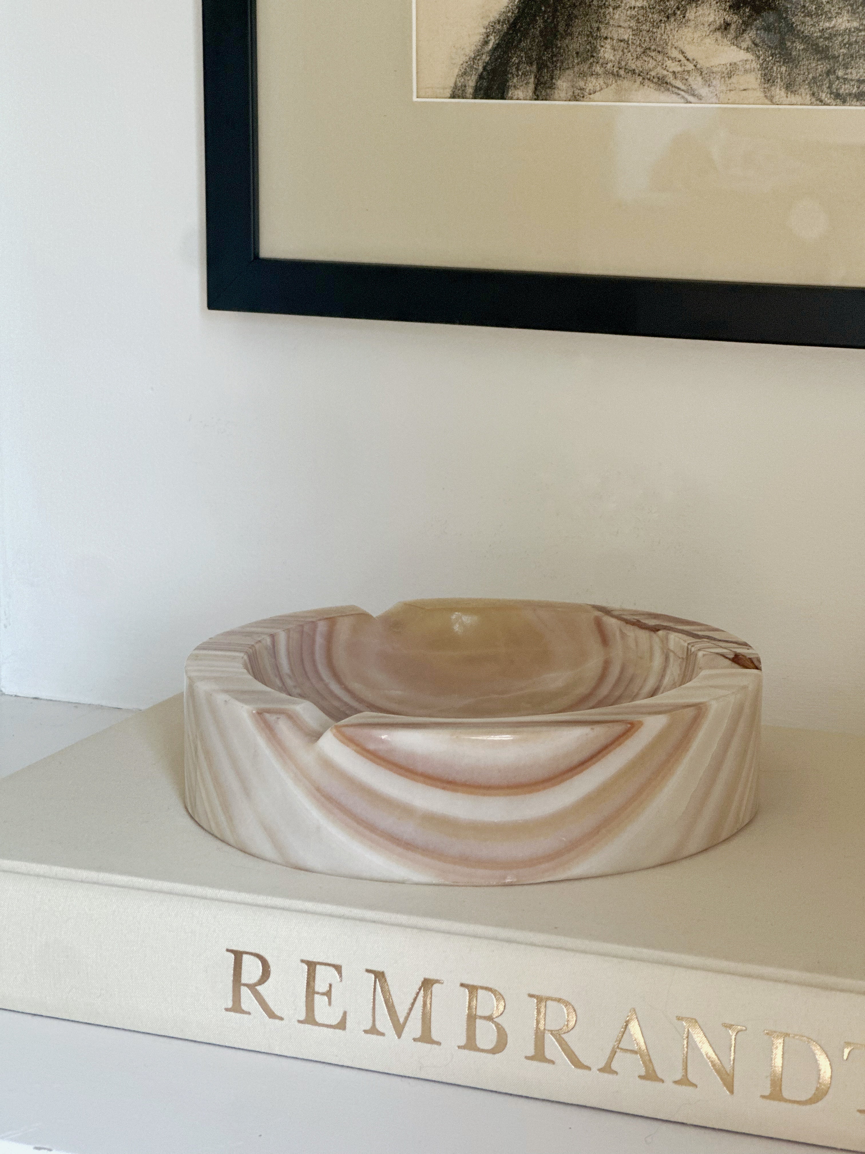 A beautifully sculpted vintage onyx catchall with soft swirls of cream, blush, and rust. The organic striping on this piece is especially striking—no two angles look quite the same, making it a truly one-of-a-kind find. Its large size makes it perfect for catching keys by the door, corralling jewelry on a nightstand, or simply adding an artful touch to your shelf or coffee table. A substantial piece with a substantial presence.