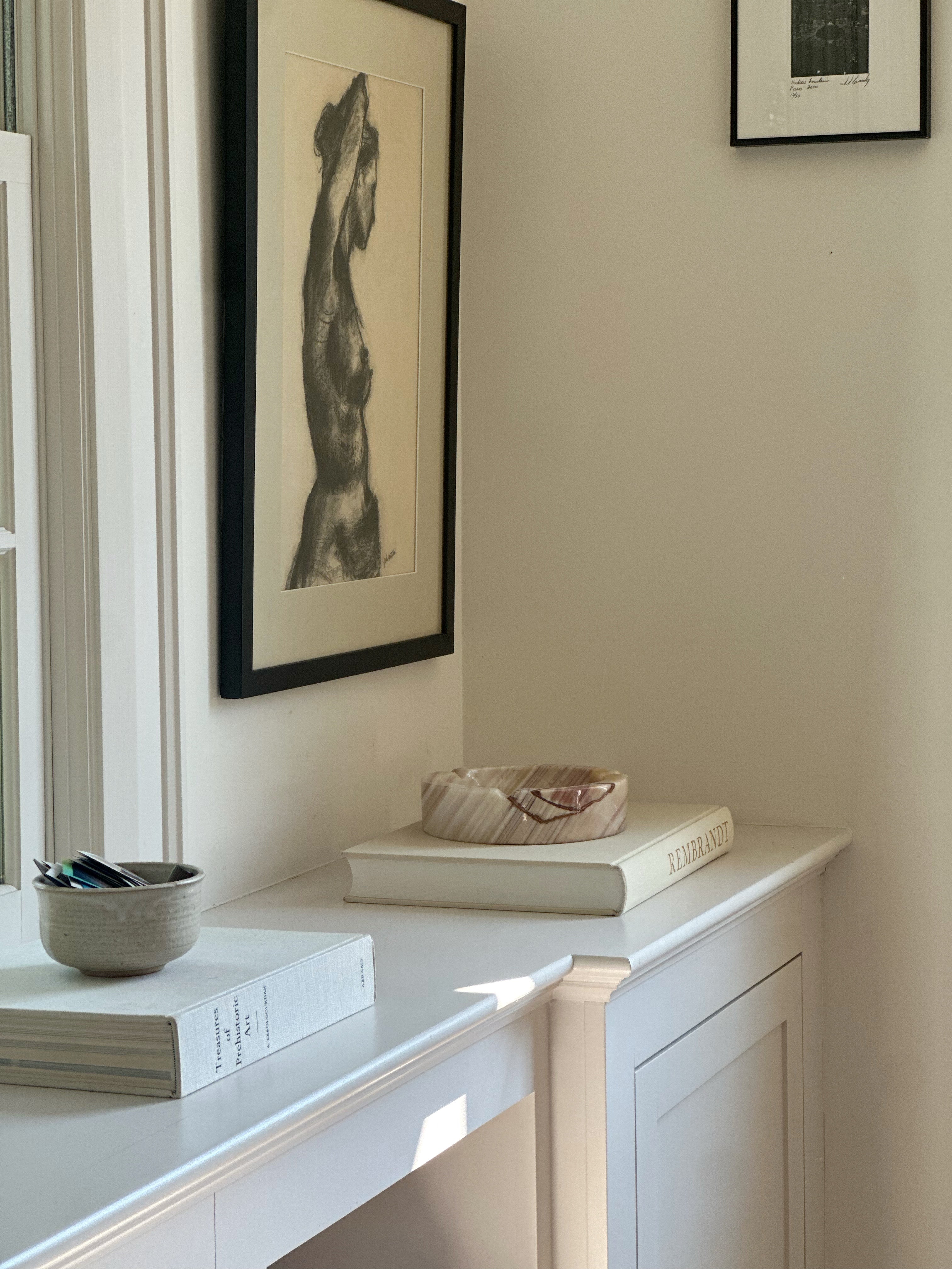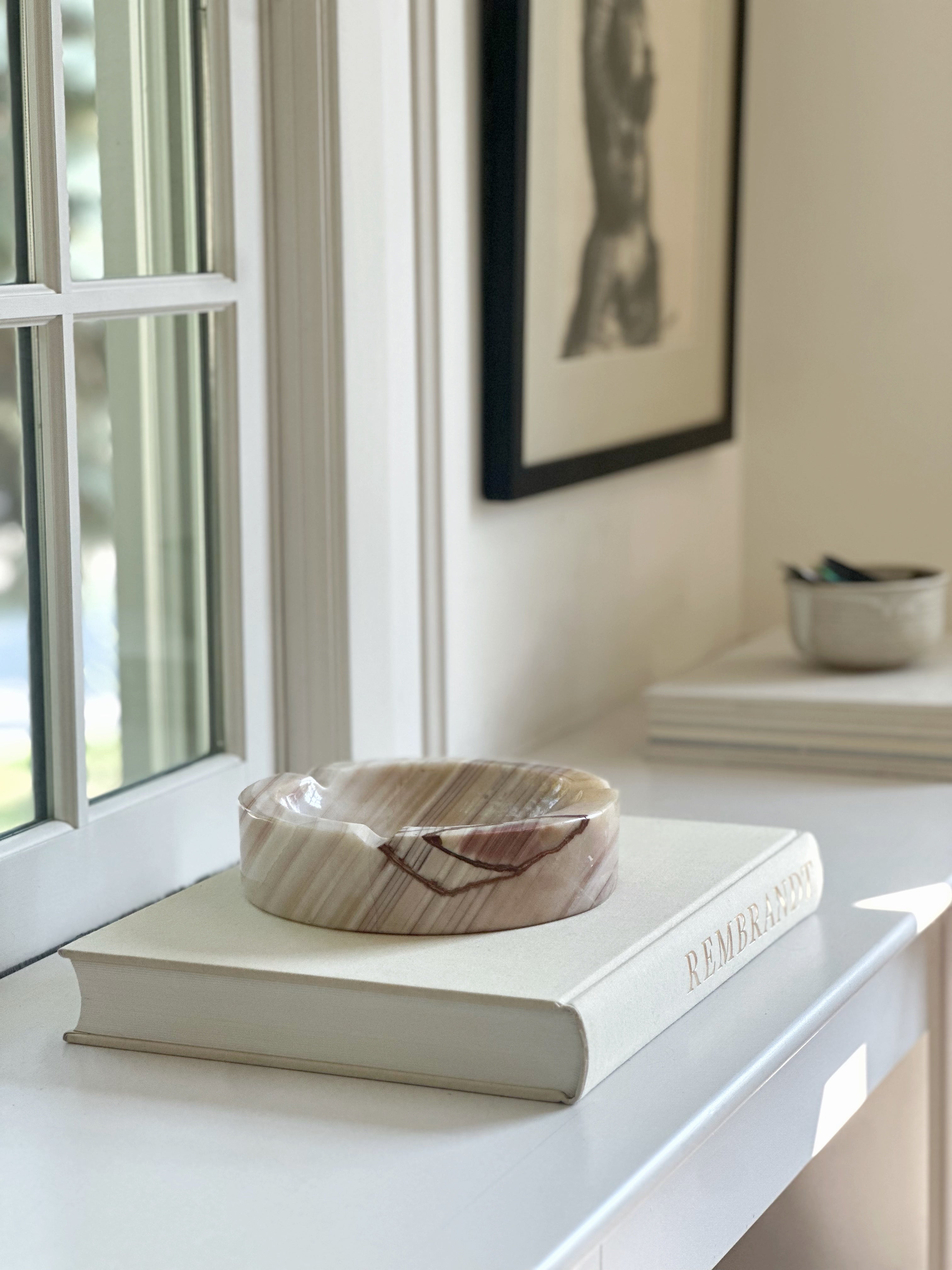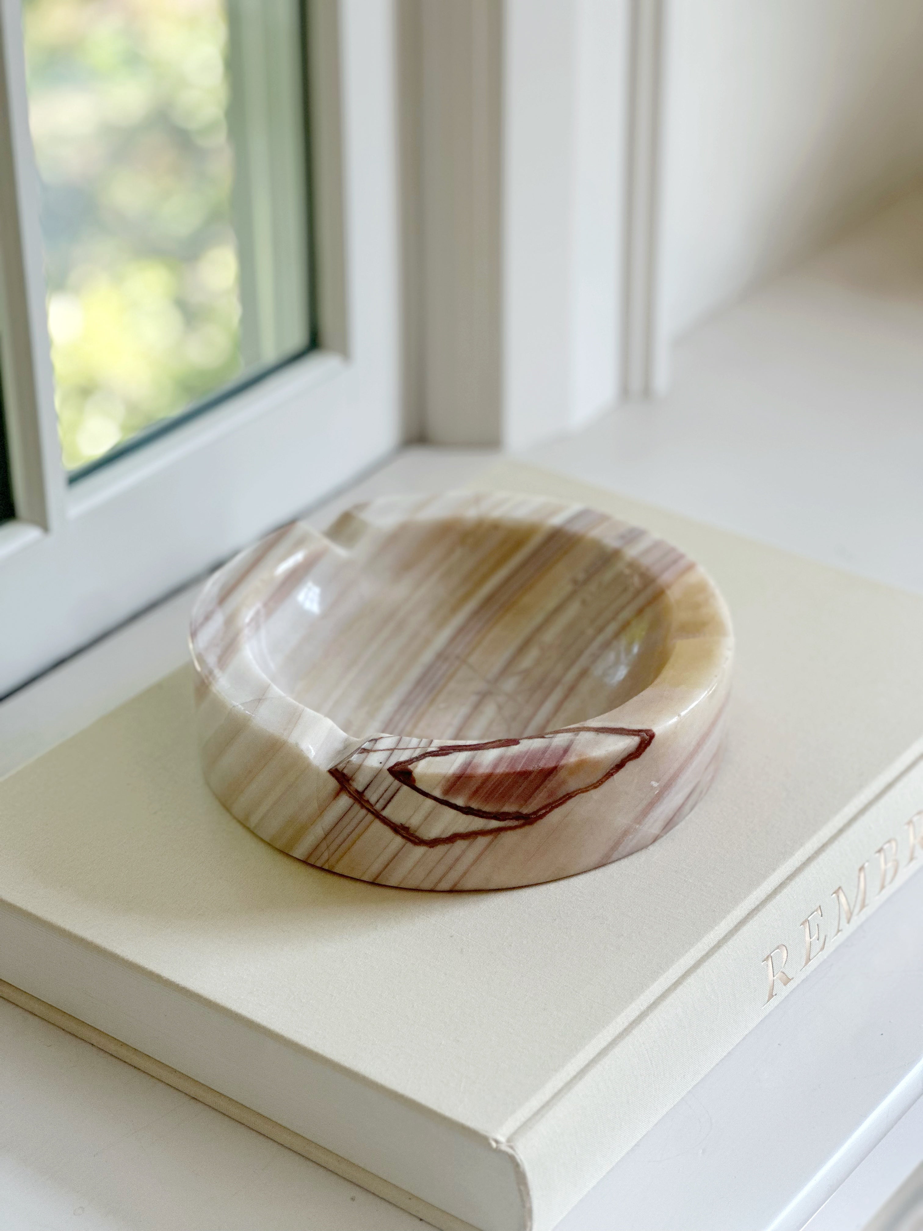 A beautifully sculpted vintage onyx catchall with soft swirls of cream, blush, and rust. The organic striping on this piece is especially striking—no two angles look quite the same, making it a truly one-of-a-kind find. Its large size makes it perfect for catching keys by the door, corralling jewelry on a nightstand, or simply adding an artful touch to your shelf or coffee table. A substantial piece with a substantial presence.